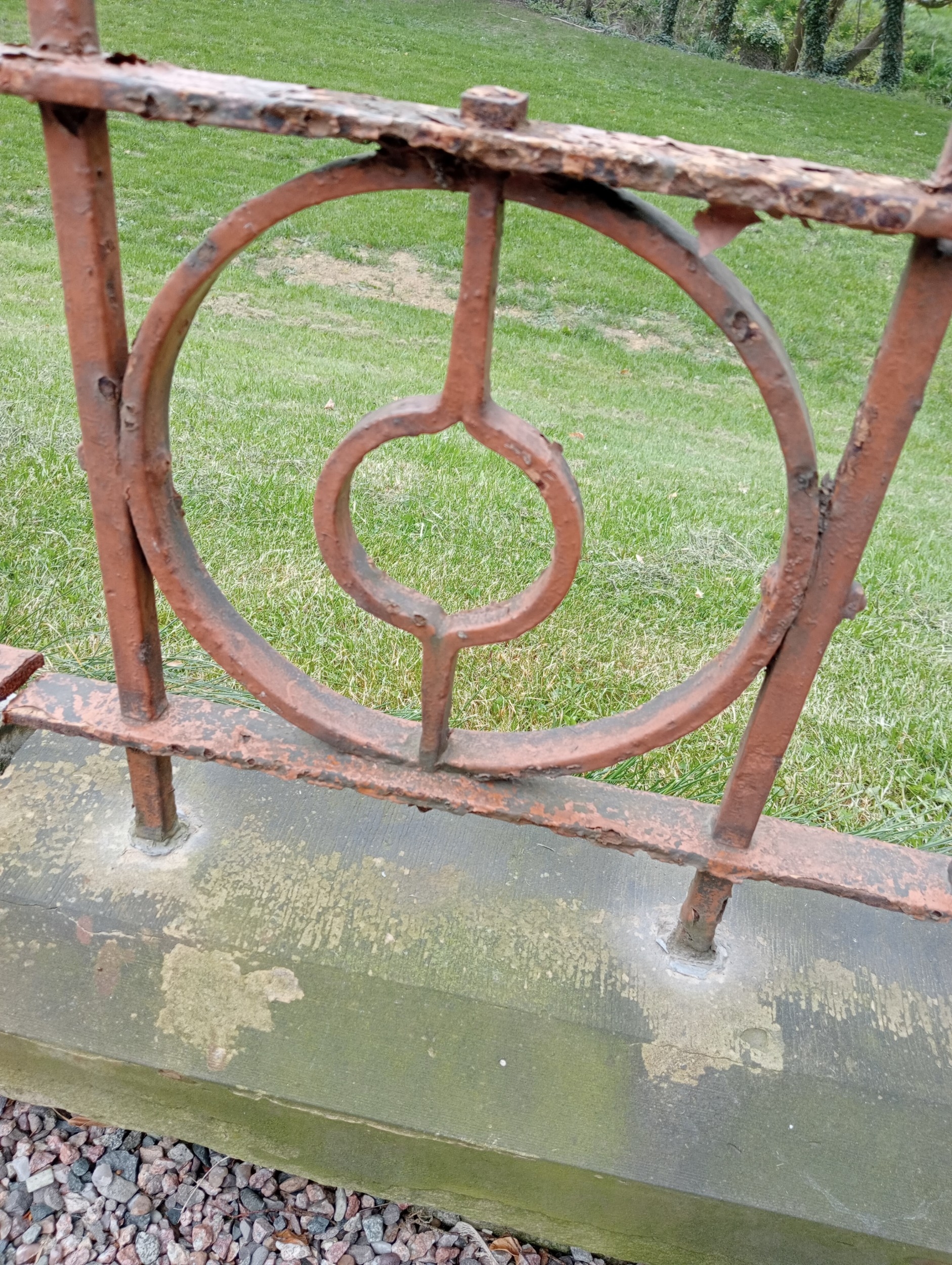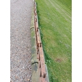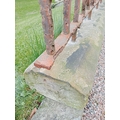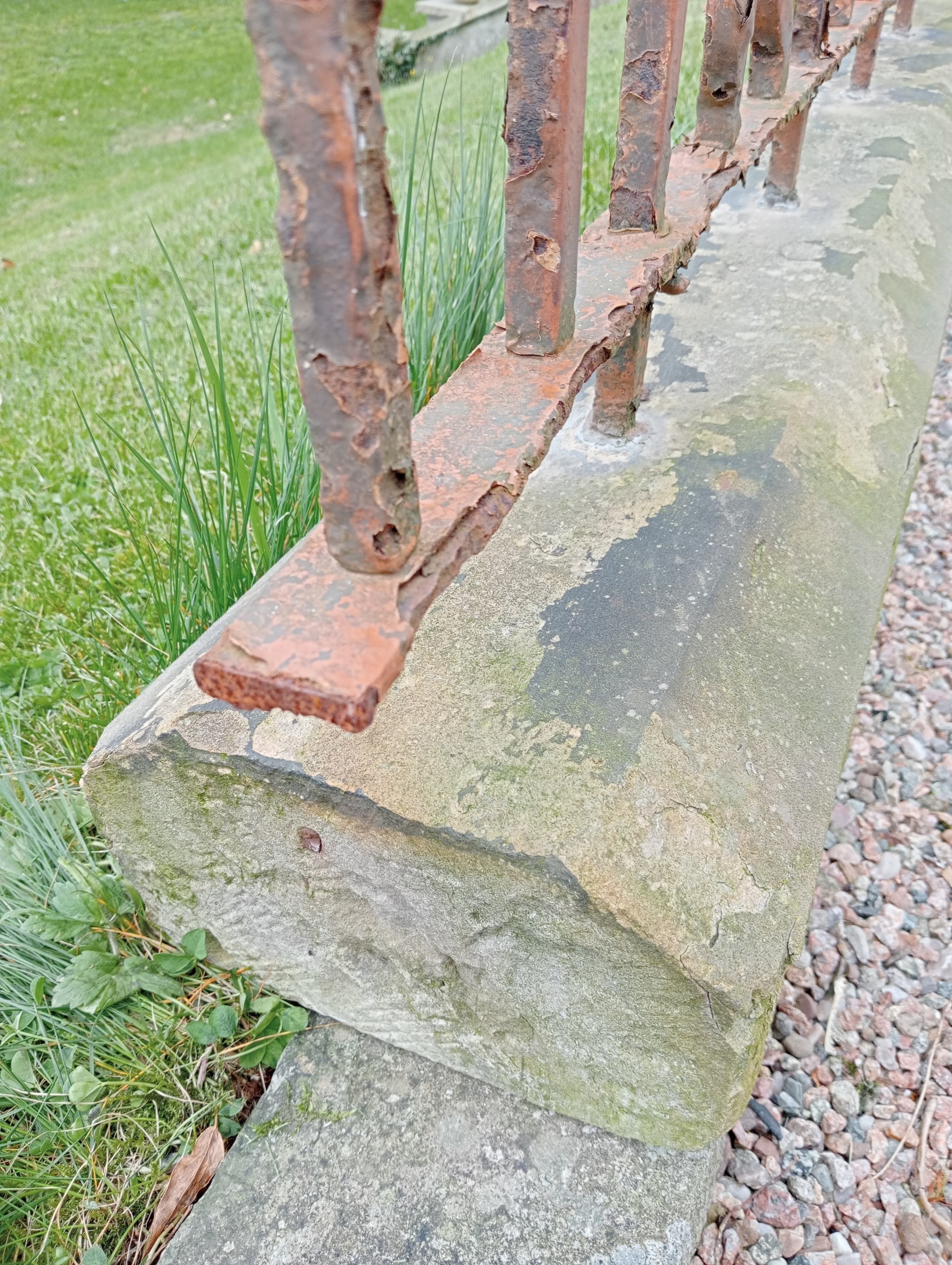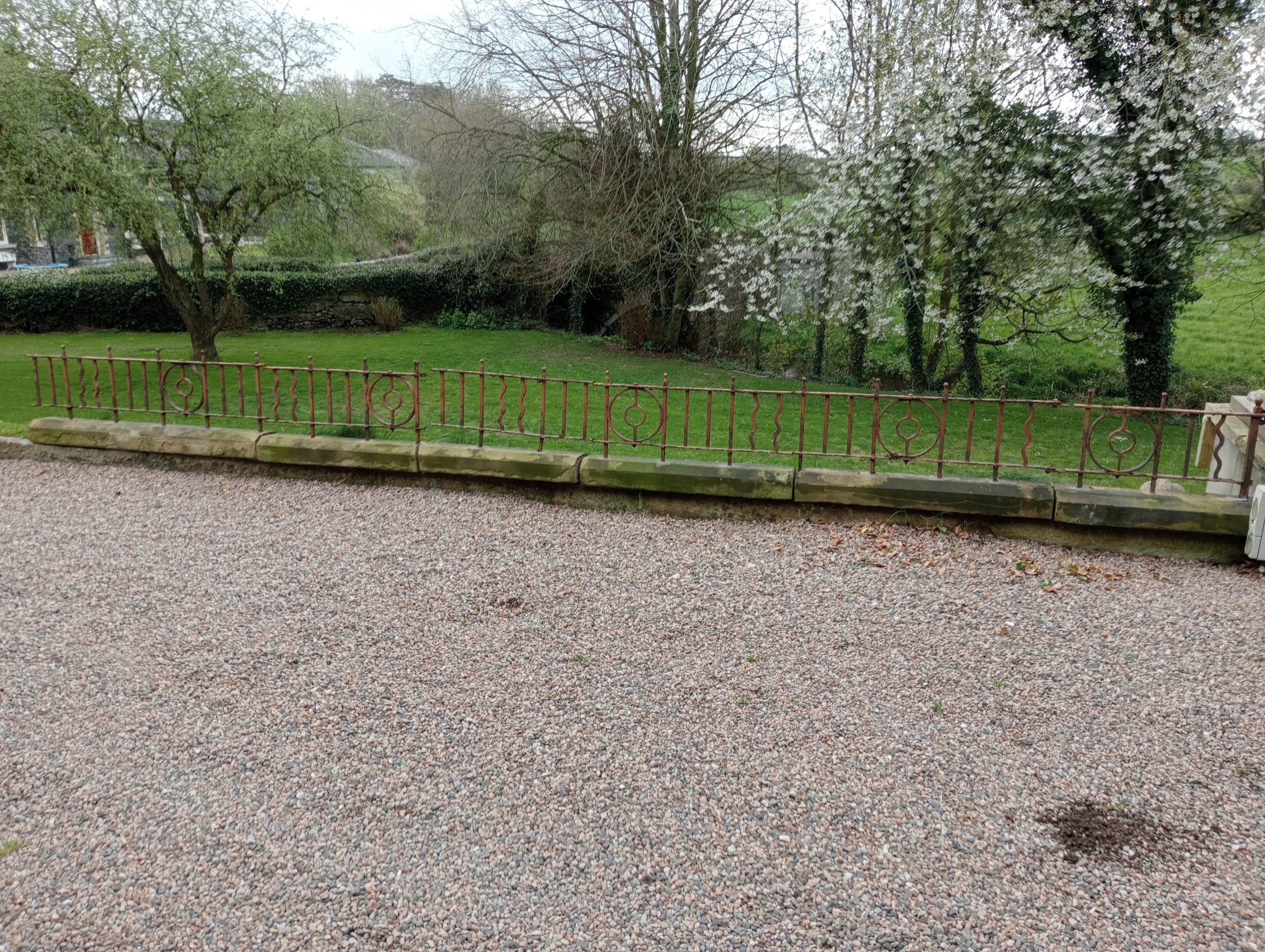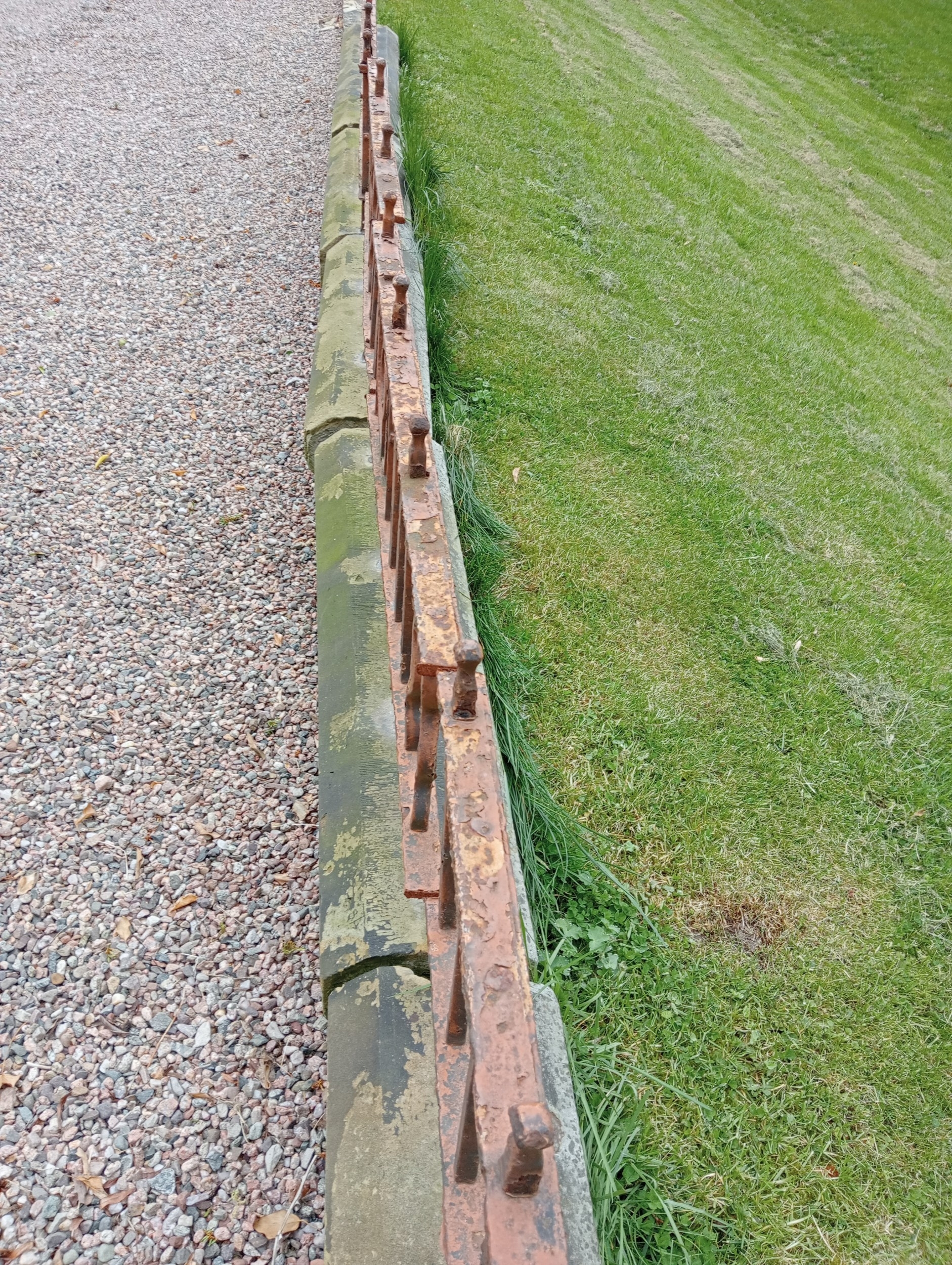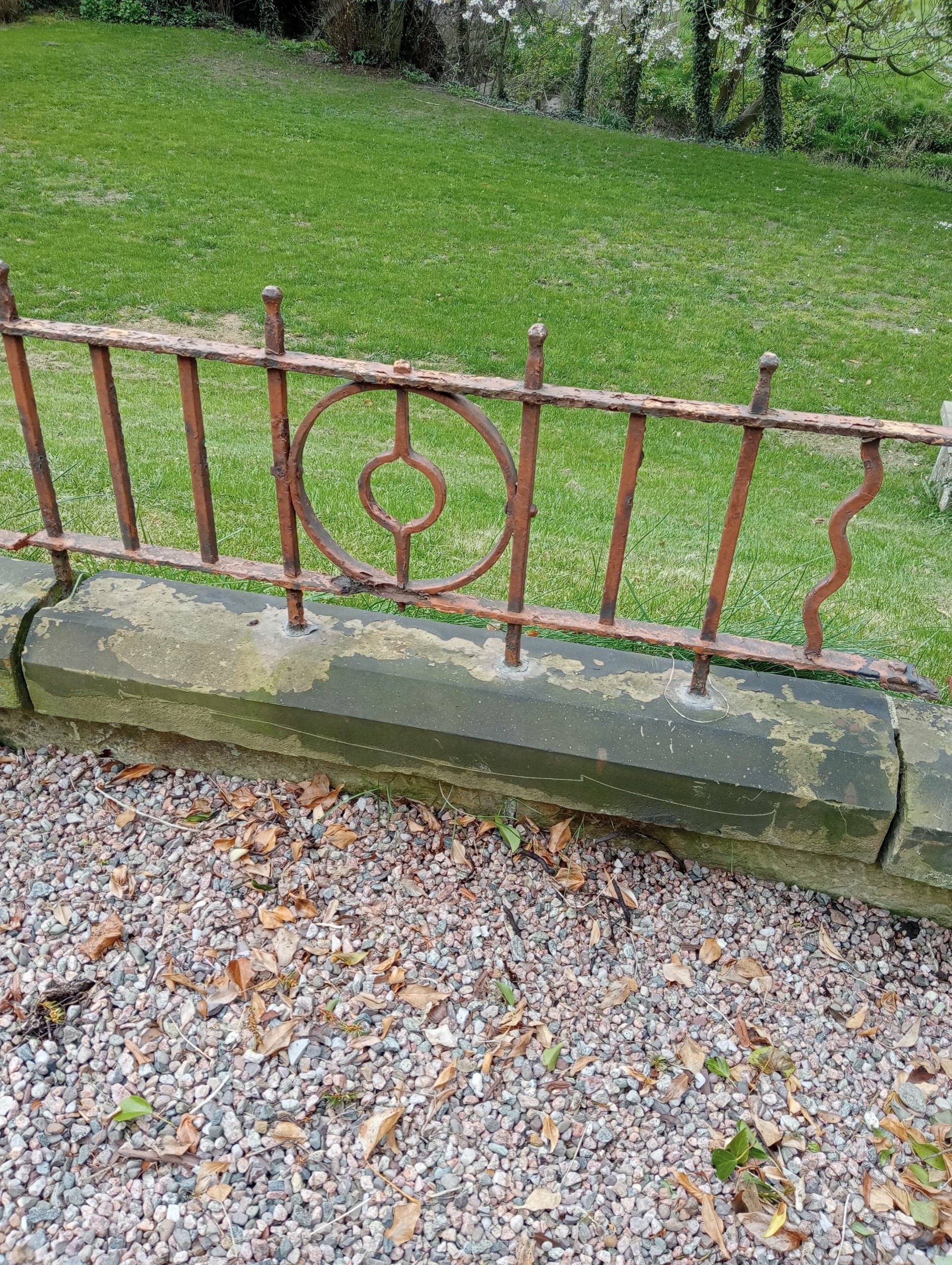 6.3 metre/ 21 foot run of blacksmith's wrought iron patio railings mounted on sandstone base { 56cmH X 630cmL X 23cmD }. NOT AVAILABLE TO VIEW IN PERSON