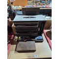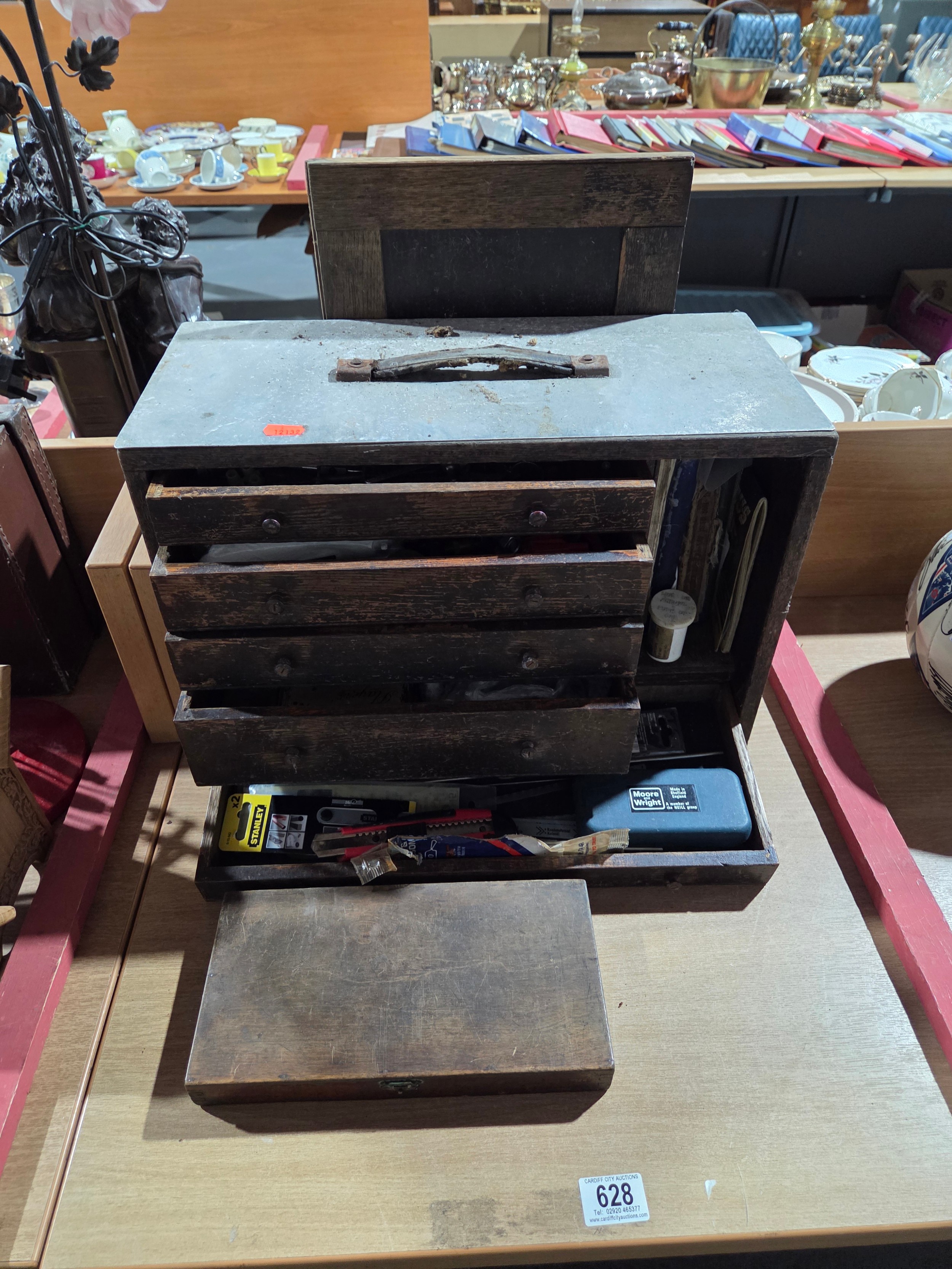 A wooden engineer's toolbox with contents