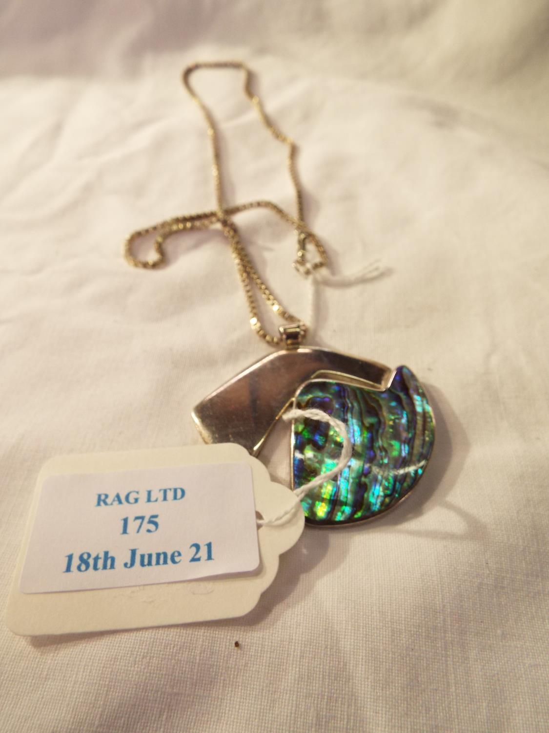 A silver necklace and pendant inset with New Zealand abalone Pupa shell