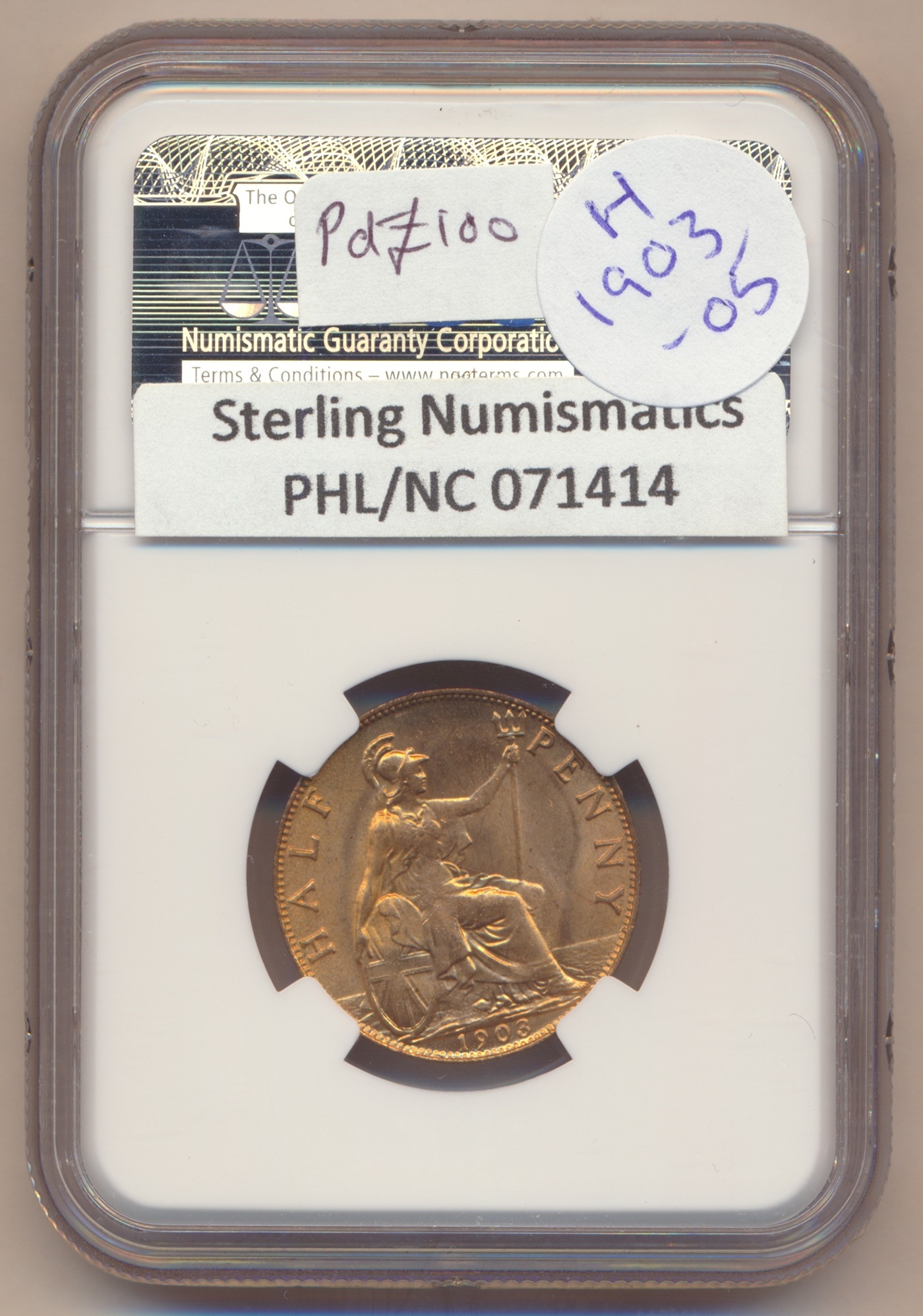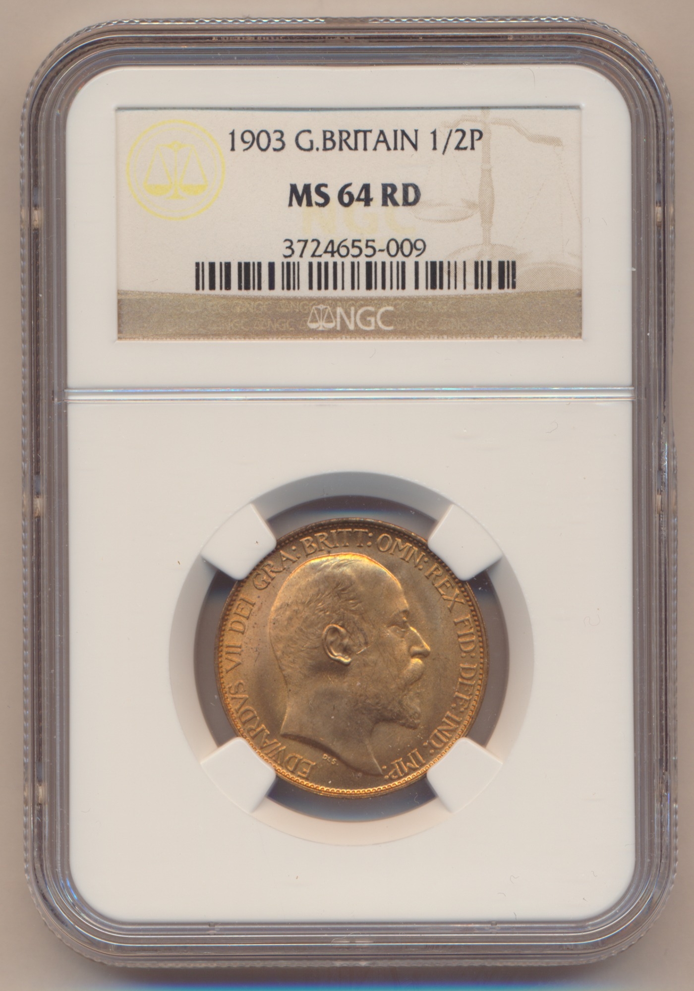 Edward VII range of half pennies in plastic holders with NGC 1902 MS65RB, 1903 MS64RD, 1904 MS64RB, 1907 MS64RB and CGS UK 1909 UNC80. Qty 5 (R)