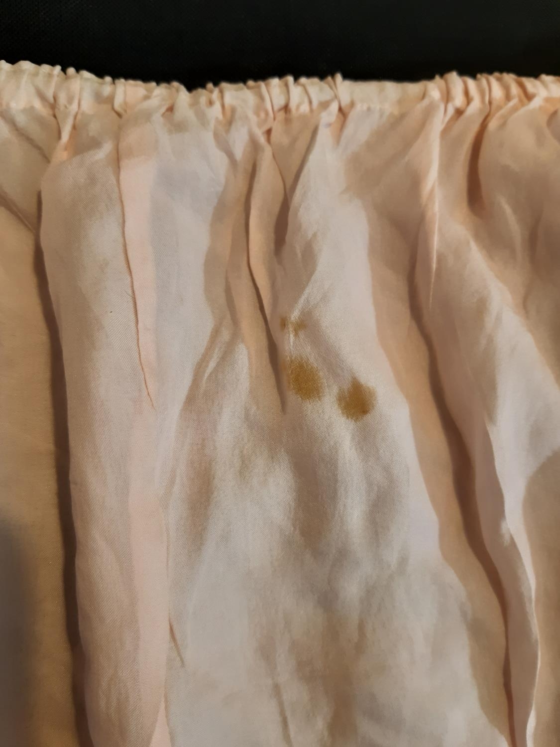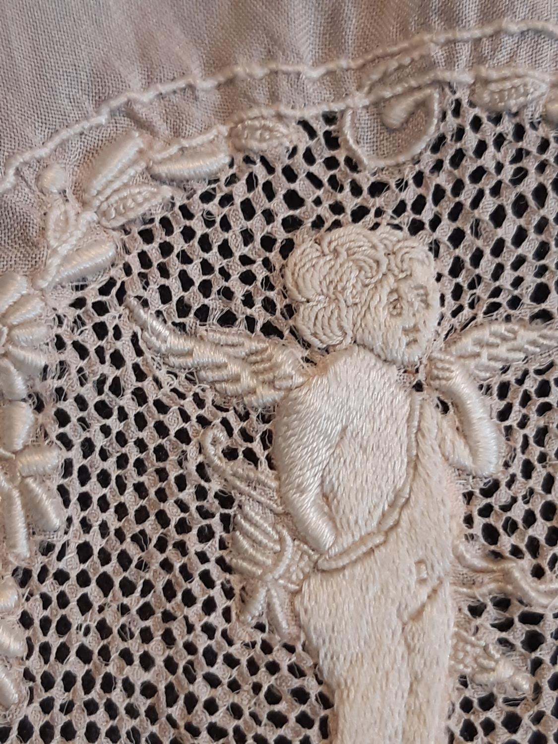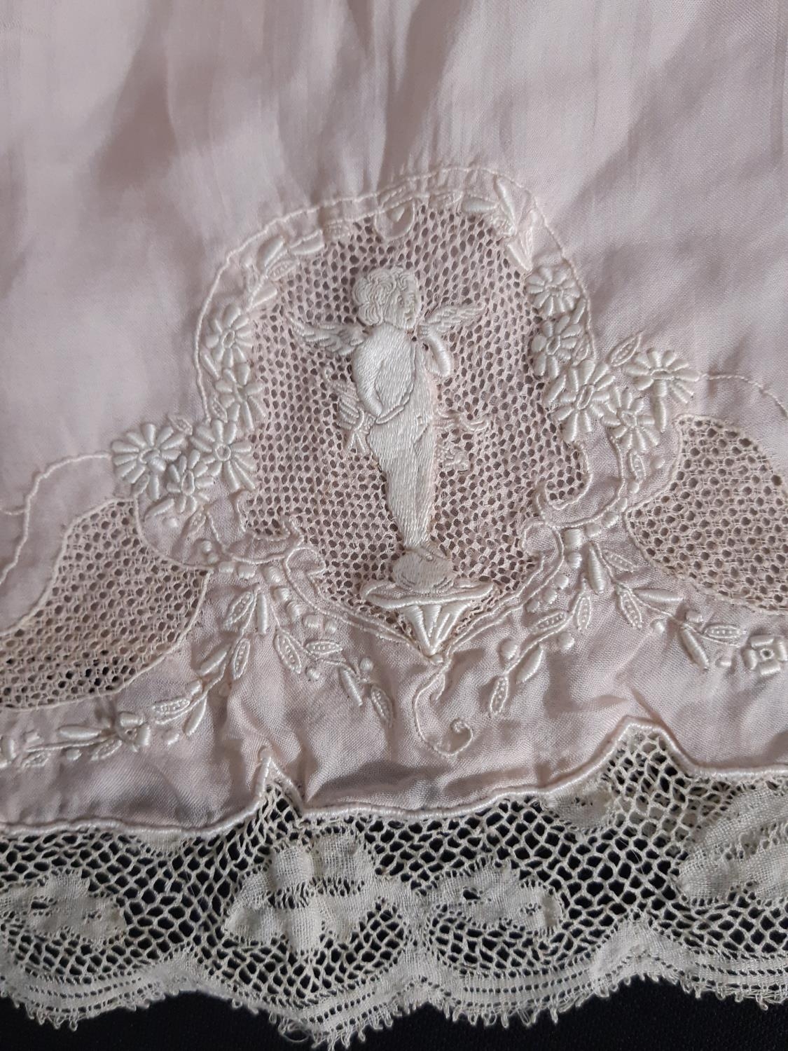 An impressive pair of vintage knickers in pale pink silk, trimmed with 19th century Flanders lace and embroidered on each leg with Cupid figures on a background of fine pulled threadwork. Width across waist when elastic is relaxed- 40cm