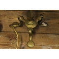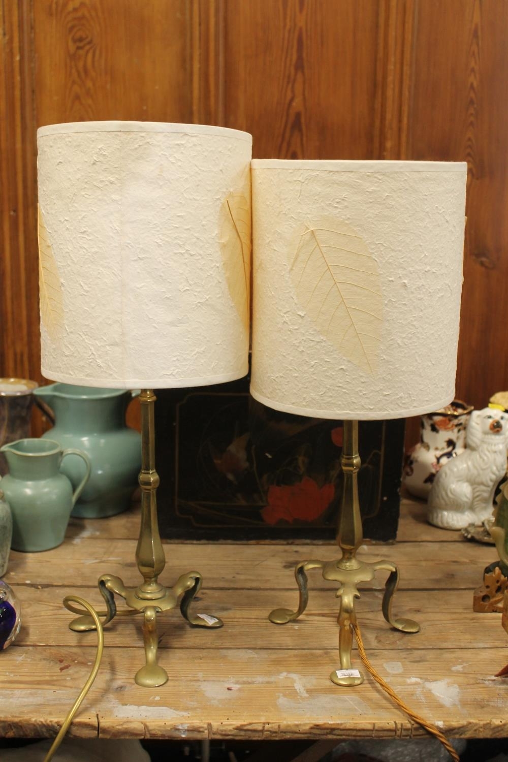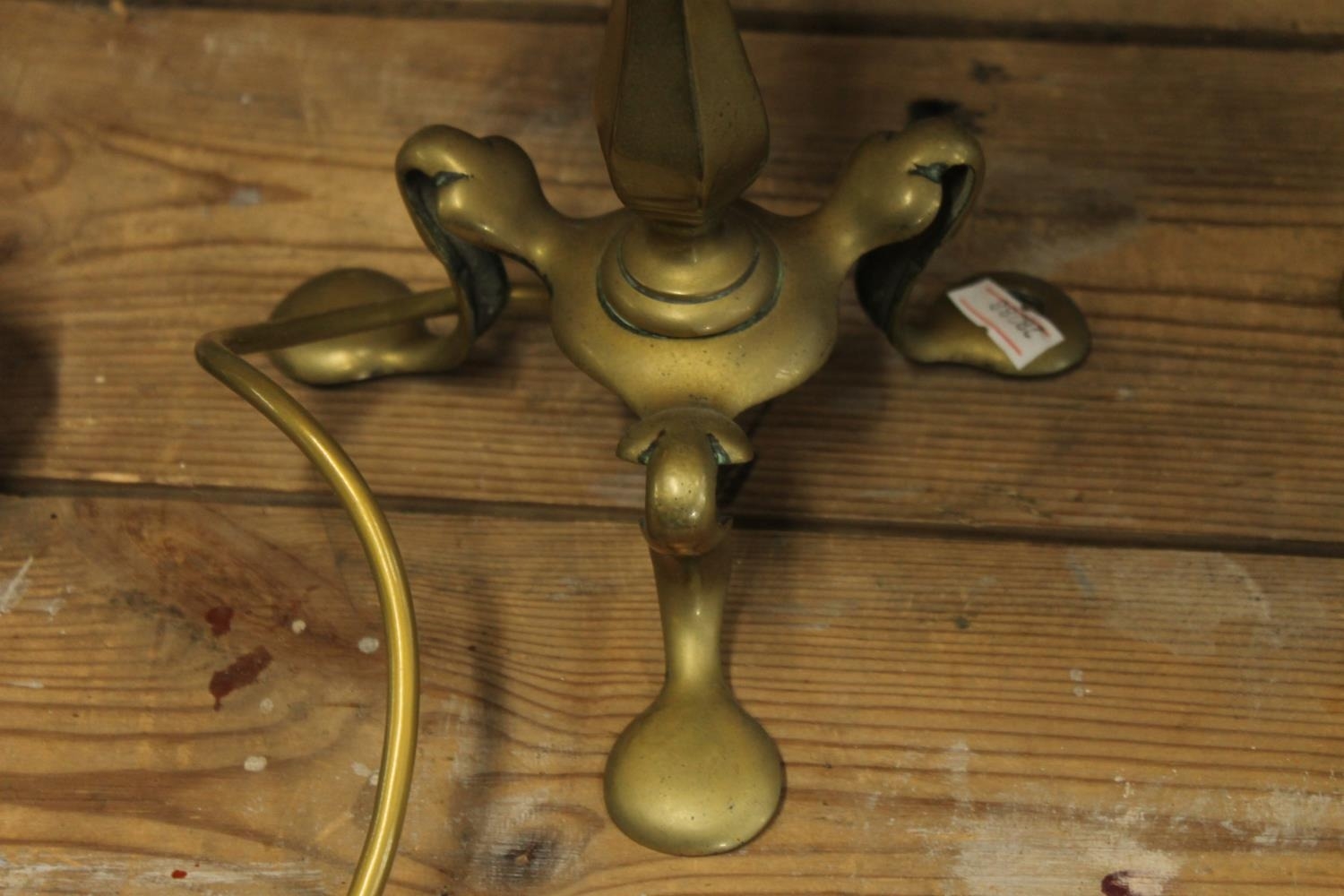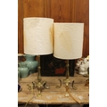 Near pair of brass Art Nouveau style table lamp bases with modern shades.