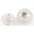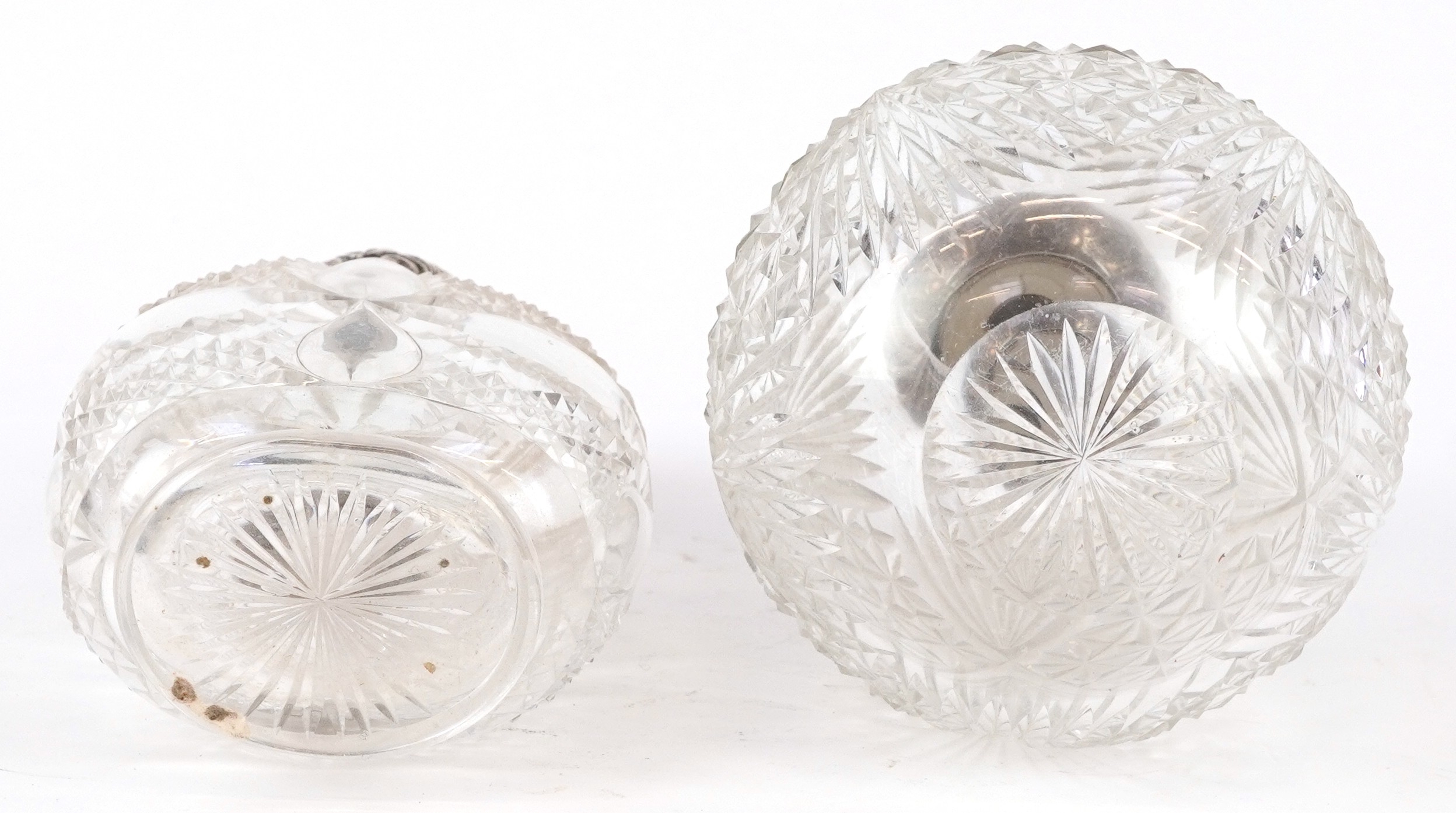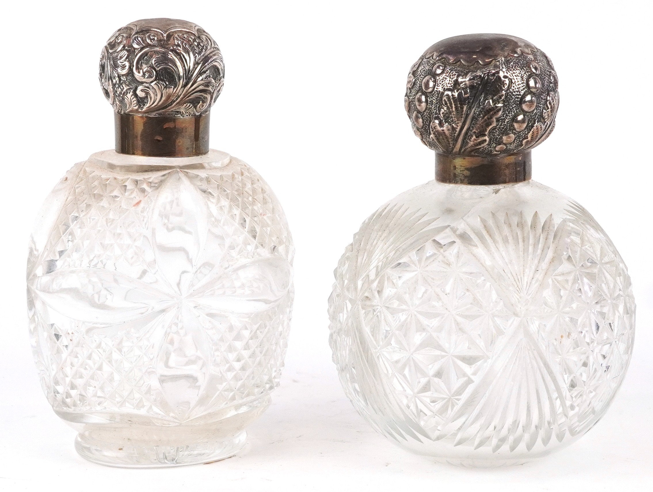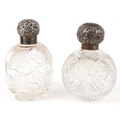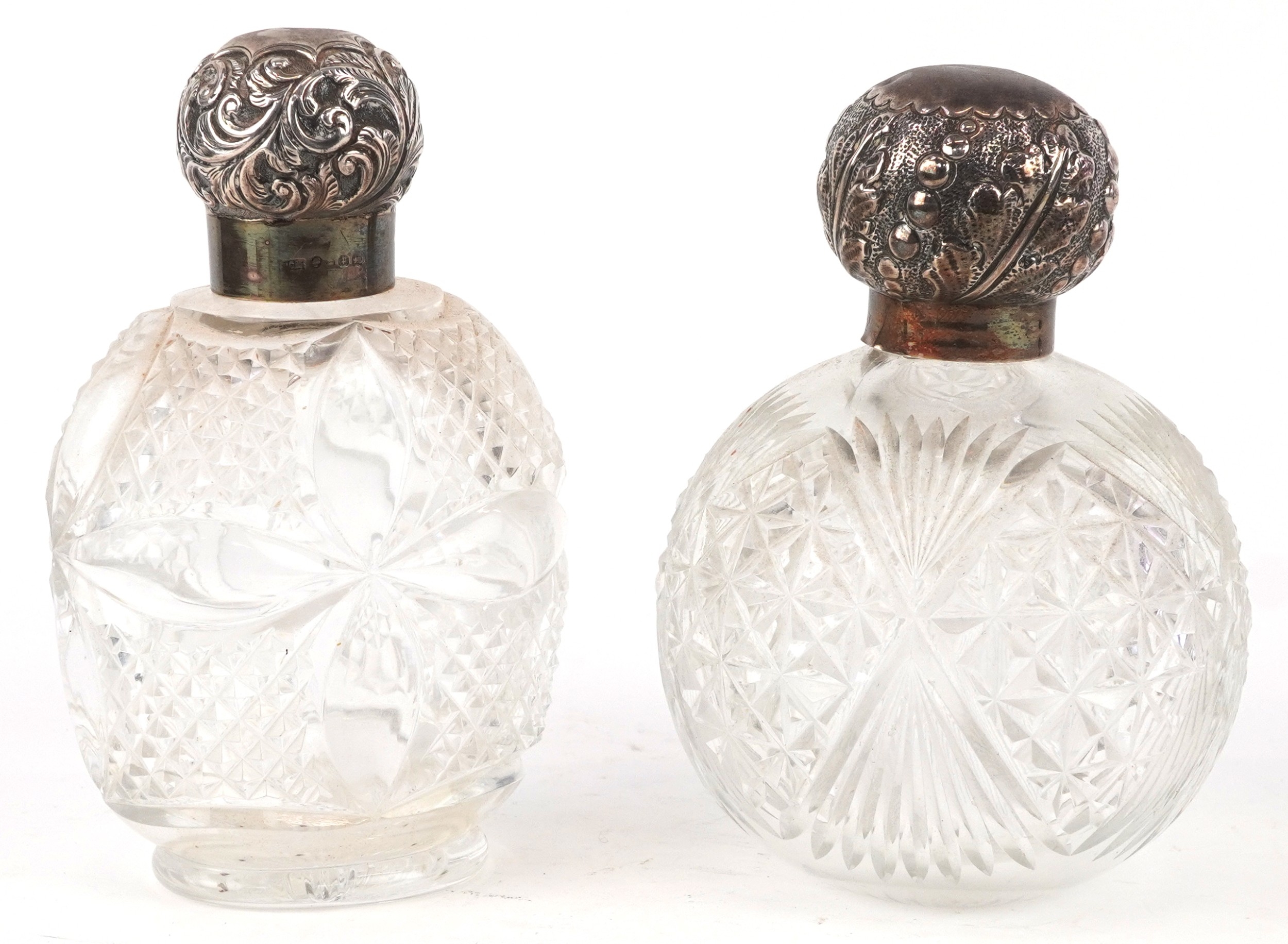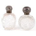 Two Victorian cut glass scent bottles with embossed silver lids, the largest 14cm high.