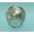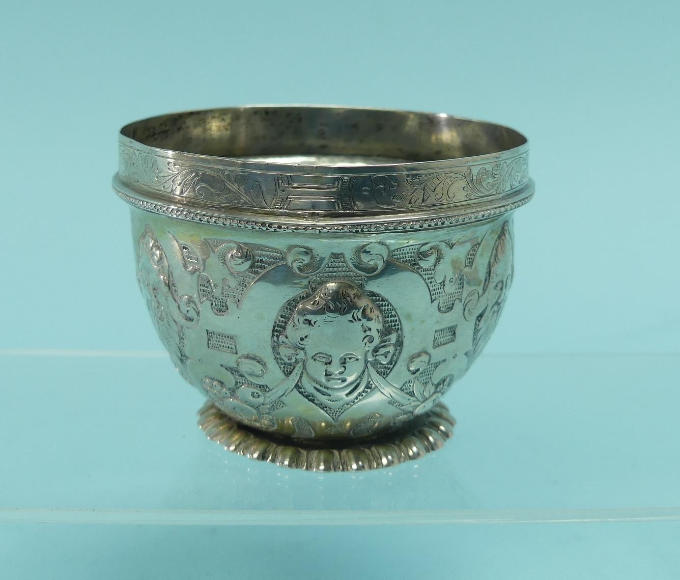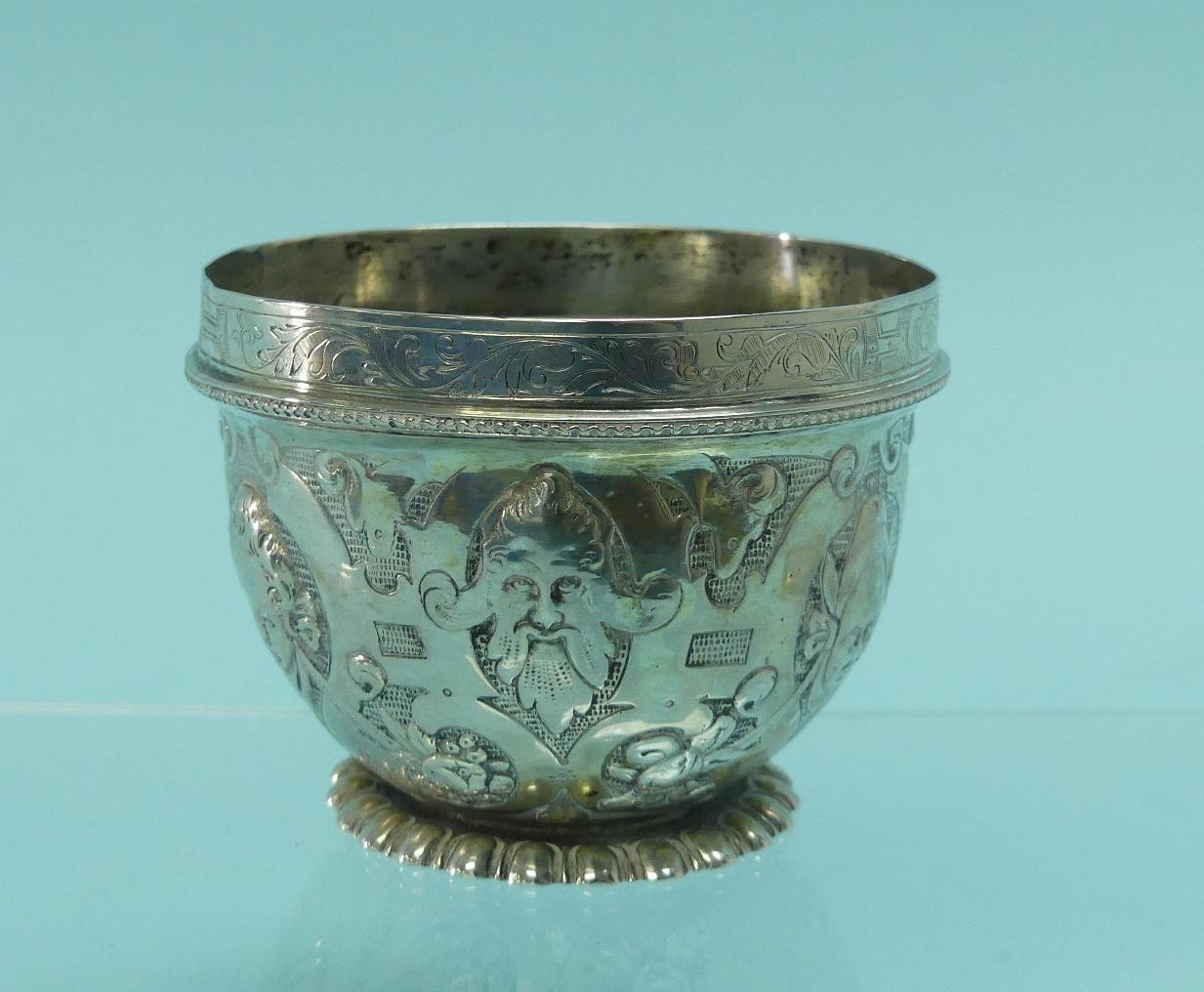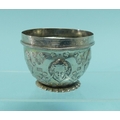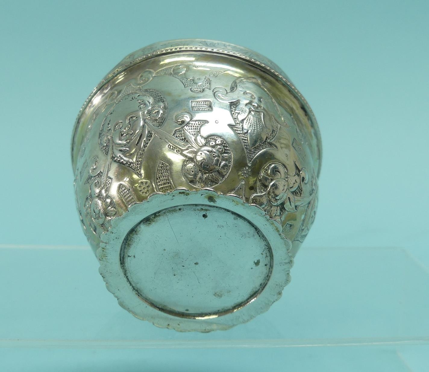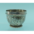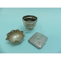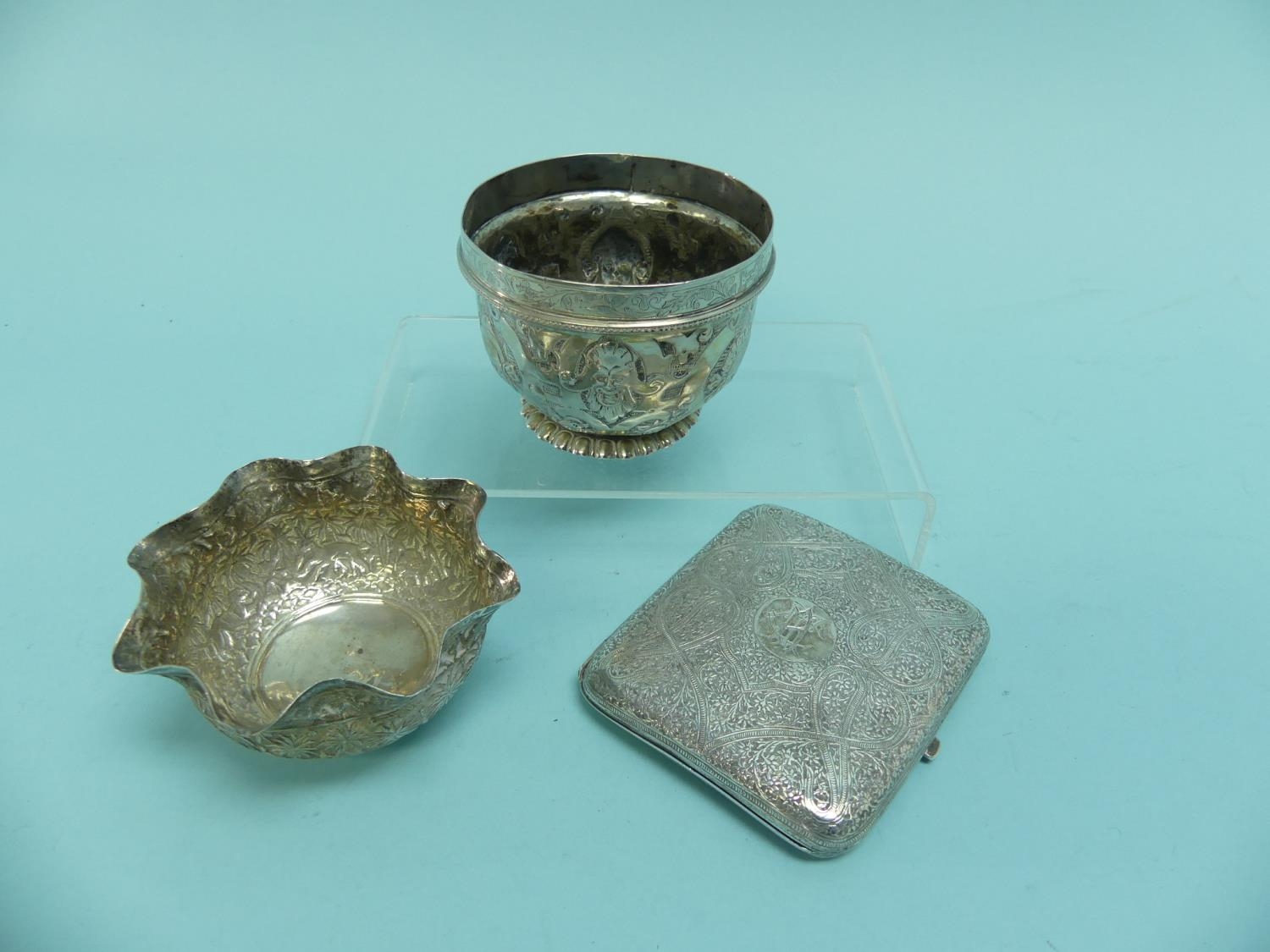 An unmarked Indian silver Bowl, with wavy rim, the whole chased with animals amongst trees, 3½in (9cm) diameter, together with an unmarked silver bowl on gadrooned foot, embossed with masks with a foliate engraved rim, 3¼in (8.3cm) diameter, and an unmarked white metal cigarette case with foliate engraved decoration (3)