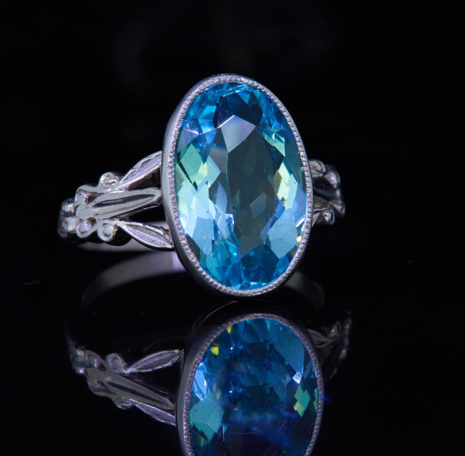 AQUAMARINE DRESS RING, set with a central oval aquamarine of approx. 5.60 ct. With openwork scrolling shoulders. Size O. 7.3 grams.