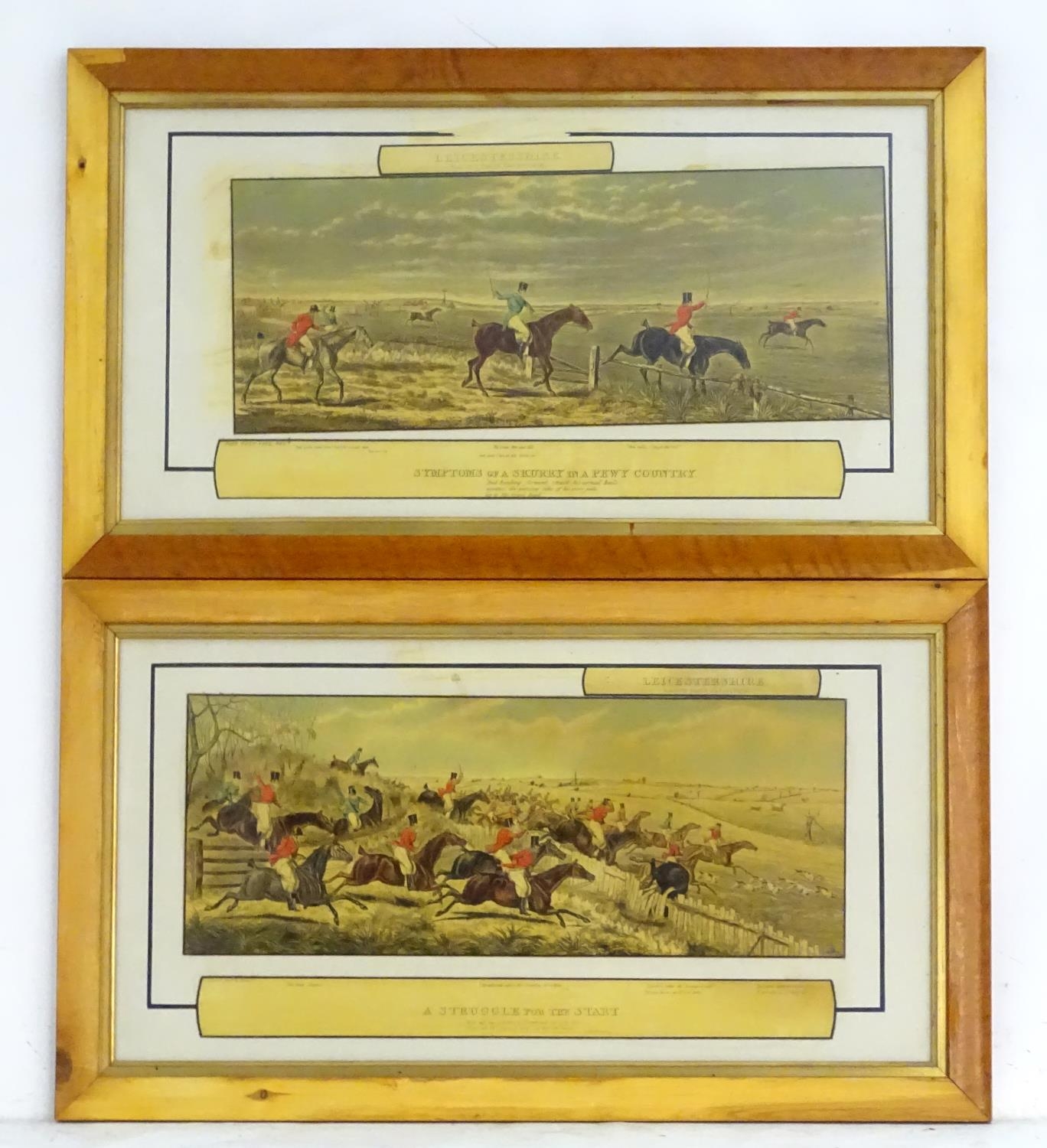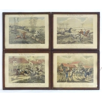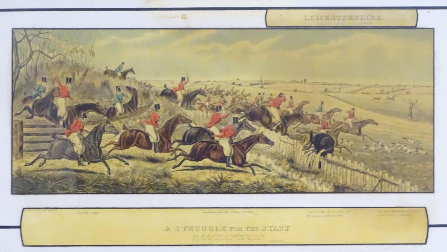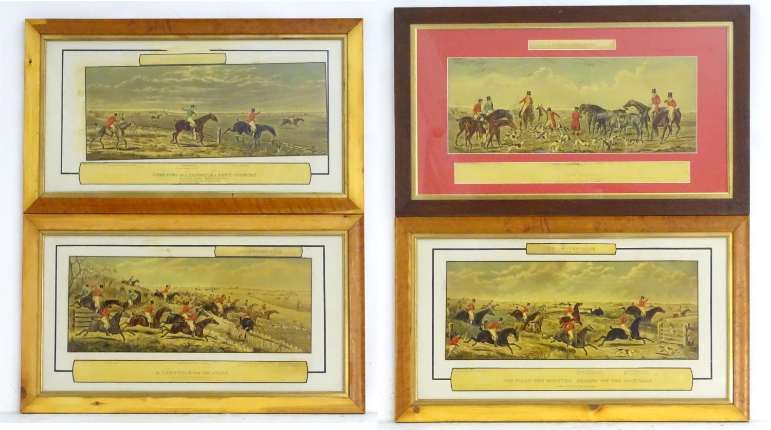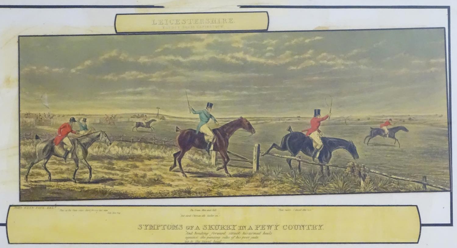 After John Dean Paul (1775-1852), Hand coloured hunting engravings, A Struggle for the Start, The First Ten Minutes - Shaking Off the Cocktails, Symptoms of a Skurry in a Pewy Country, and The Death, from the Leicestershire - Gaudet Equis Canibusque. Depicting four stages of a hunt, depicting horses, figures in hunting pinks, hounds, etc. Titled with information under. Each approx. 8 1/2" x 22" (4)