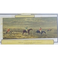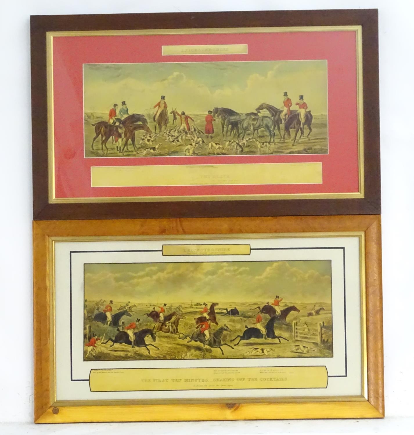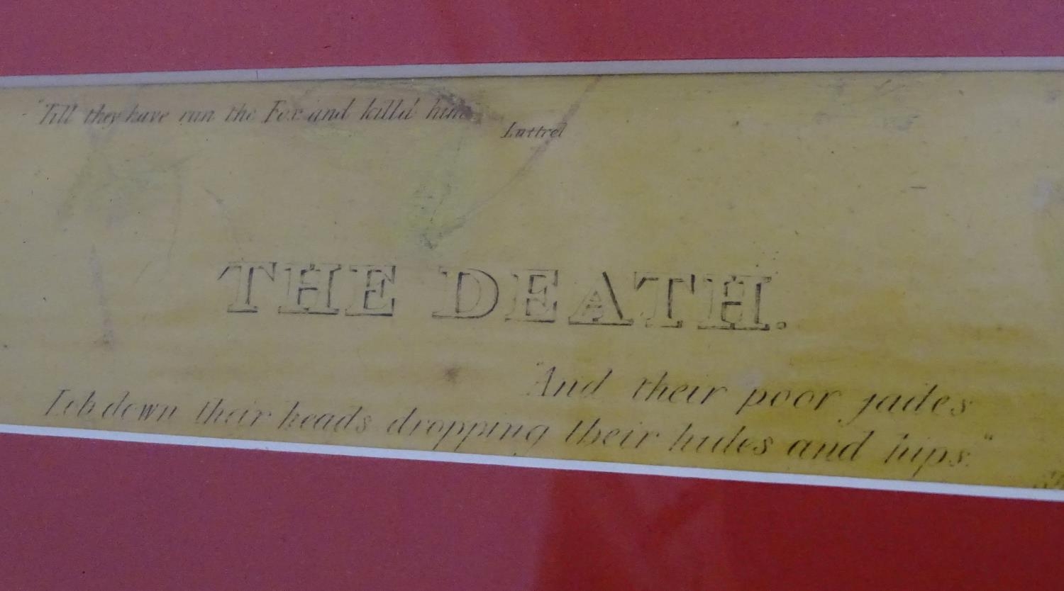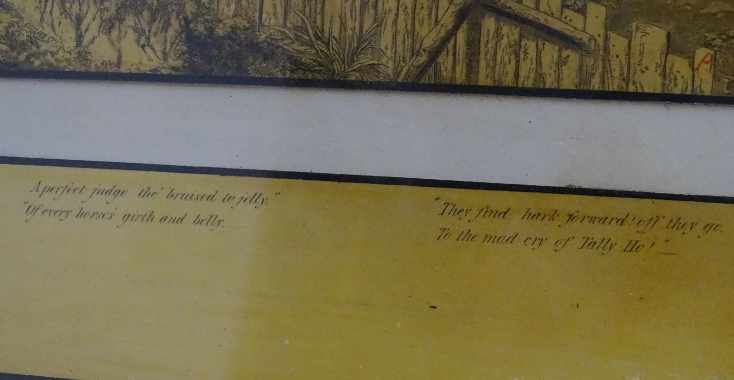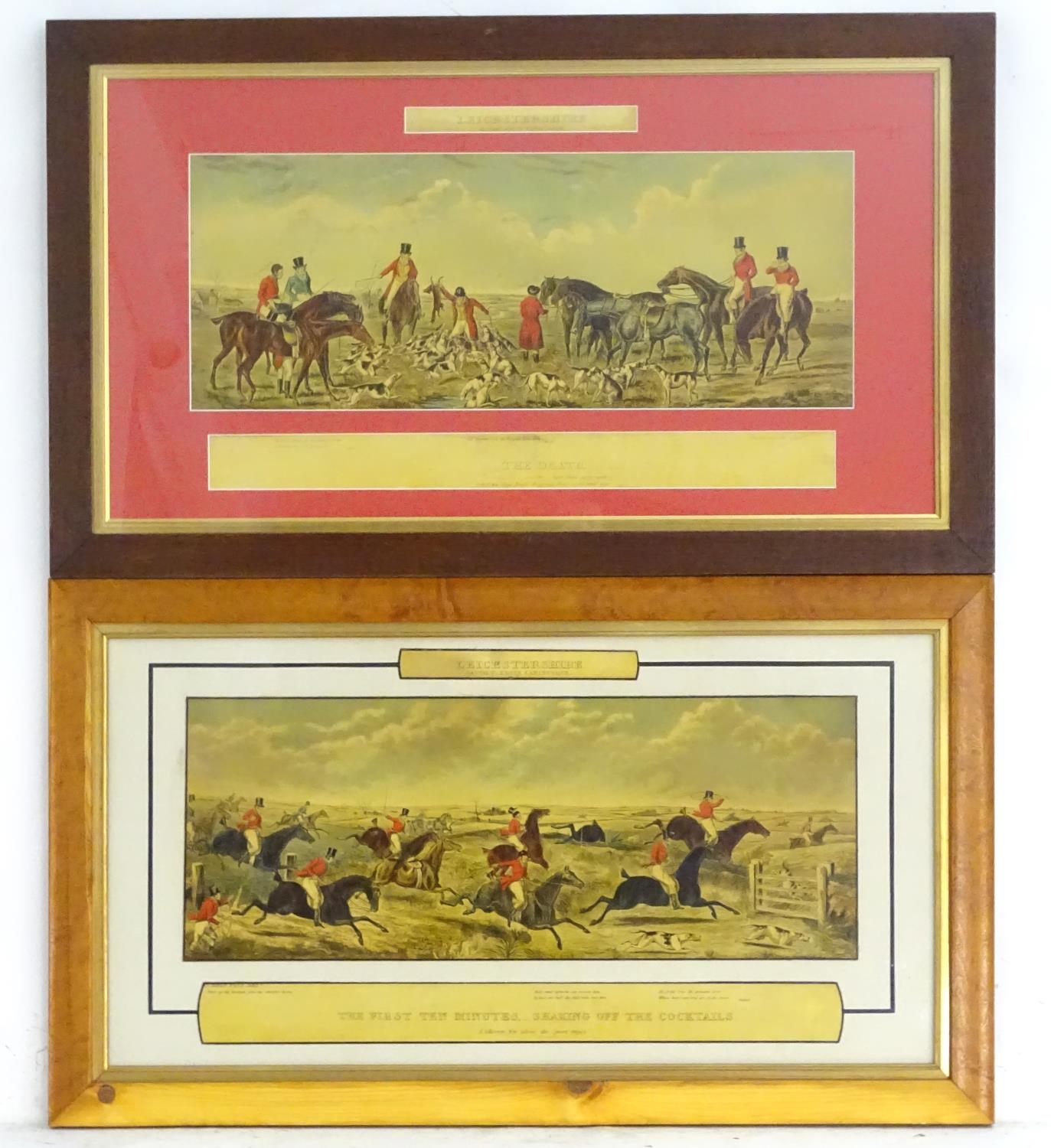 After John Dean Paul (1775-1852), Hand coloured hunting engravings, A Struggle for the Start, The First Ten Minutes - Shaking Off the Cocktails, Symptoms of a Skurry in a Pewy Country, and The Death, from the Leicestershire - Gaudet Equis Canibusque. Depicting four stages of a hunt, depicting horses, figures in hunting pinks, hounds, etc. Titled with information under. Each approx. 8 1/2" x 22" (4)