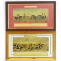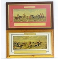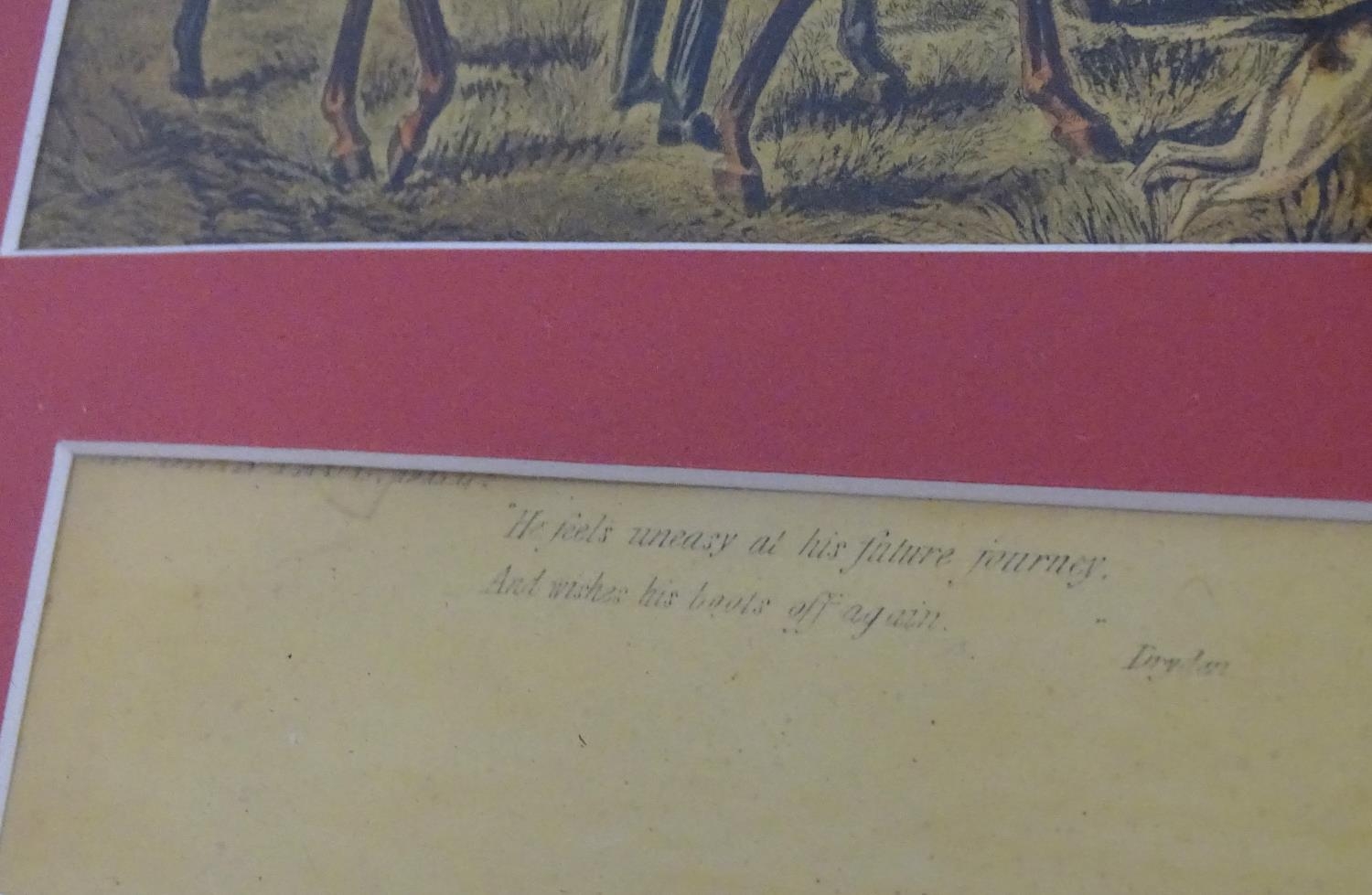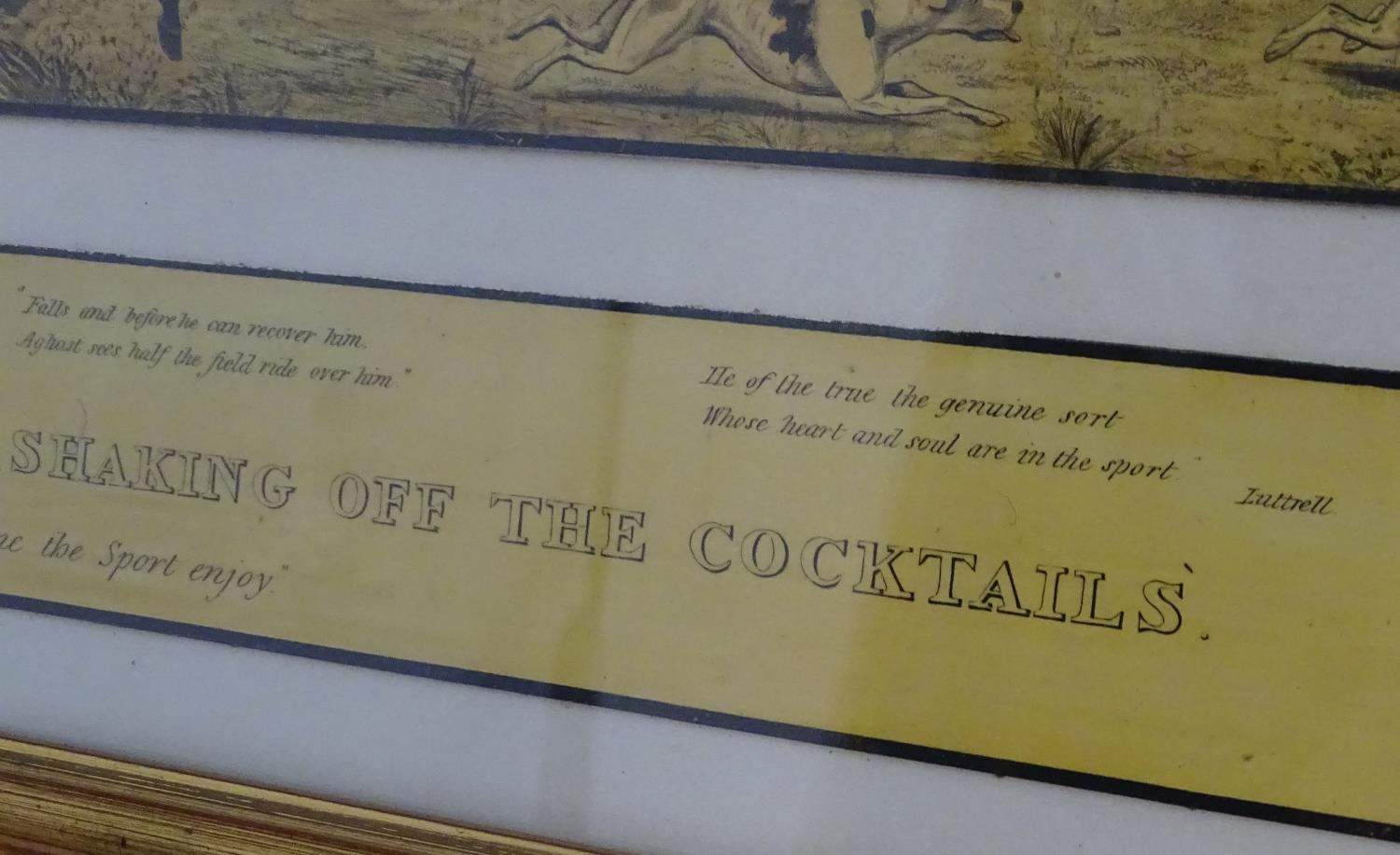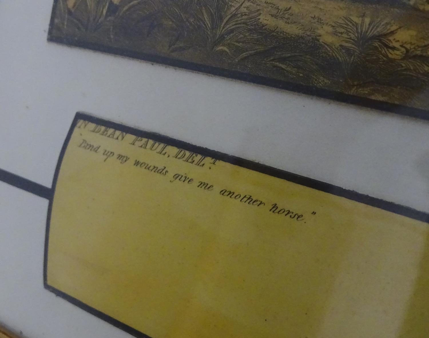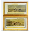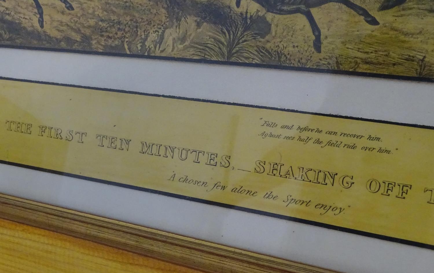 After John Dean Paul (1775-1852), Hand coloured hunting engravings, A Struggle for the Start, The First Ten Minutes - Shaking Off the Cocktails, Symptoms of a Skurry in a Pewy Country, and The Death, from the Leicestershire - Gaudet Equis Canibusque. Depicting four stages of a hunt, depicting horses, figures in hunting pinks, hounds, etc. Titled with information under. Each approx. 8 1/2" x 22" (4)
