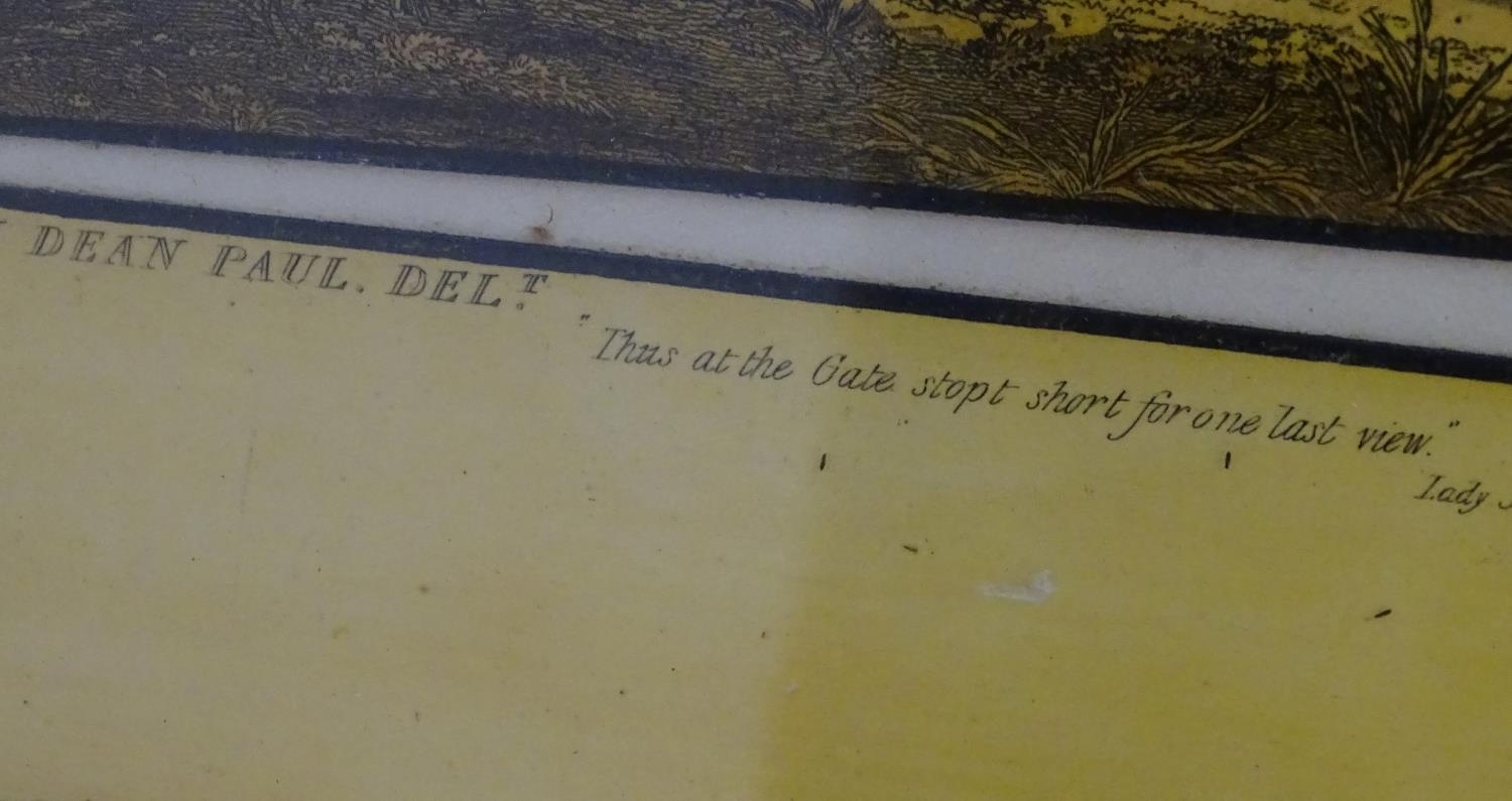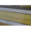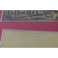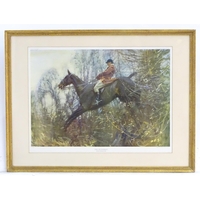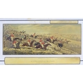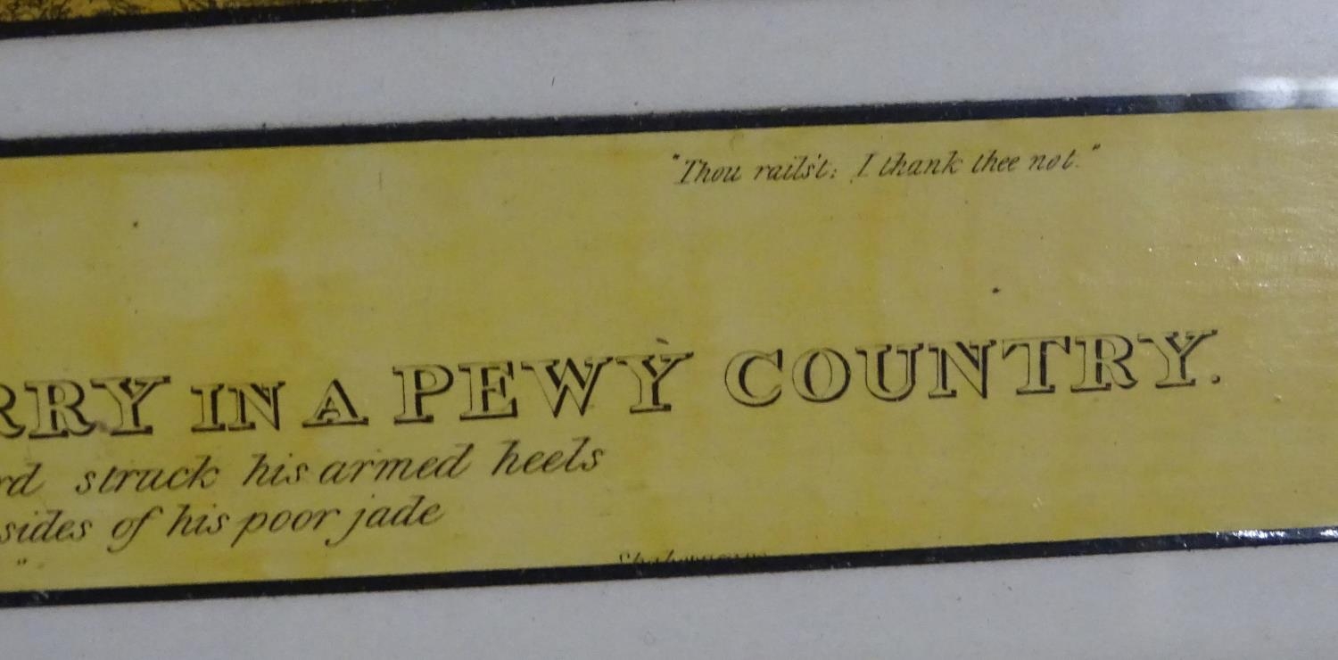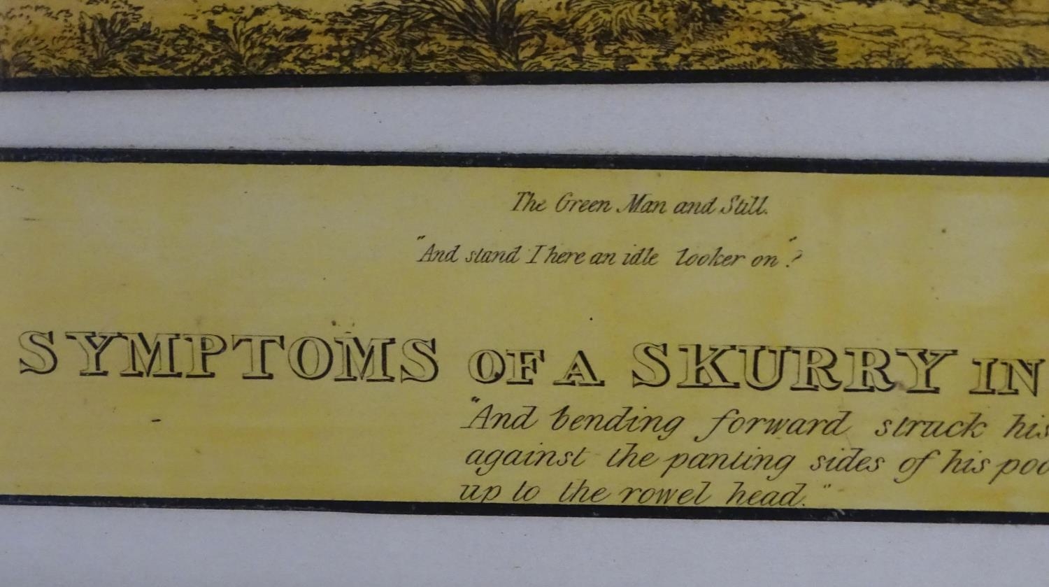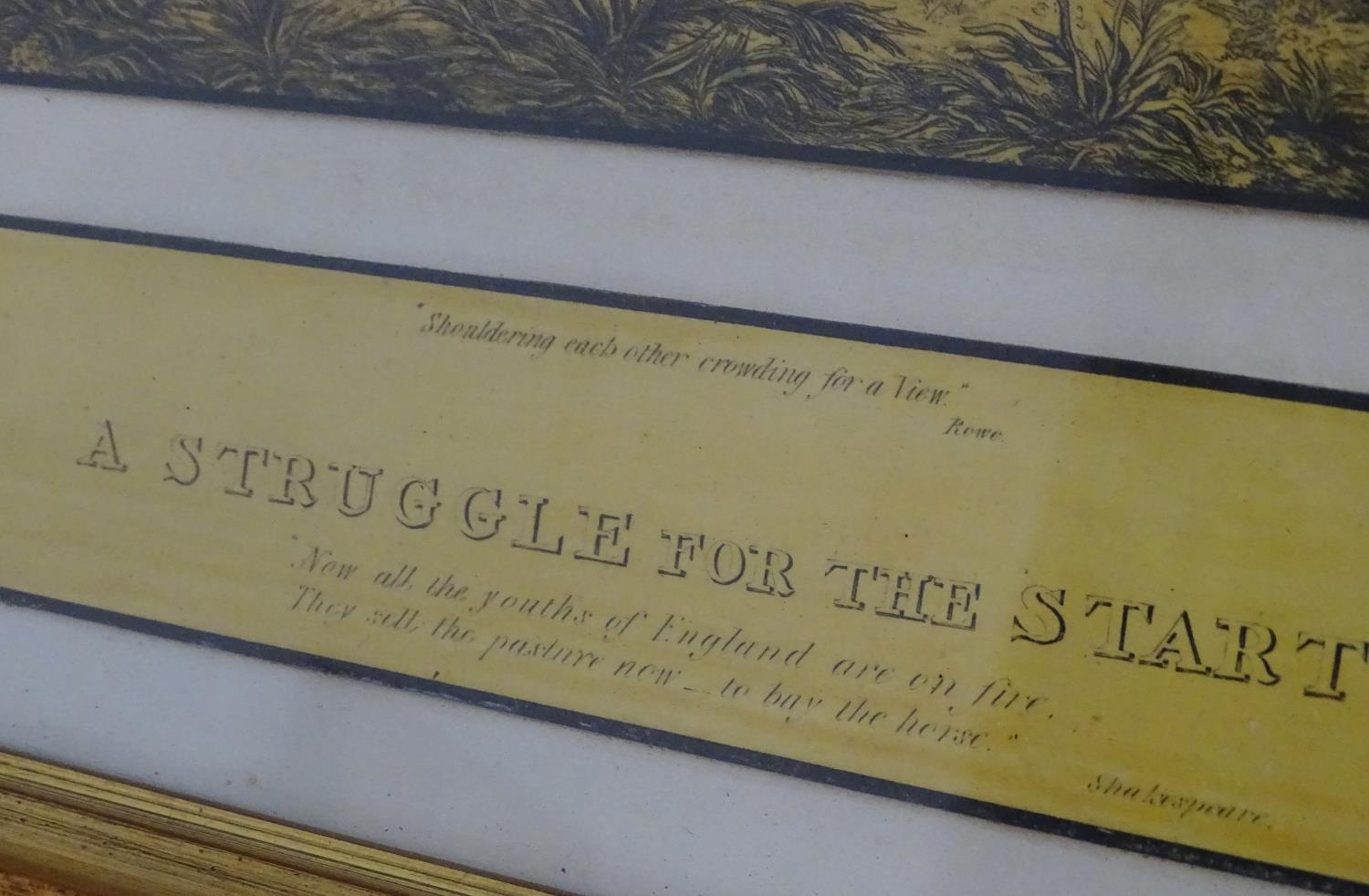 After John Dean Paul (1775-1852), Hand coloured hunting engravings, A Struggle for the Start, The First Ten Minutes - Shaking Off the Cocktails, Symptoms of a Skurry in a Pewy Country, and The Death, from the Leicestershire - Gaudet Equis Canibusque. Depicting four stages of a hunt, depicting horses, figures in hunting pinks, hounds, etc. Titled with information under. Each approx. 8 1/2" x 22" (4)