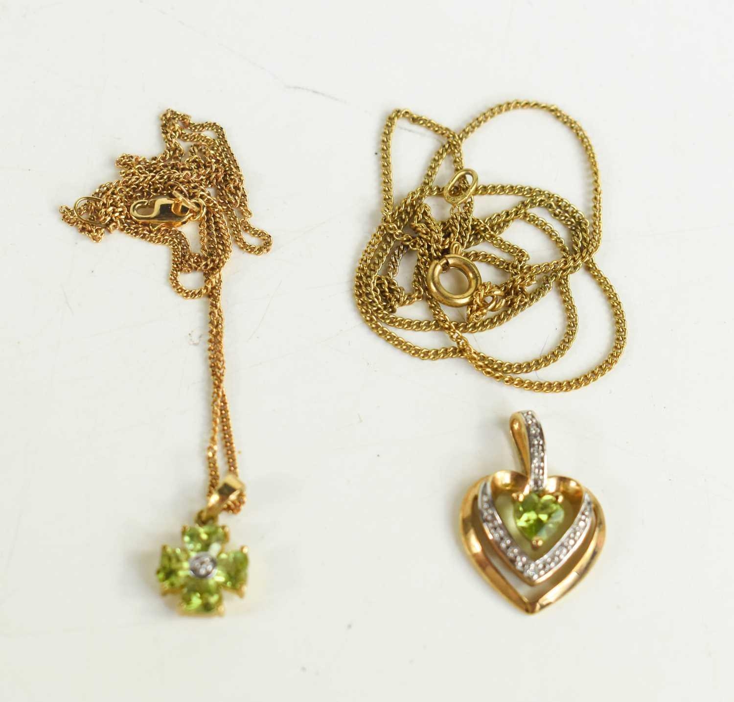 A 9ct gold peridot four leaf clover or shamrock pendant with chain, chain length 40.5cm and a similar heart shaped pendant, total weight 3.8g, with an unmarked possibly plated chain.