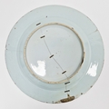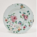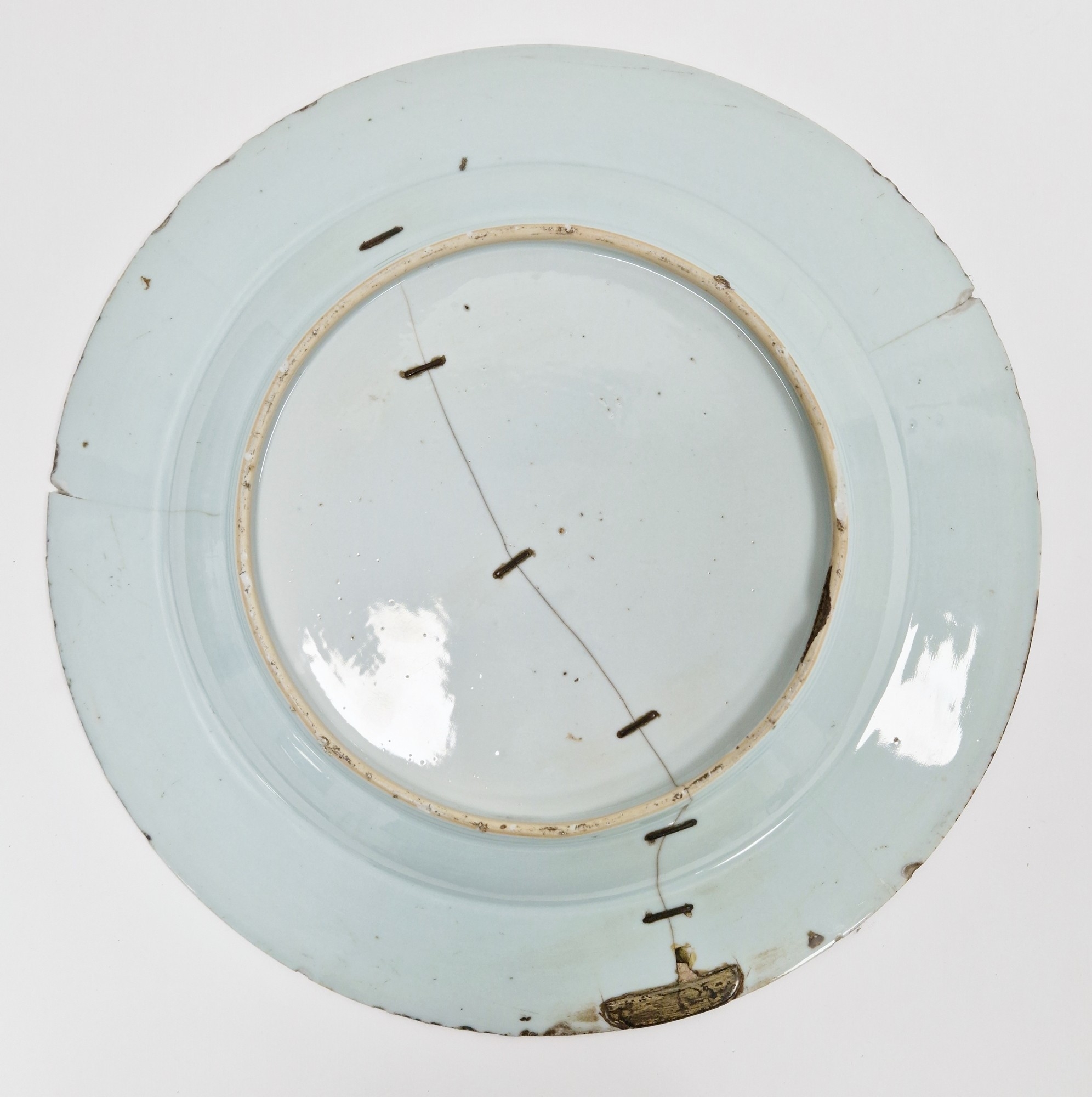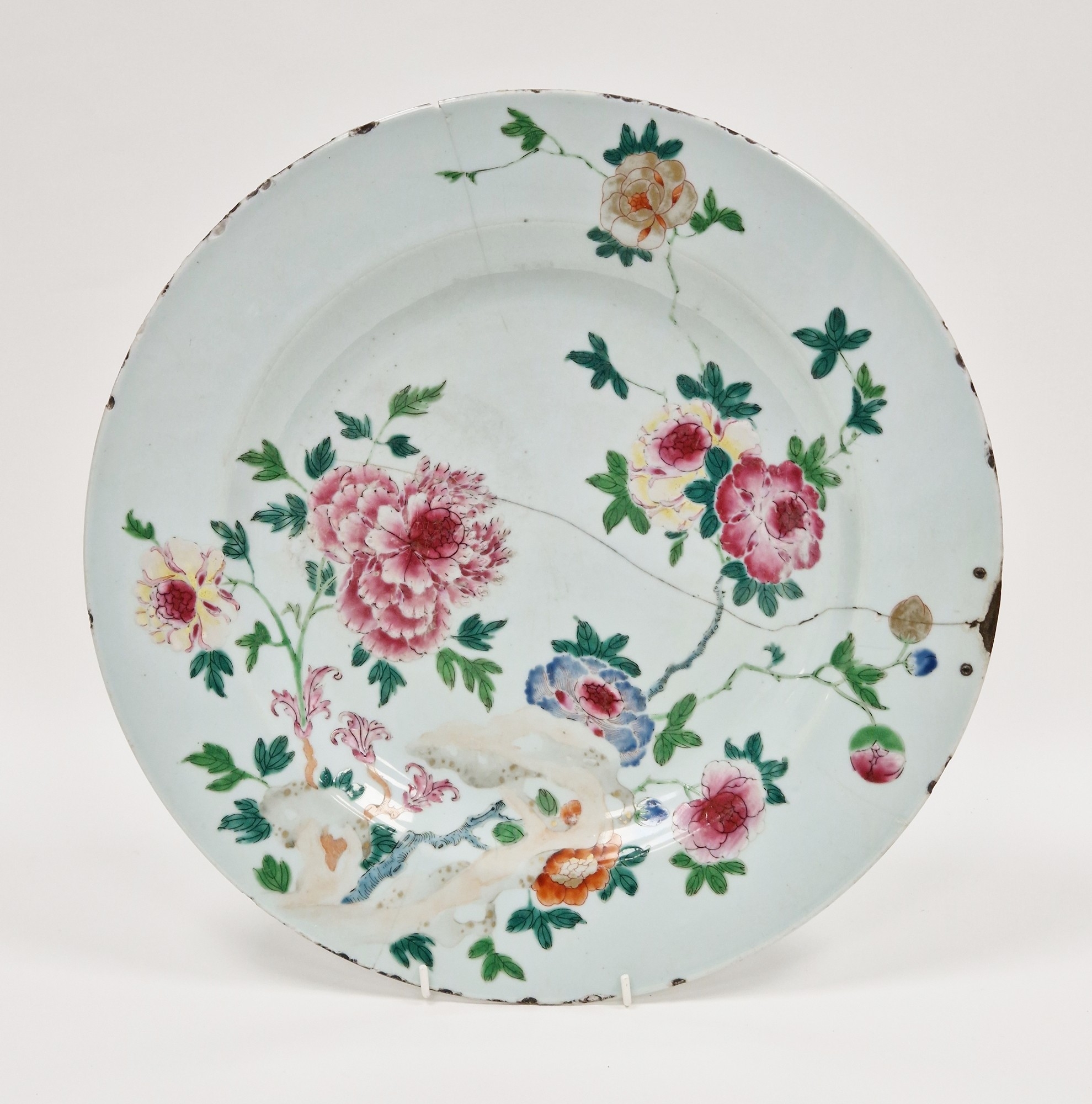 Chinese export famille rose charger, 18th century, painted with a peony and other flowers amongst leafy branches issuing from rockwork (cracked and riveted and further damages), 39cm