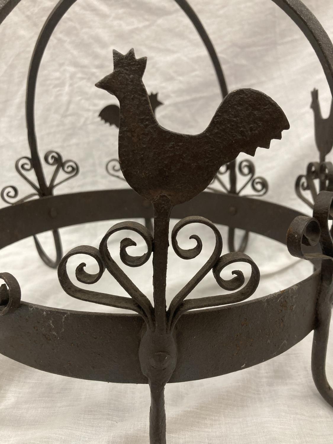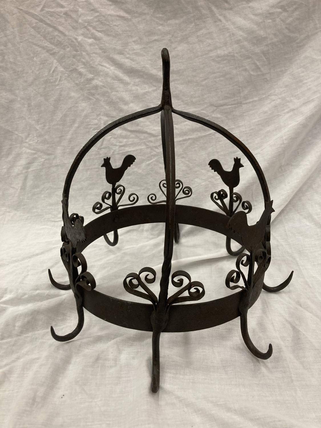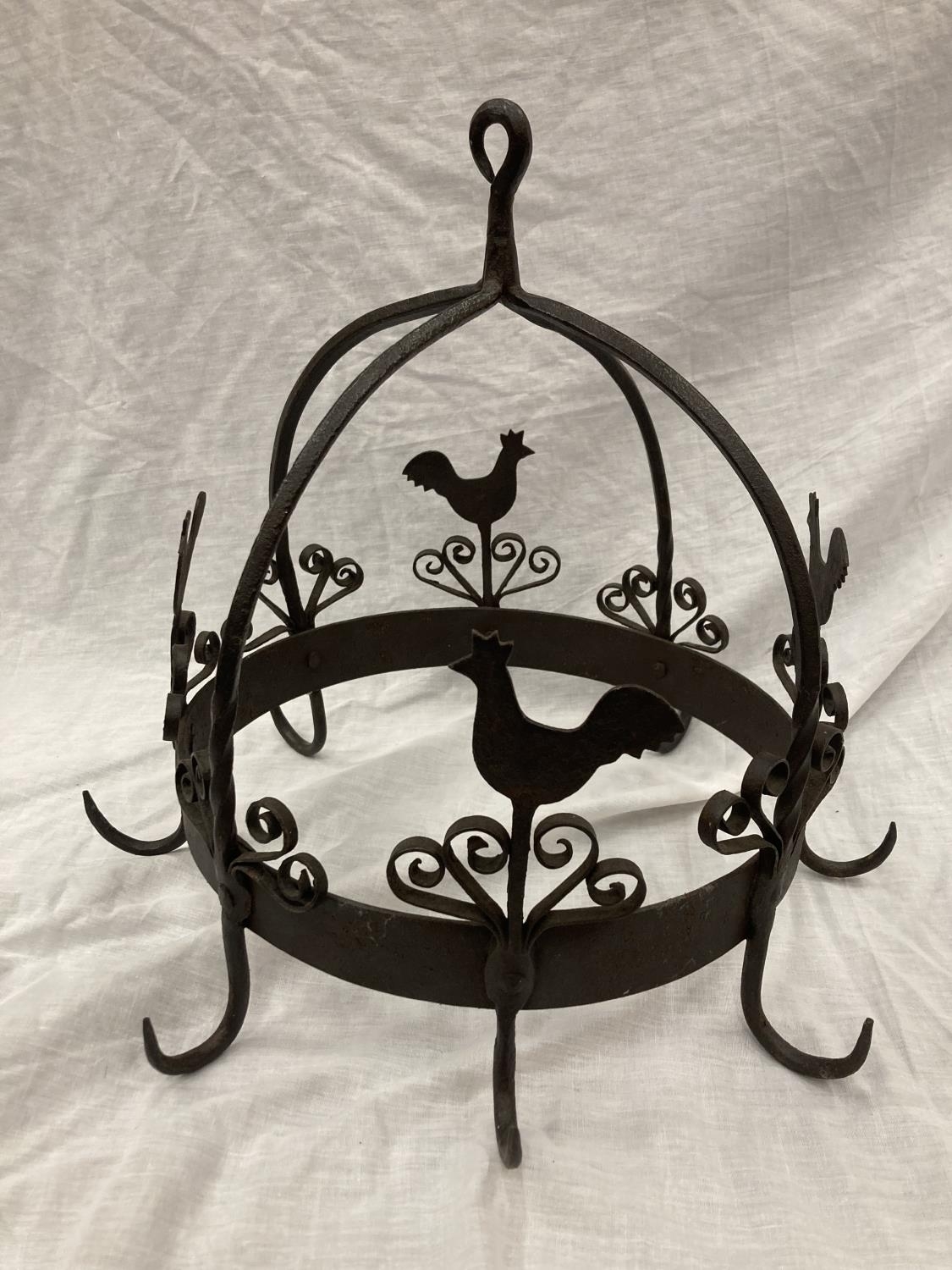 A WROUGHT IRON HANGING UTENSIL HOLDER DECORATED WITH SCROLLS AND HENS HEIGHT 37CM, DIAMETER 30CM