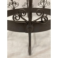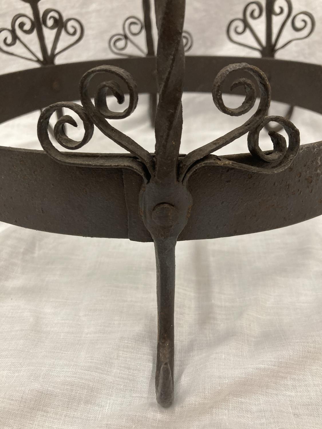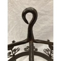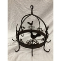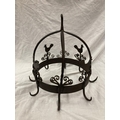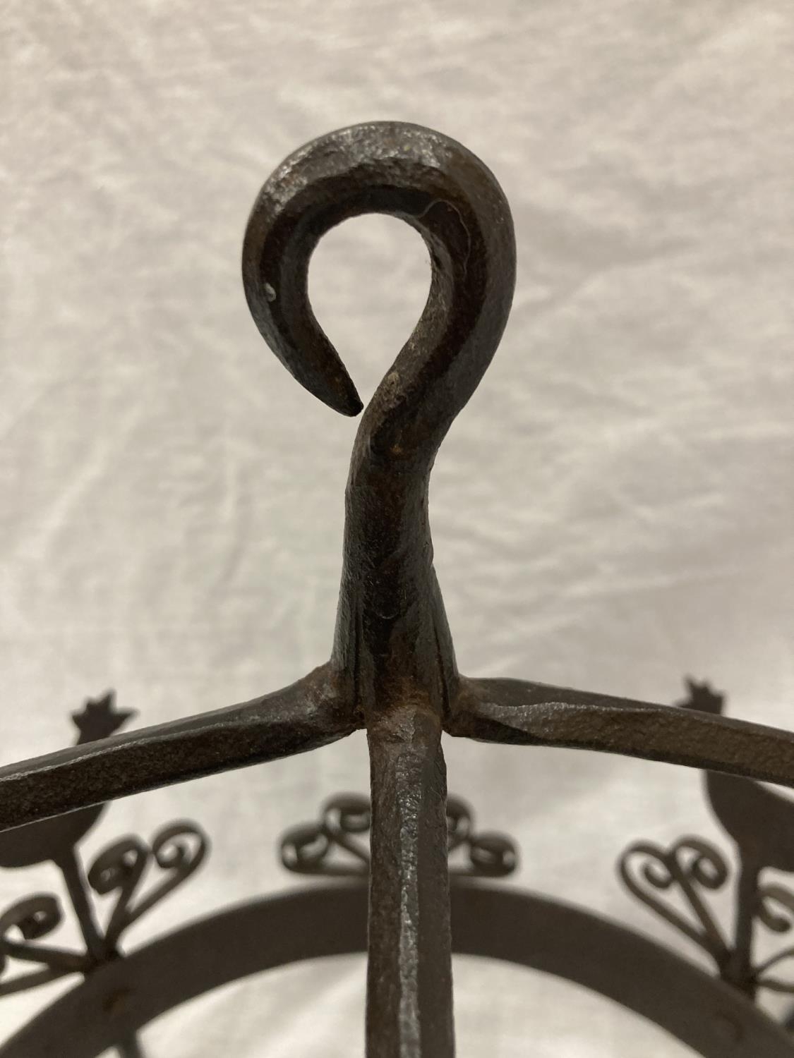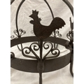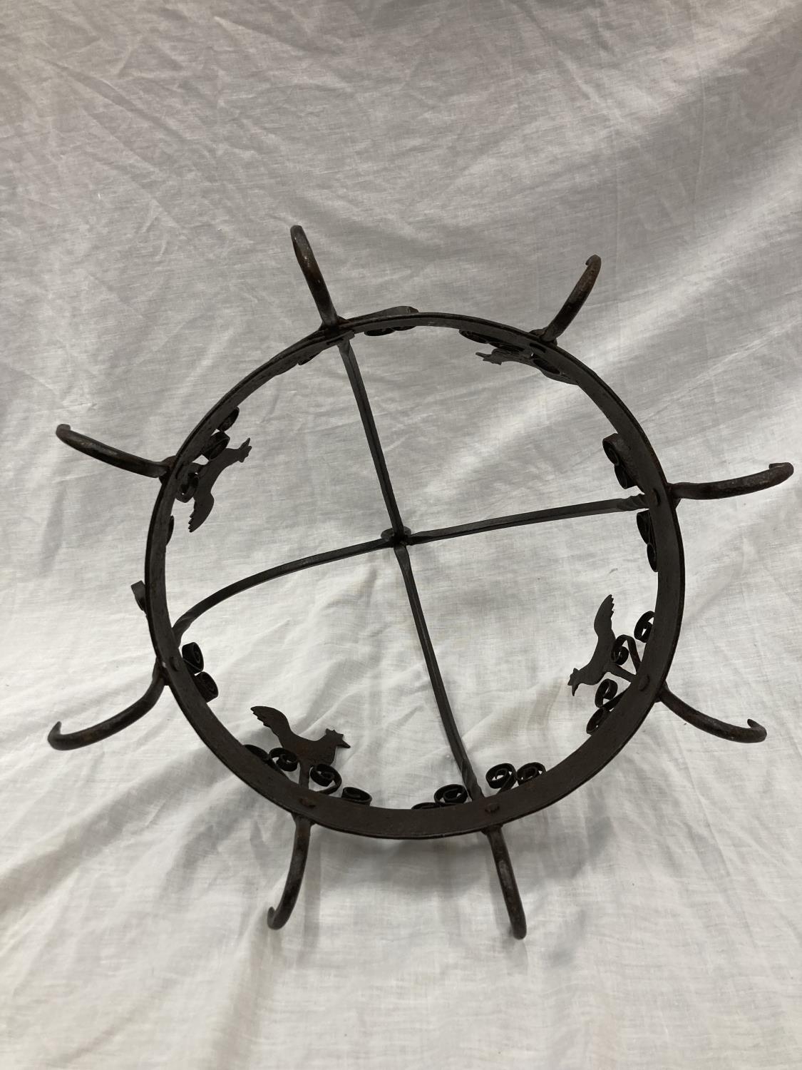 A WROUGHT IRON HANGING UTENSIL HOLDER DECORATED WITH SCROLLS AND HENS HEIGHT 37CM, DIAMETER 30CM