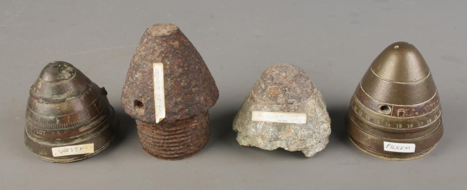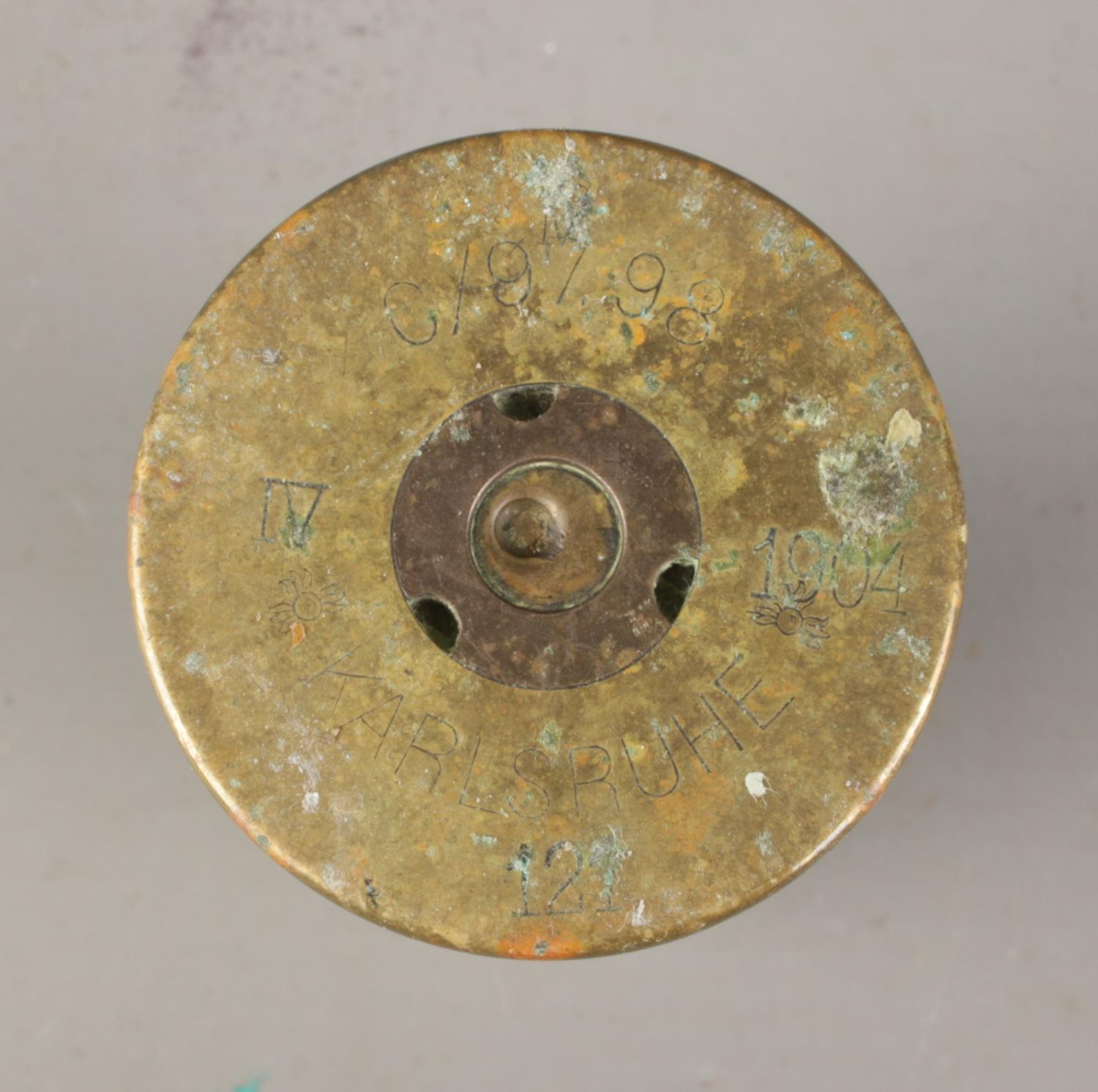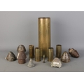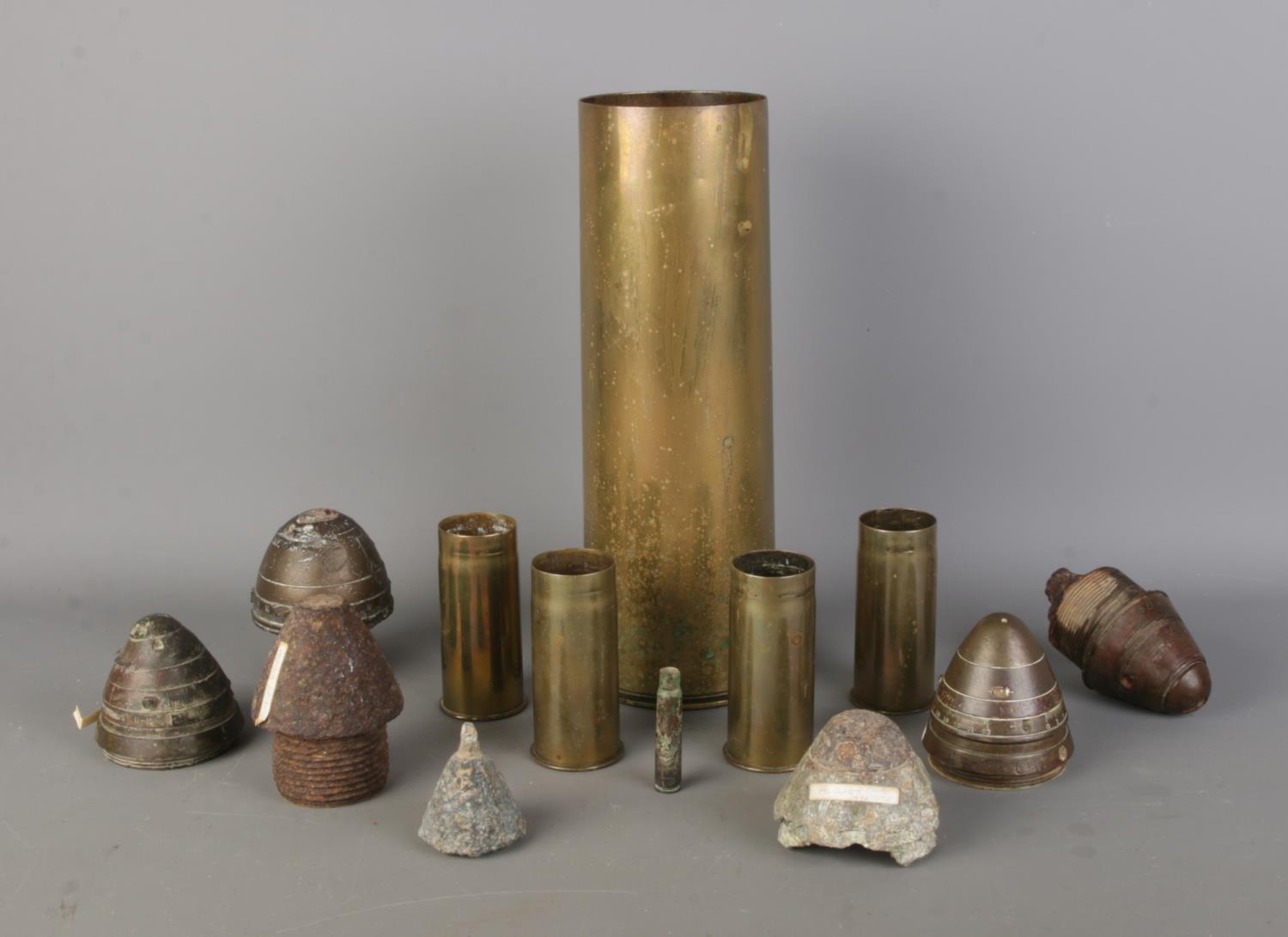 A collection of brass shell cases and artillery fuses; with some fuses having discovery sites with them and the set of four shells bearing Karlsruhe, 1903-04.