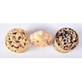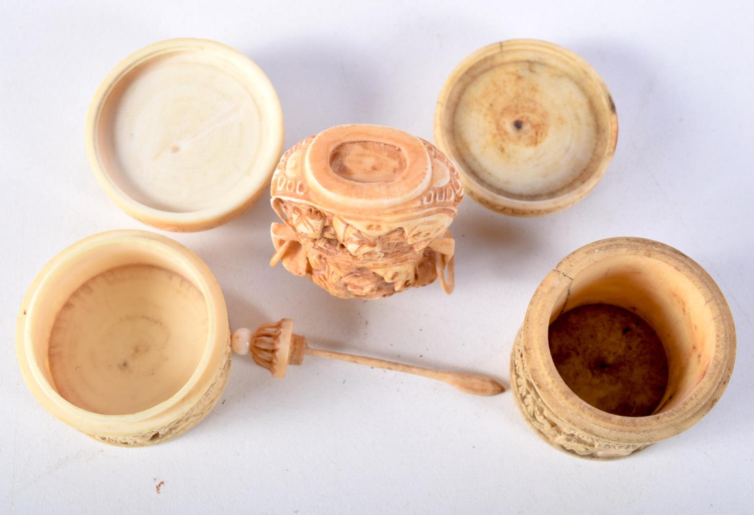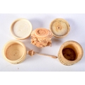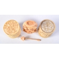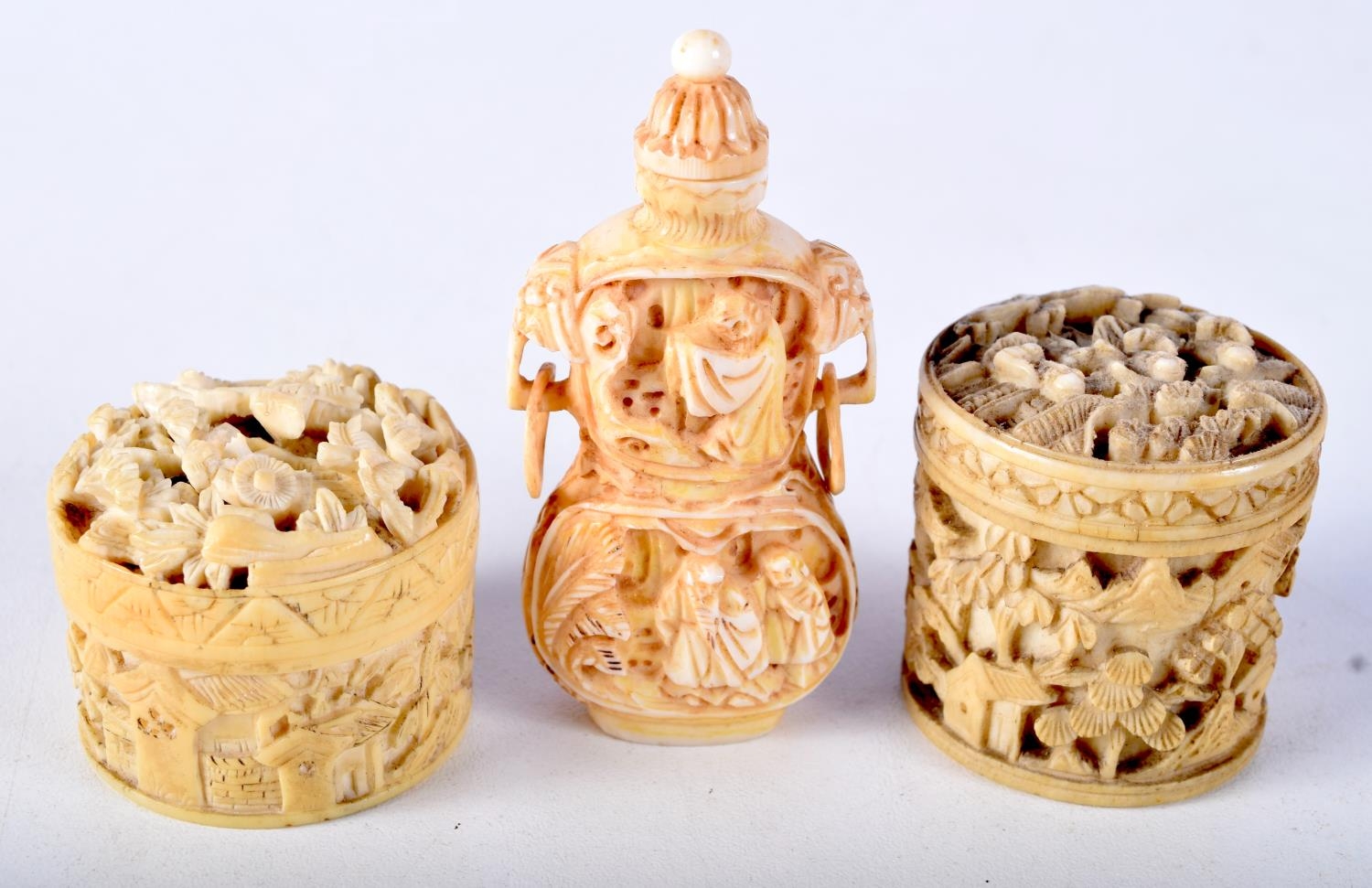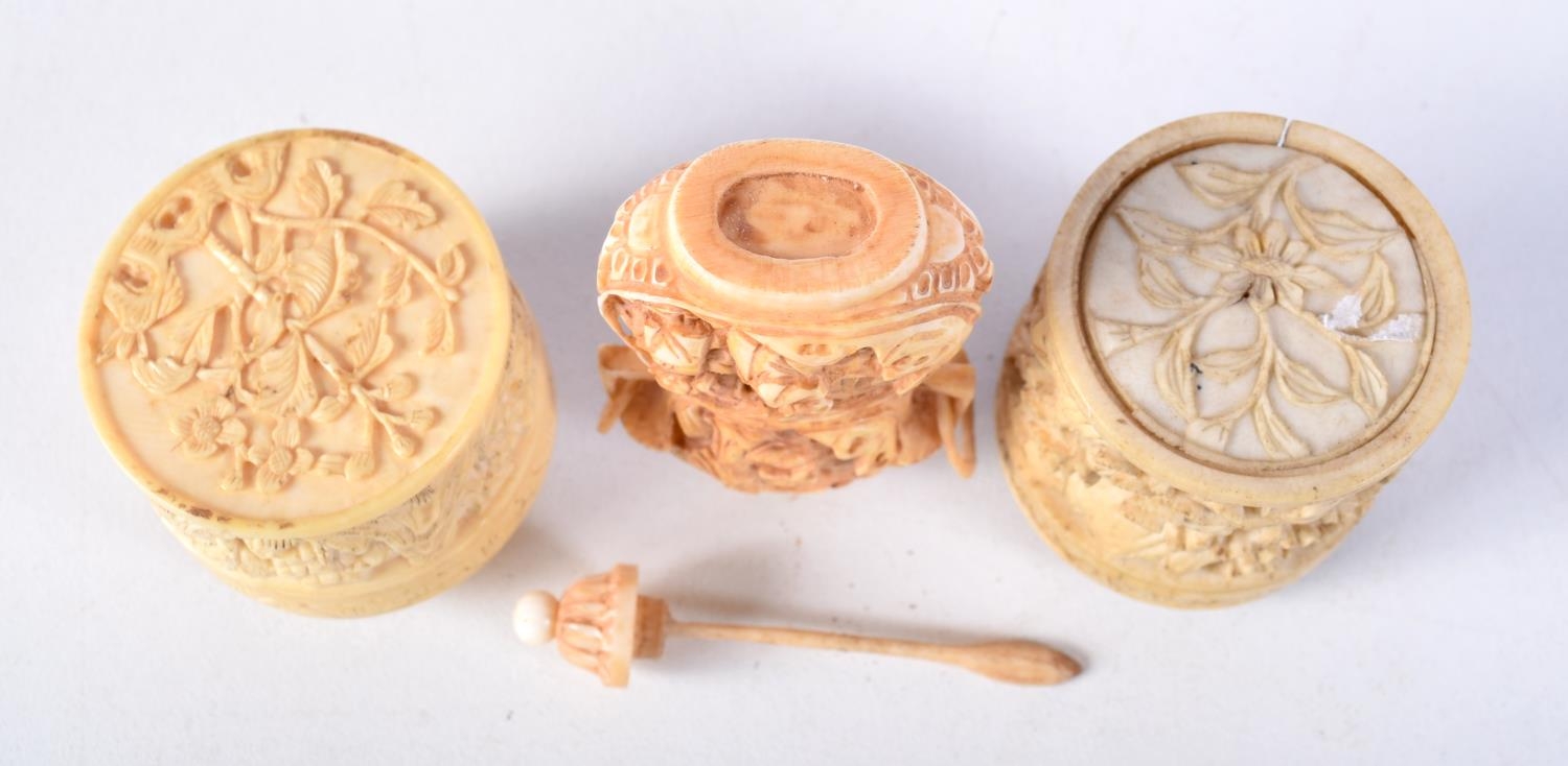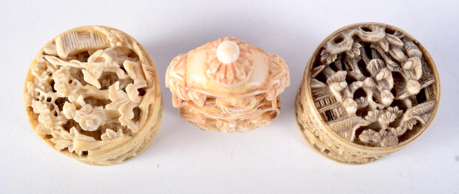 A PAIR OF 19TH CENTURY CHINESE CANTON IVORY BOXES together with a similar snuff bottle. Largest 7 cm high. (3)