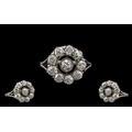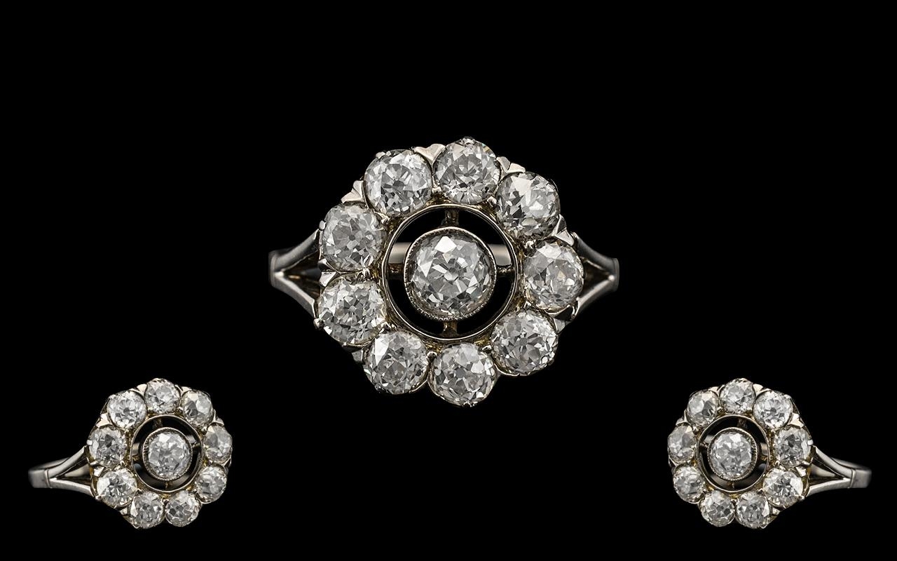 Antique Period Superb Quality 18ct White Gold Diamond Set Cluster Ring - Flower head Setting. The Cushion Cut Diamonds of Top Colour and Clarity. Est Diamond Colour G - H, Est Diamond Clarity VSI. Est Diamond Weight 2.40 cts. Ring Size - S. Not Marked Tests Gold. All Aspects of Condition Are Excellent, Including Shank and Setting. Please Confirm with Photo.