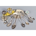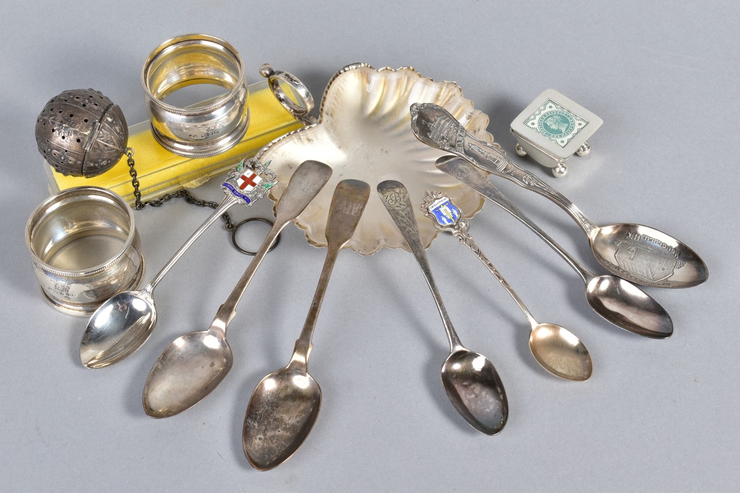 A SELECTION OF SILVER WARE, to include a Mappin & Webb silver shell bon bon dish with glass liner, a pair of silver napkin rings, seven teaspoons including an early Victorian silver teaspoon with hallmark for Newcastle 1860 etc, approximate total weight (excluding glass liner) 262 grams