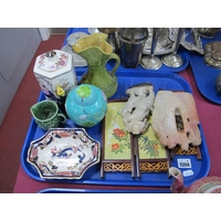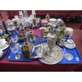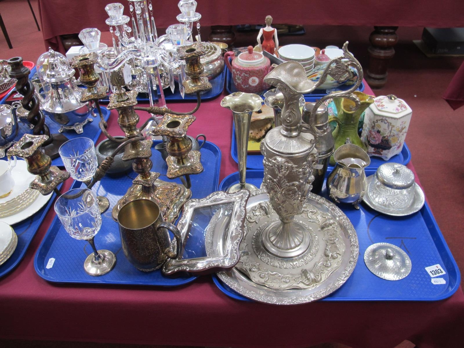 A Silver Photograph Frame, pair of plated trumpet shaped vases, cocktail shaker, four branch candelabra, Continental ewer on stand:- Two Trays