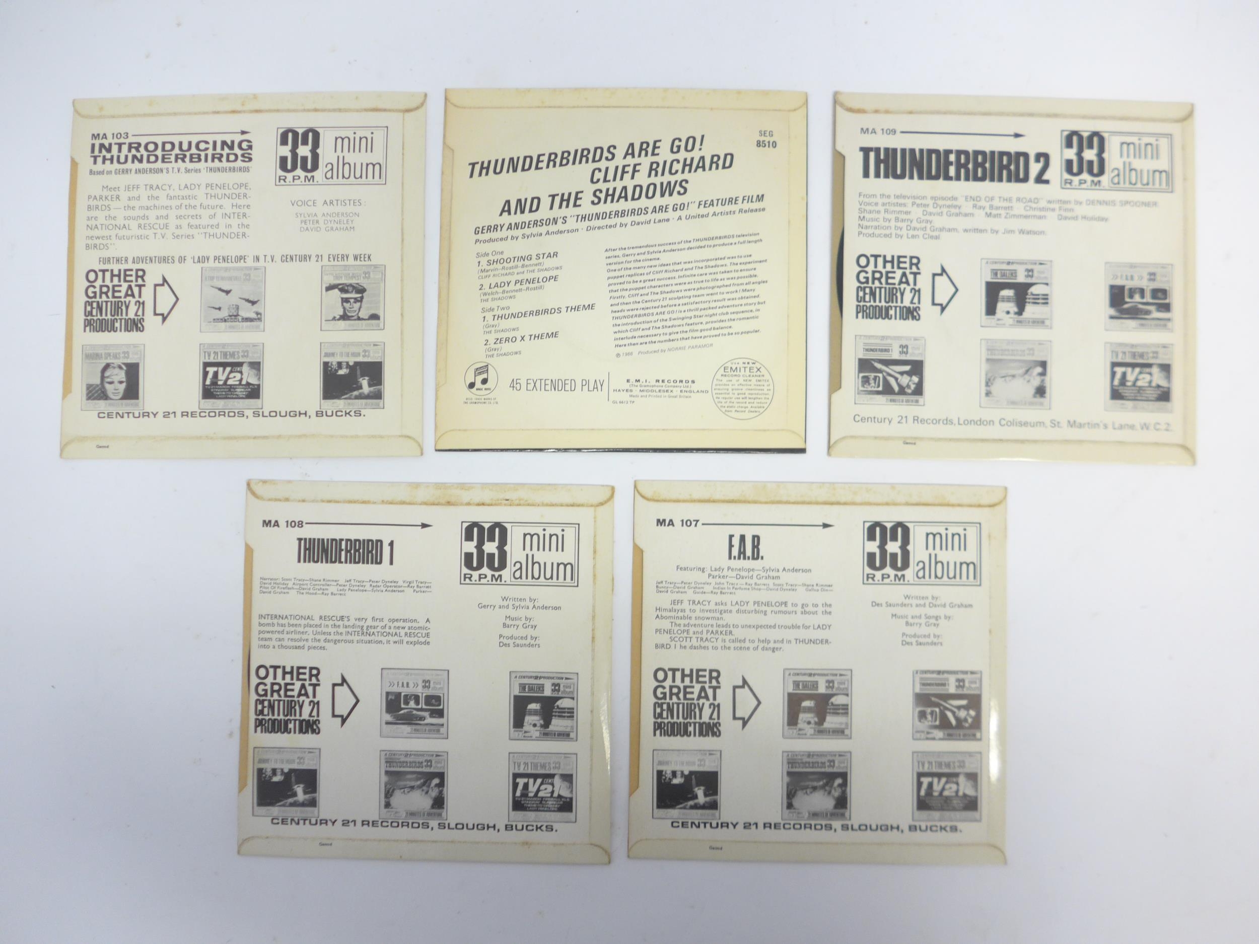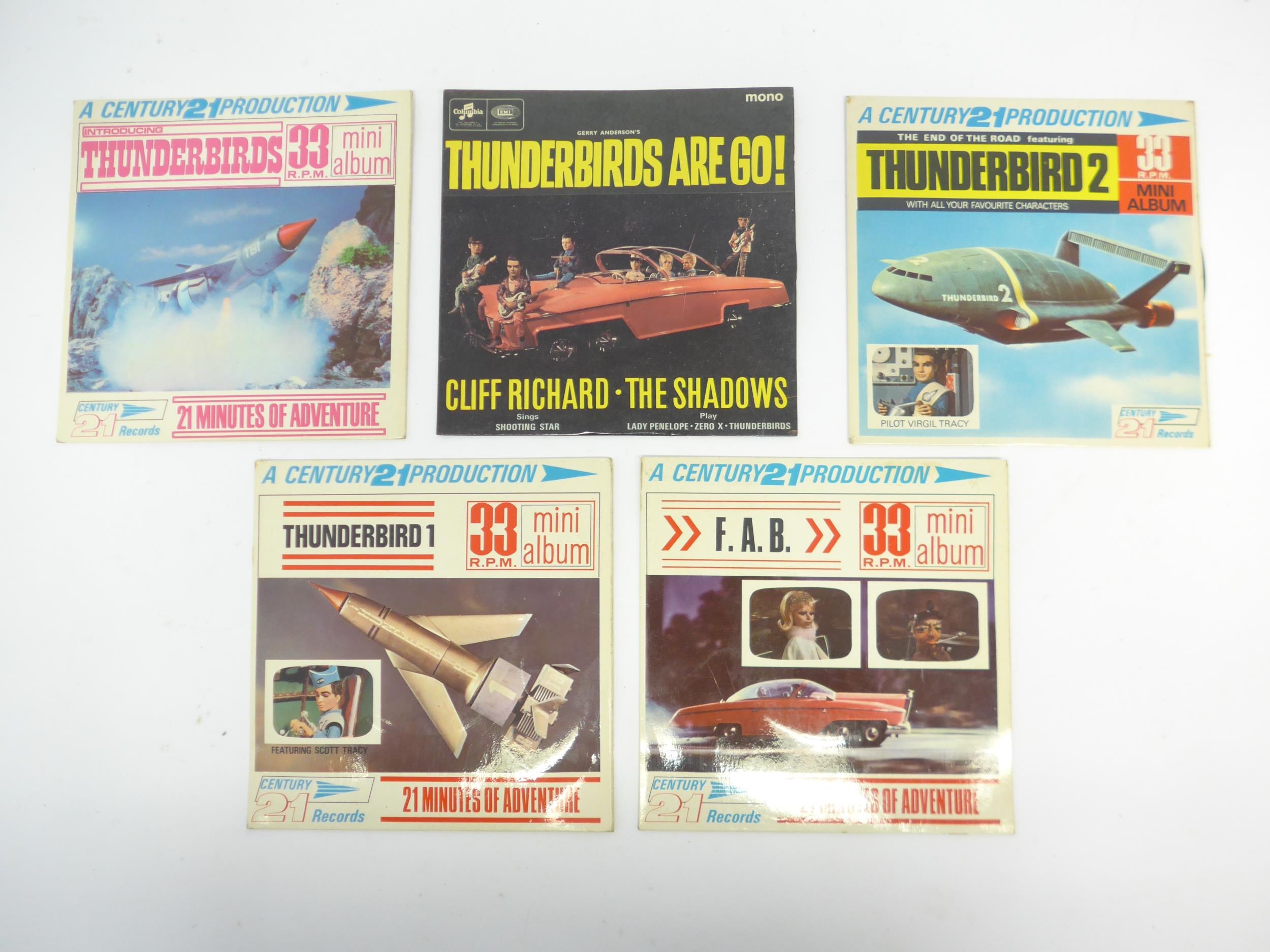 TV / Soundtrack - Four Century 21 Records Gerry Anderson's Thunderbirds 7" mini albums, to include 'Introducing Thunderbirds' (MA 103), 'Thunderbird 1' (MA 108), 'F.A.B.' (MA 107) and 'Thunderbird 2' (MA 109). Together with CLIFF RICHARD AND THE SHADOWS: 'Thunderbirds Are Go!' EP (SEG 8510) (5, vinyl and sleeves VG-EX)