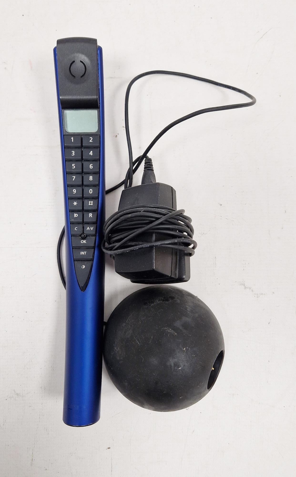 Bang & Olufsen Beocom 2 cordless telephone handset in blue with wall charger, serial no. 1083146/17678387