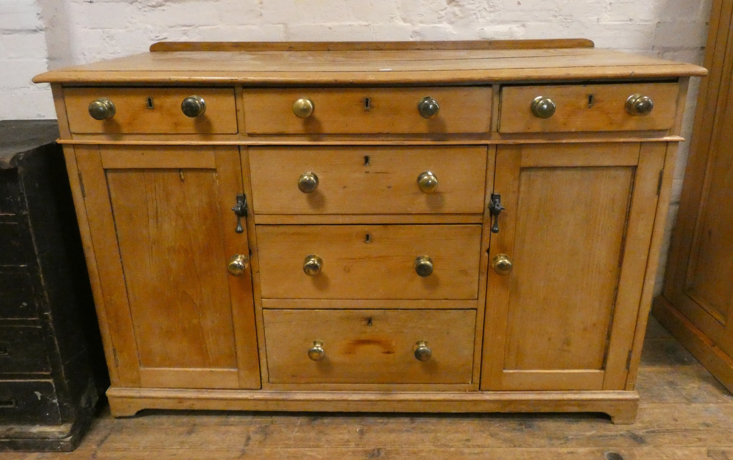 A stripped pine sideboard cabinet fitted six drawers and cupboards with brass knob handles, 4' wide