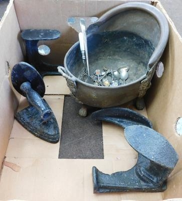 Box of vintage iron inc cobblers last, iron & copper bucket
