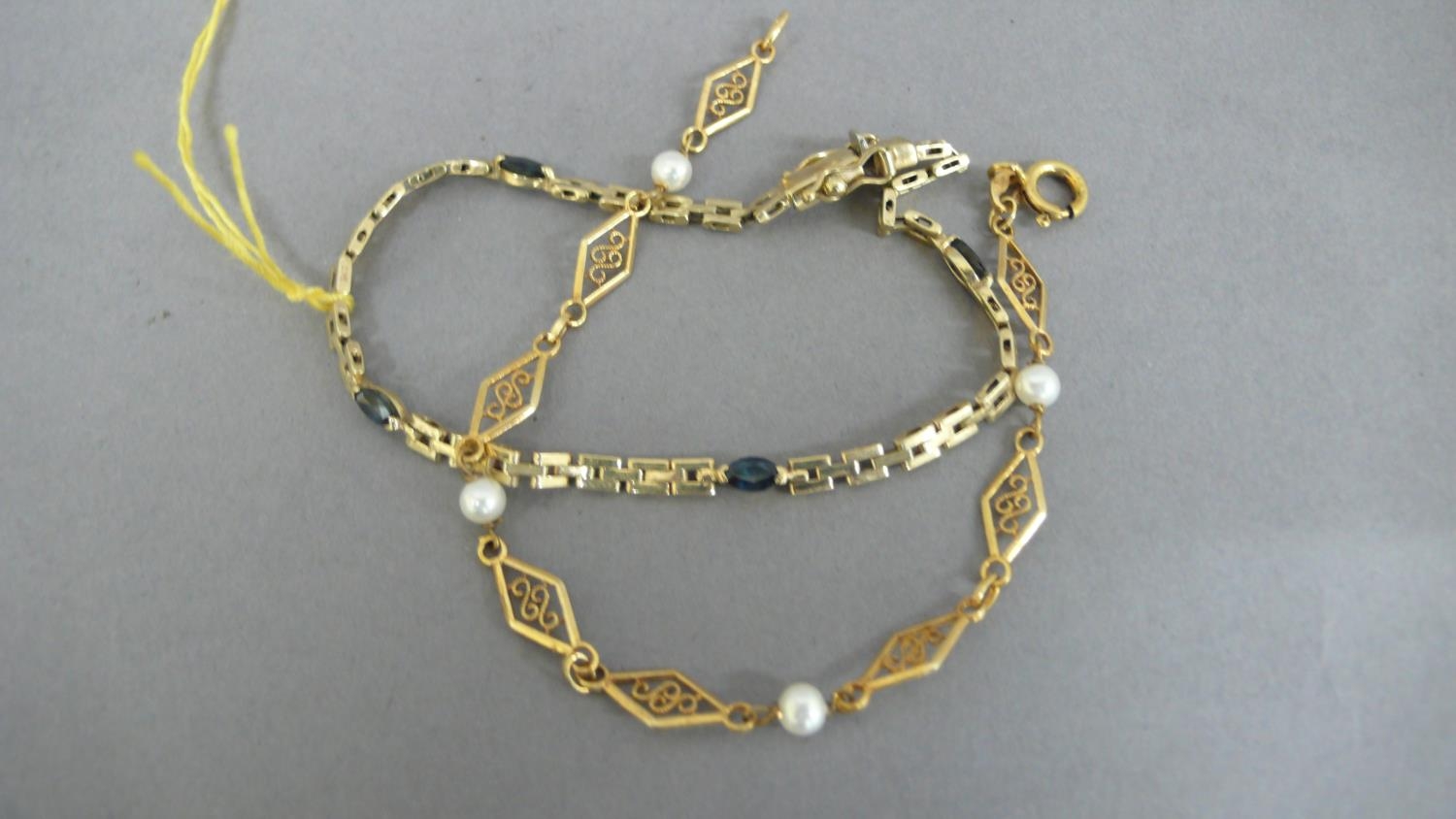 Two 9 ct. gold bracelets one with pearls and the other with blue stones