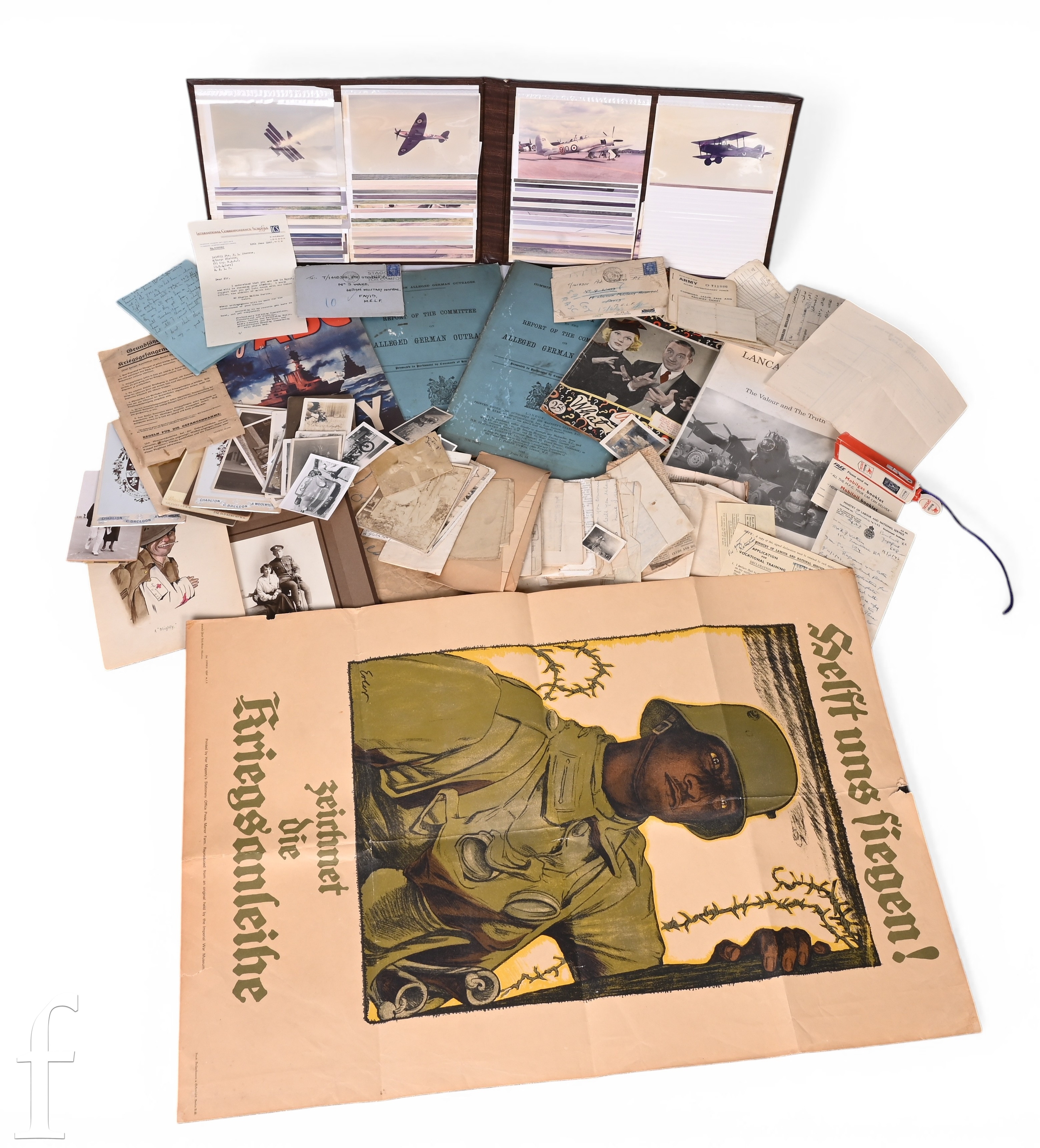 A mixed collection of ephemera including assorted military letters, leave cards, booklets etc, mostly related to Pte P L Stevens, W/Shops Platoon, together with 1915 report of the committee Alleged German Outrages, in two parts, with three other military related books, album of aircraft photographs, and a group of early 20th Century letters, photographs and similar relating to the Porter family, Kent, and a mixed selection of cabinet cards, carte de visite type and other photographs. (qty)