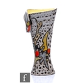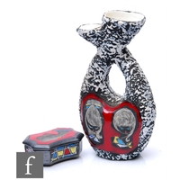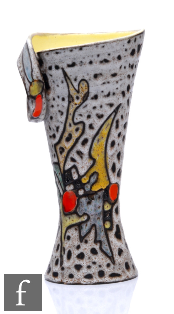 A mid 20th Century Vallauris pottery vase of slender waisted form with one carved handle and one curled handle, the body decorated with amoebic forms in coloured glazes against a black and white speckled ground, incised mark to the base, indistinct artist signature, height 30cm.