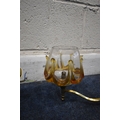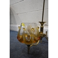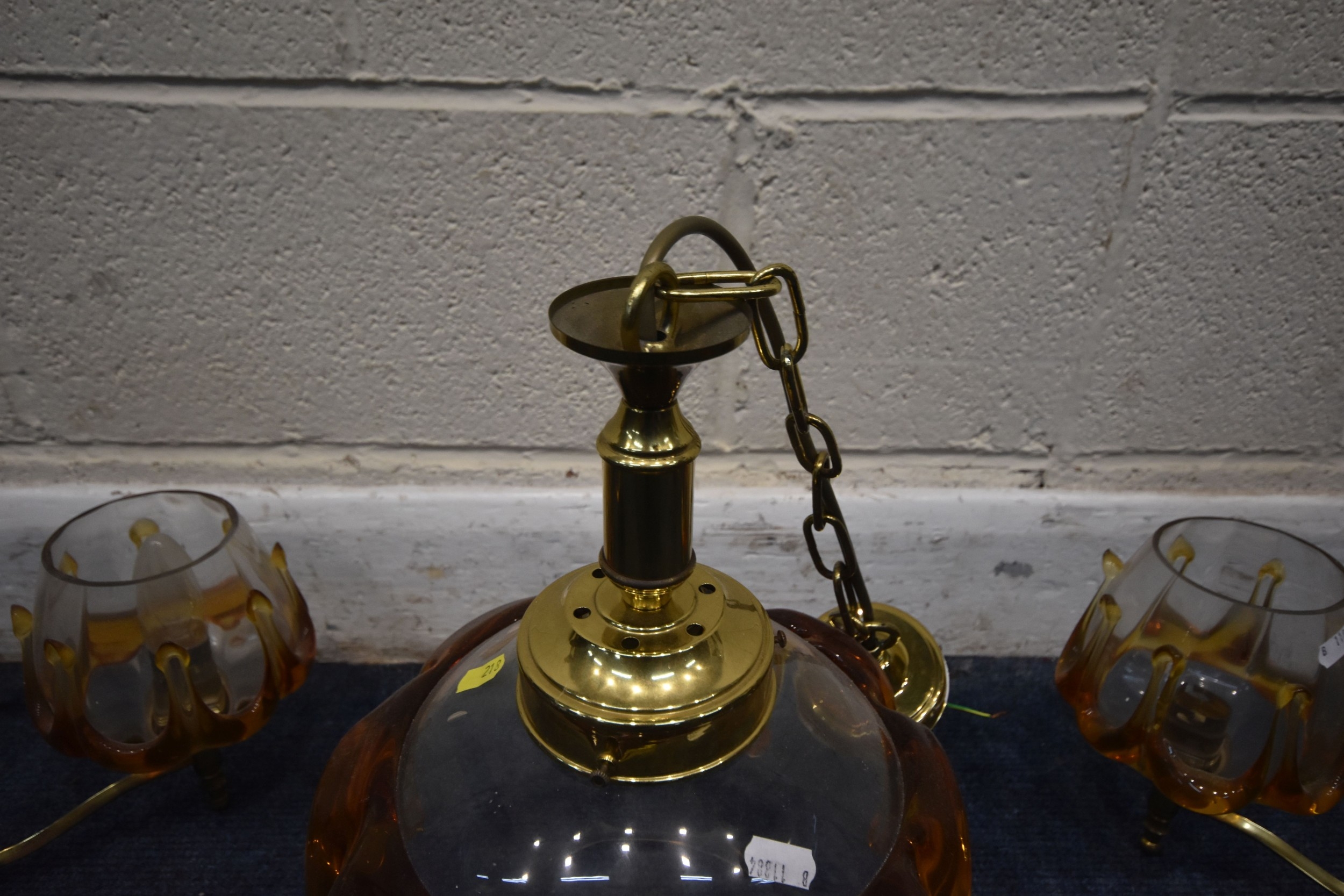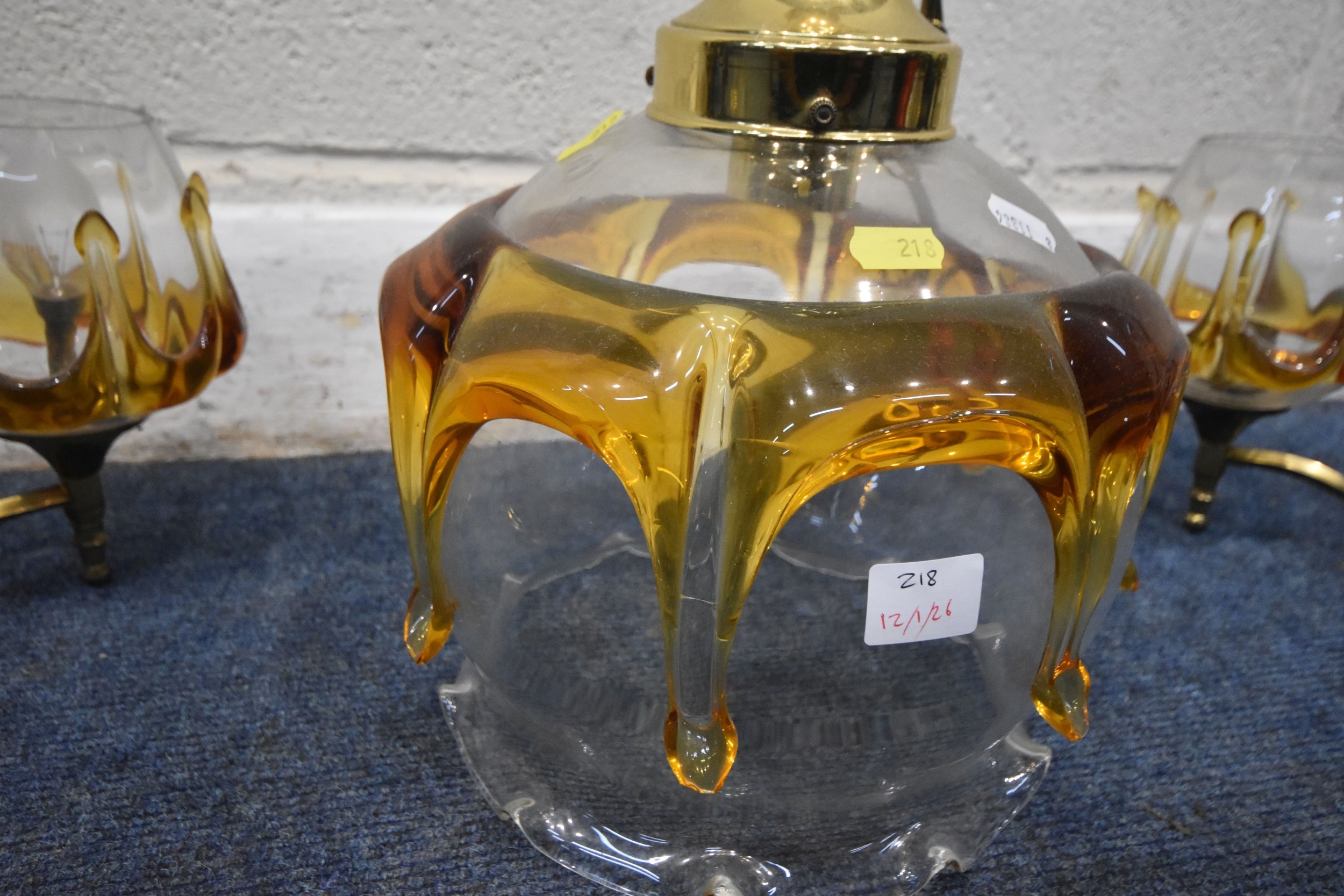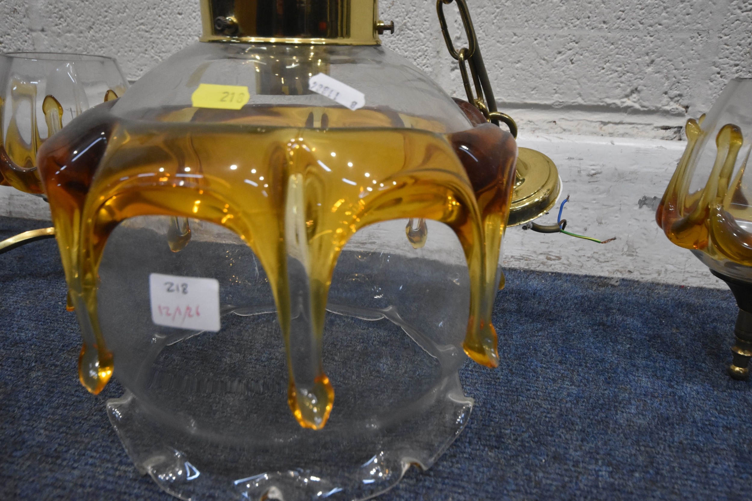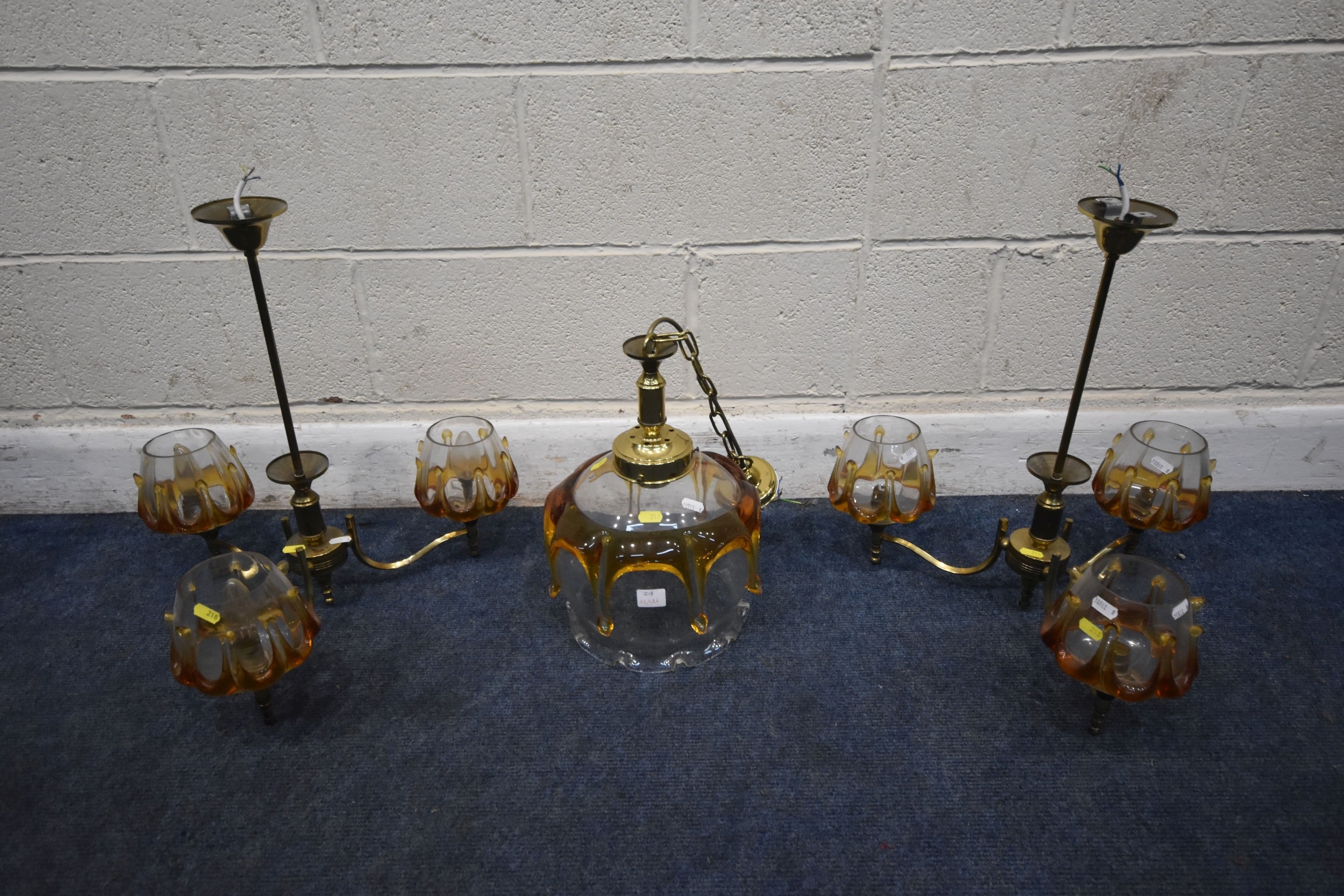 IN THE MANNER OF CARLO NASON MAZZEGA, A PAIR OF MID-CENTURY THREE BRANCH CEILING LIGHTS, with amber drip design shades, along with a matching ceiling light with a single shade, condition report: overall good condition, cables cut (3)