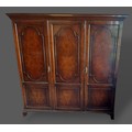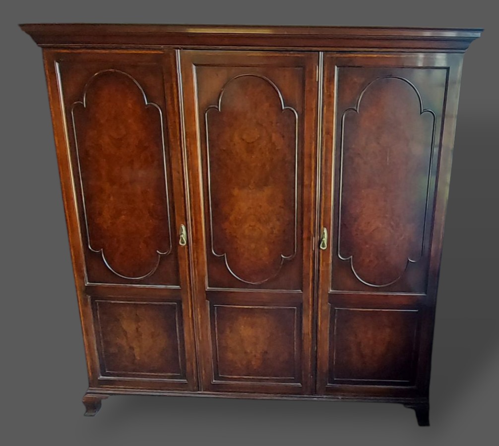 A Circa 1920's Queen Anne style walnut wardrobe, the moulded cornice above three moulded doors with Herringbone crossbanding raised upon o-gee bracket feet, 198cms wide, 57cms deep and 198cms tall