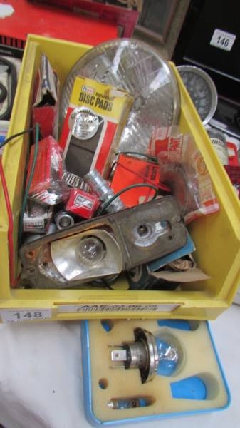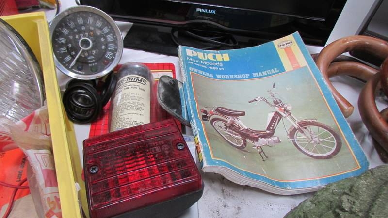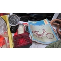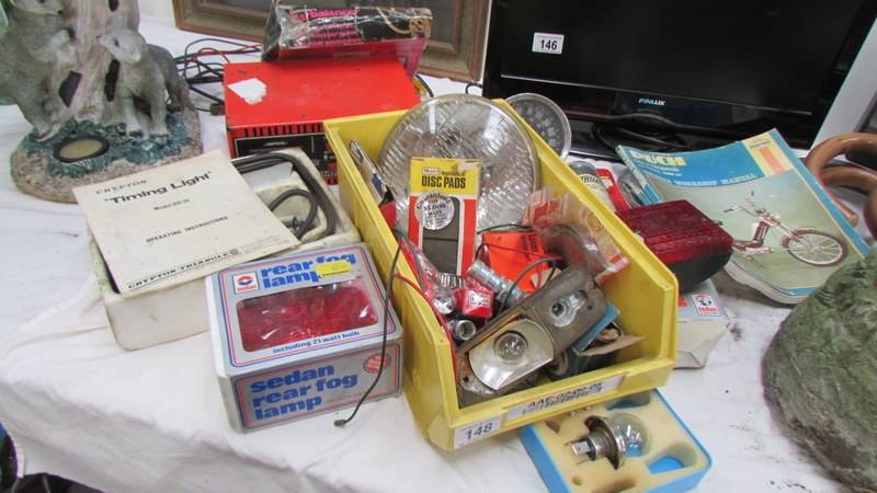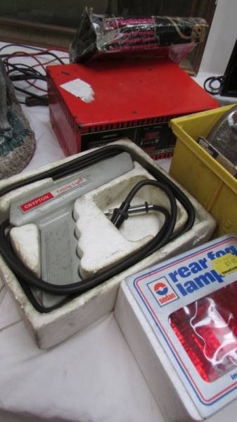 A mixed lot of motoring items including speedometer, lights, battery charger etc., (Collect only)