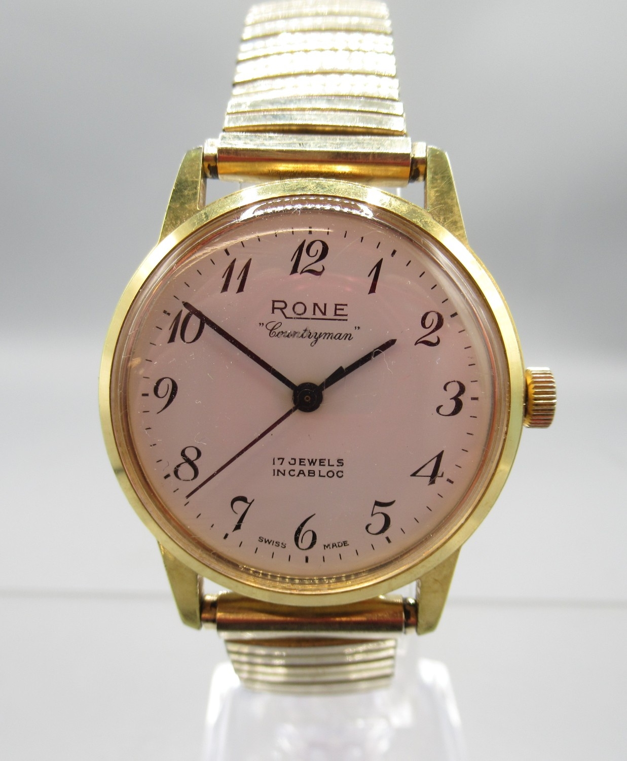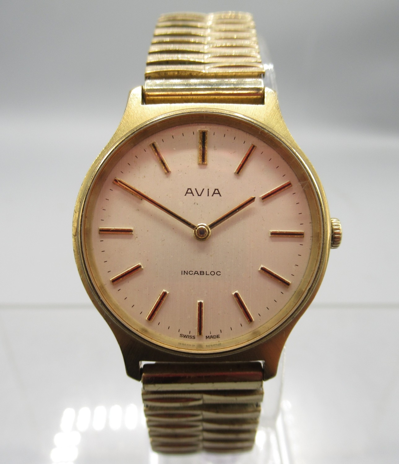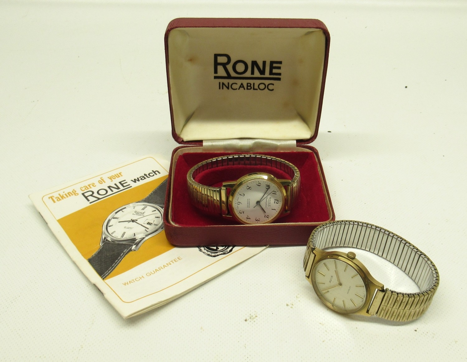 Rone Countryman gold plated wristwatch, signed white Arabic dial with centre seconds, screw on case back no. 1188CM, hand wound 17 jewel movement, D34.2mm with original box and guarantee and Avia gold plated hand wound wristwatch, D33.2mm