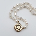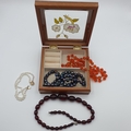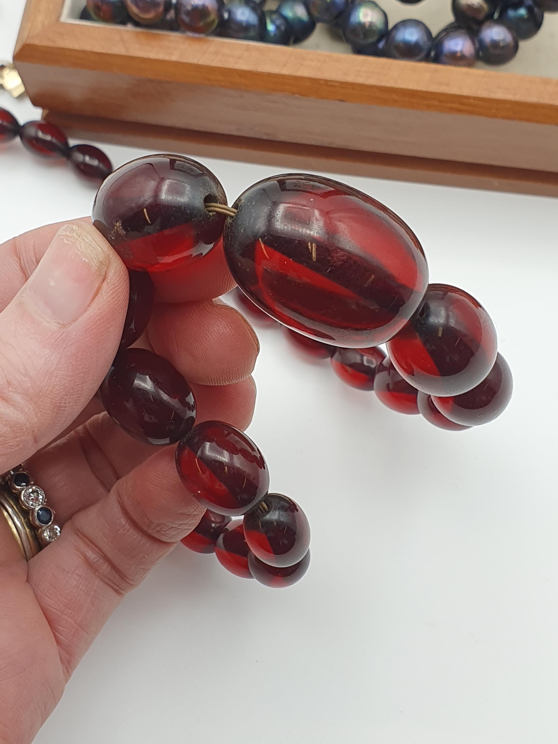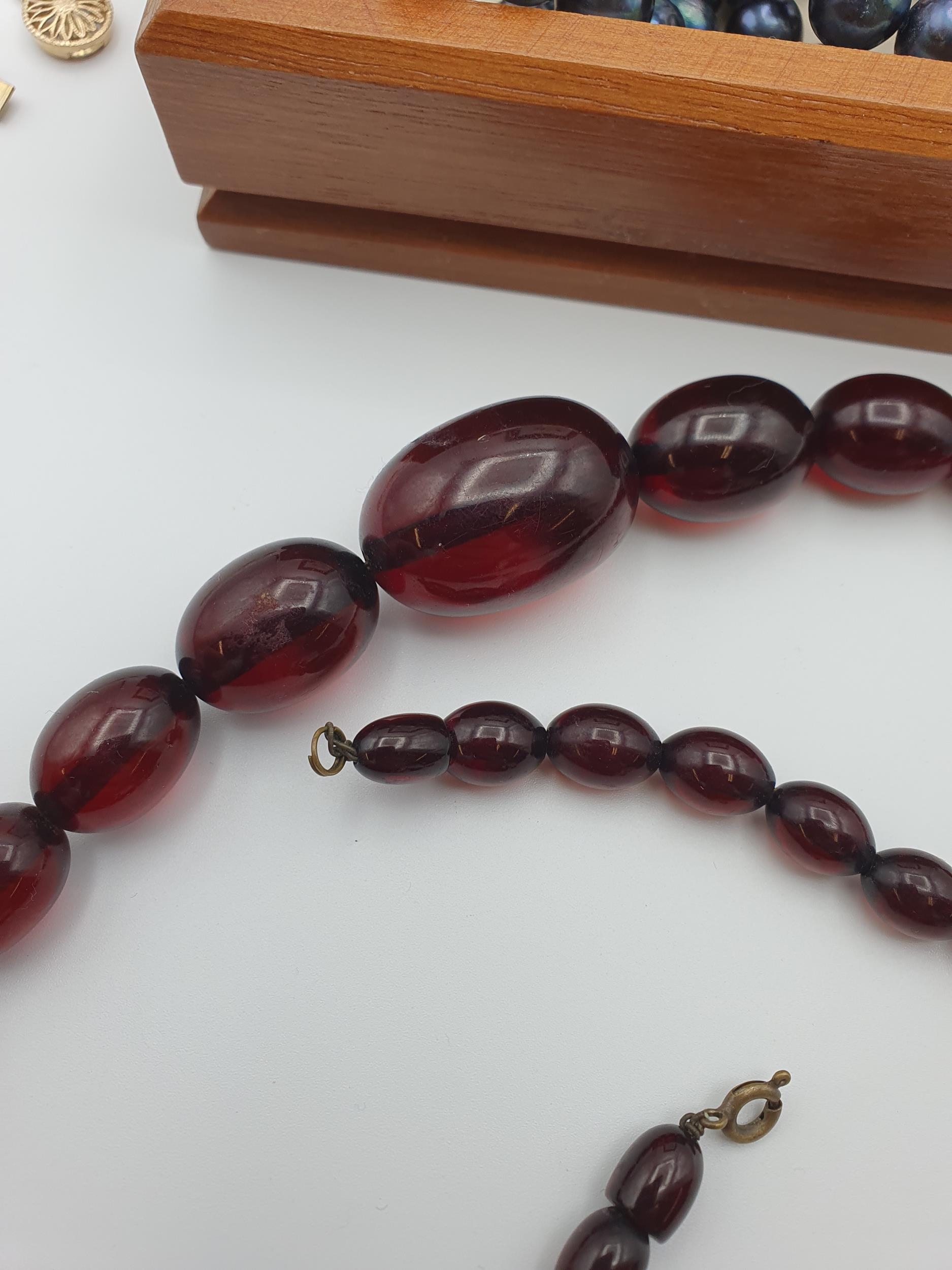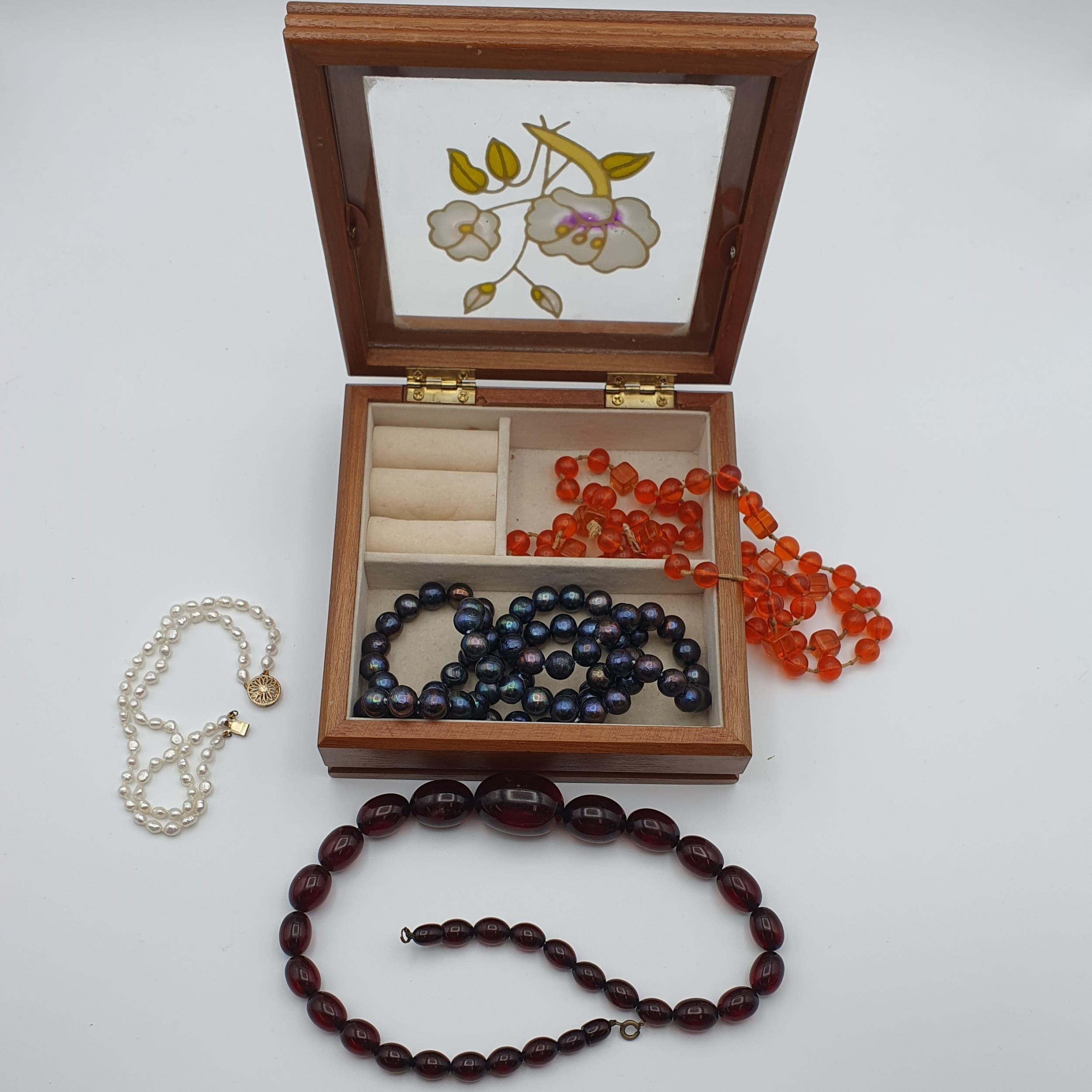 A Cherry Amber type/ Bakelite style Bead Necklace, a further orange bead Necklace, a black freshwater cultured pearl Necklace and a freshwater pearl Bracelet in a wooden Jewel Box