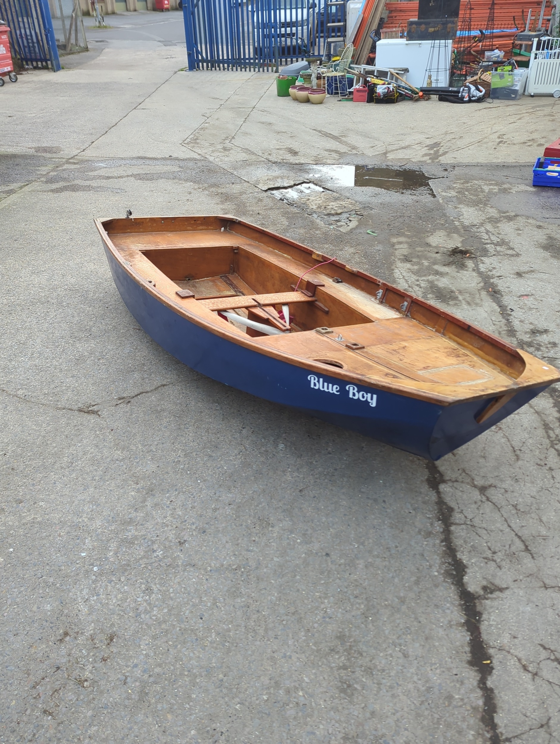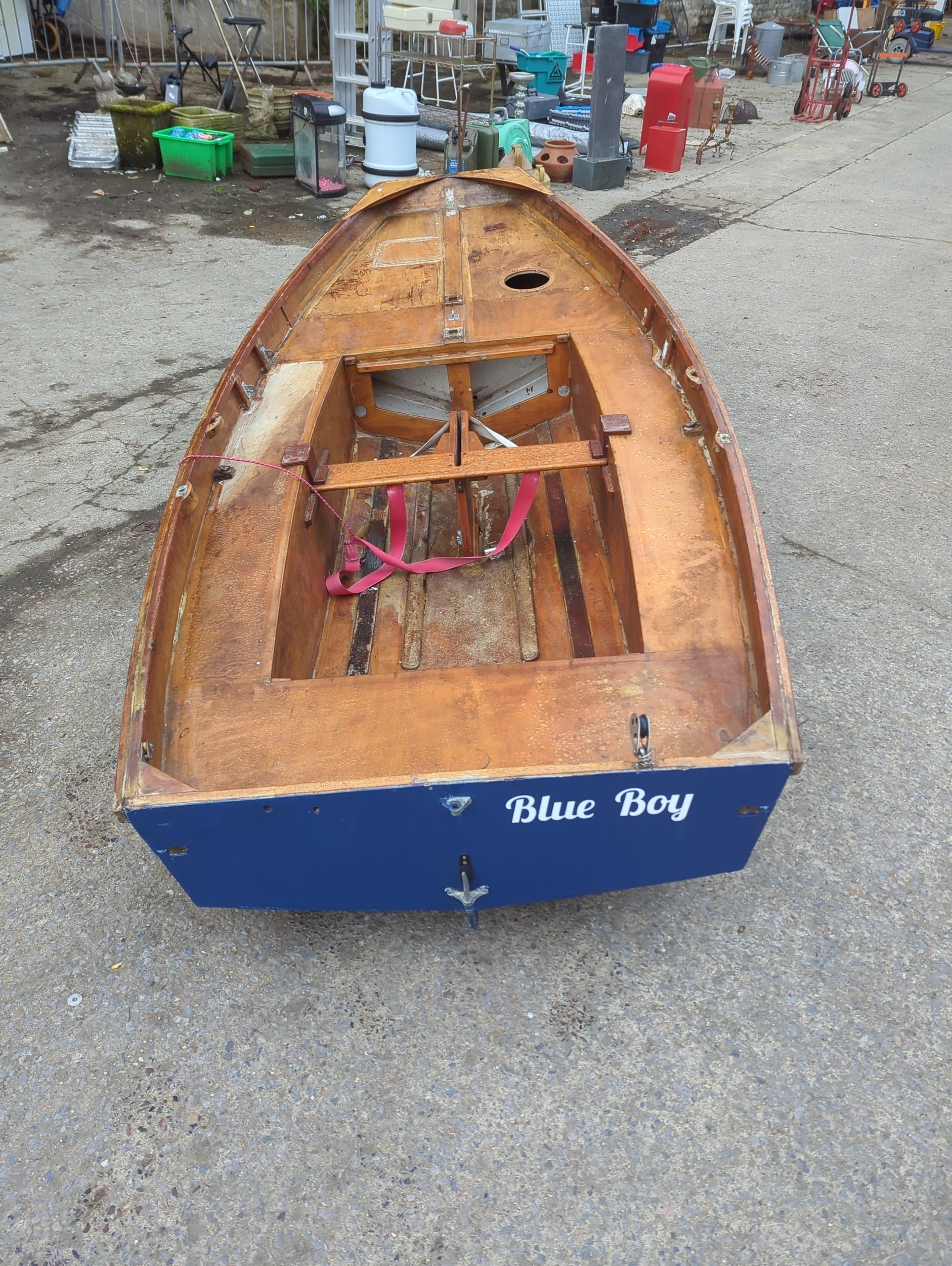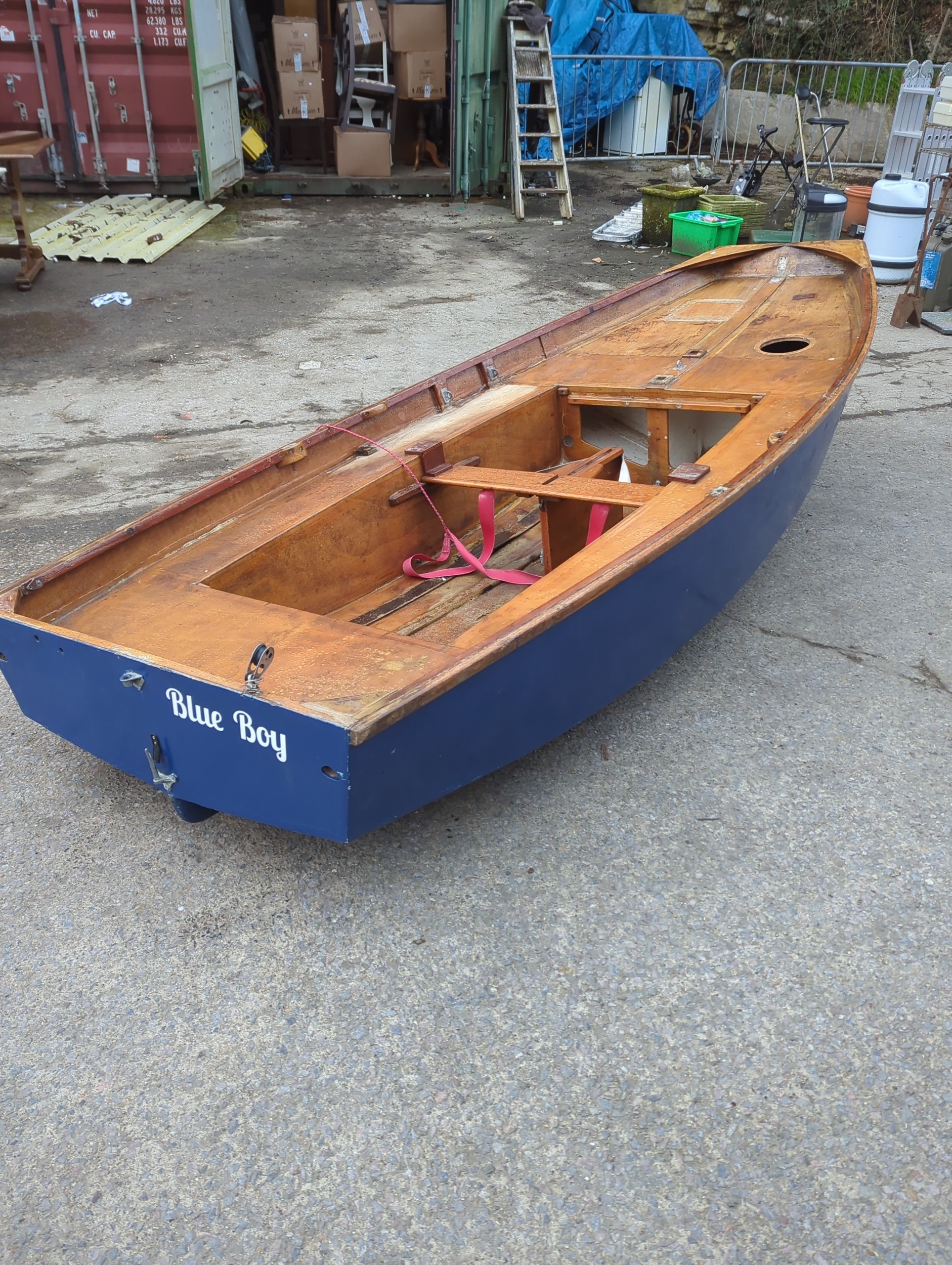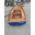 A small wooden dinghy named "Blue Boy" with a blue exterior hull and a varnished wooden interior. This boat features a basic open design, suitable for leisure activities on calm waters. The inside shows traditional wooden construction with visible reinforcements and a seating arrangement.