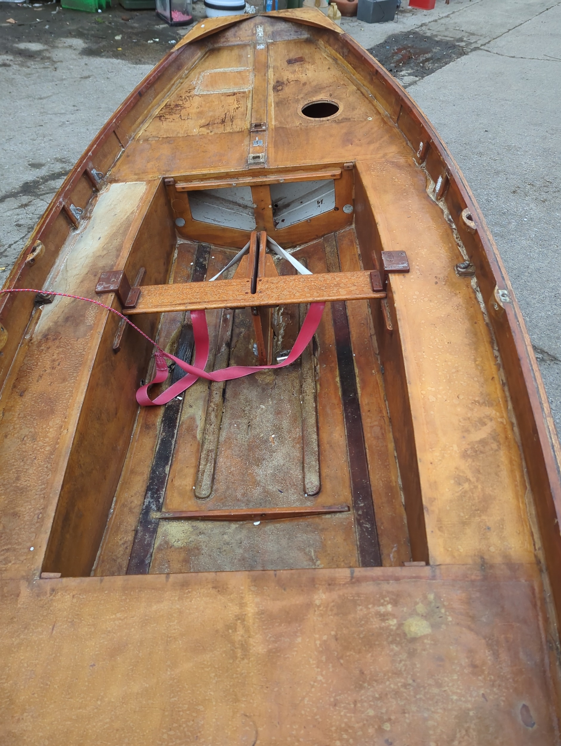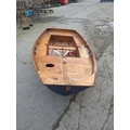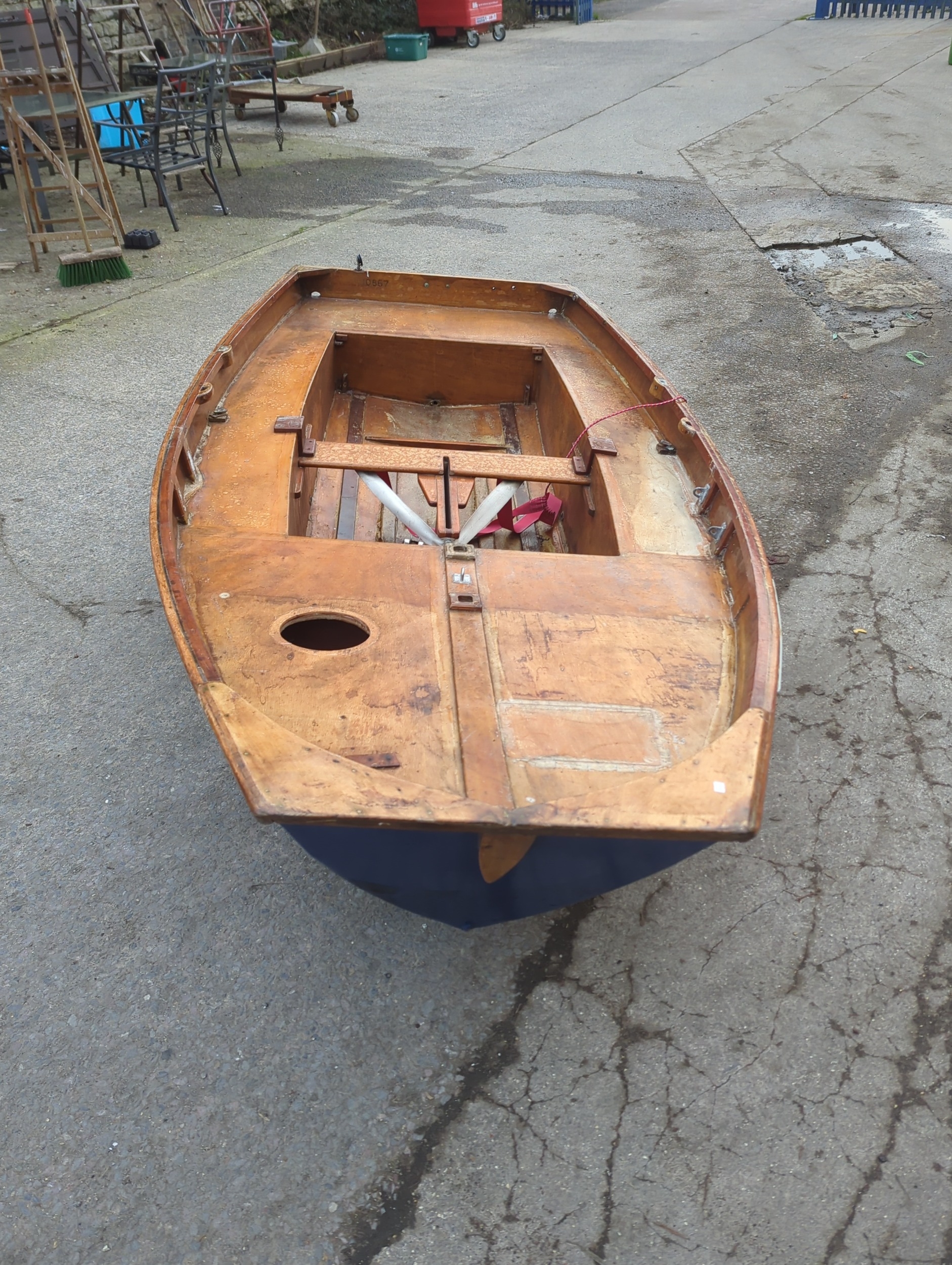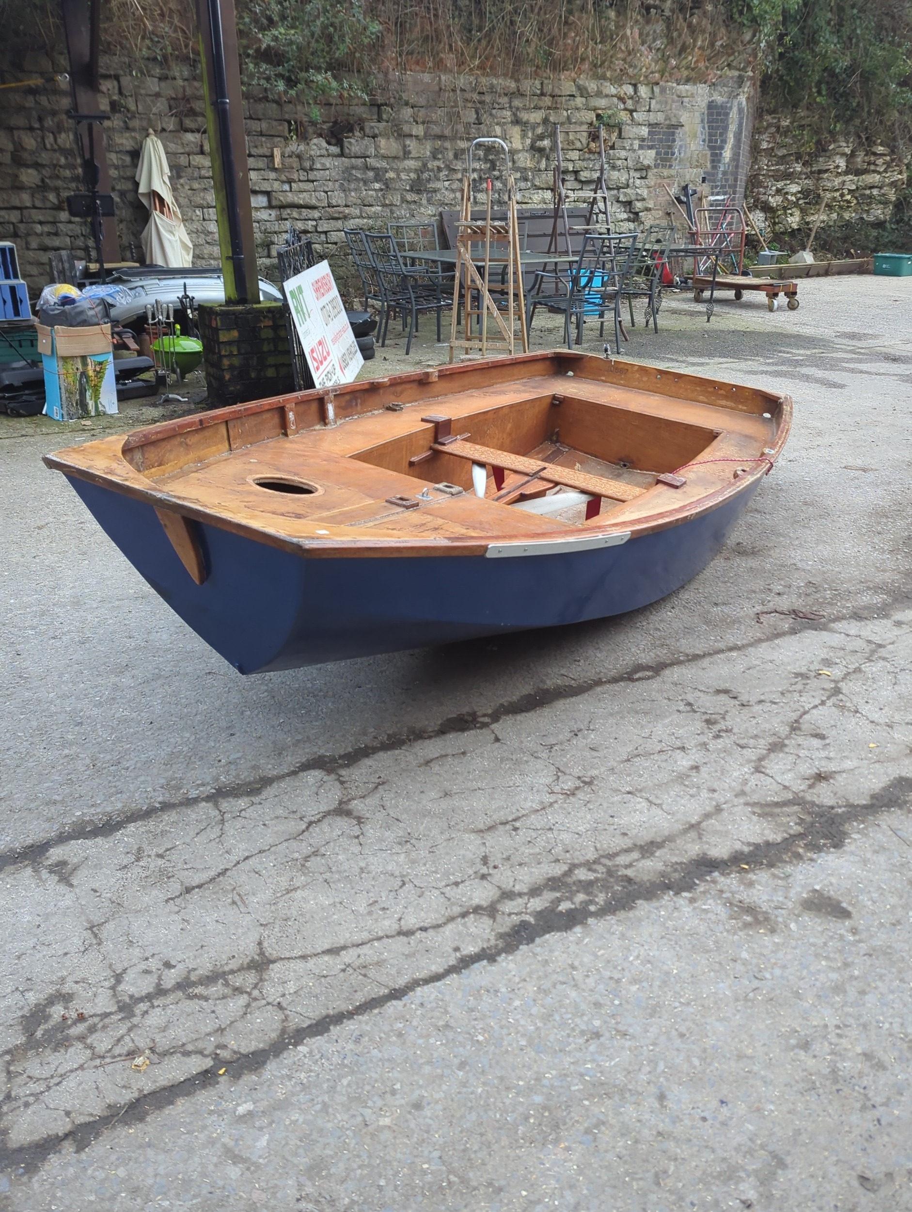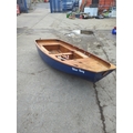 A small wooden dinghy named "Blue Boy" with a blue exterior hull and a varnished wooden interior. This boat features a basic open design, suitable for leisure activities on calm waters. The inside shows traditional wooden construction with visible reinforcements and a seating arrangement.
