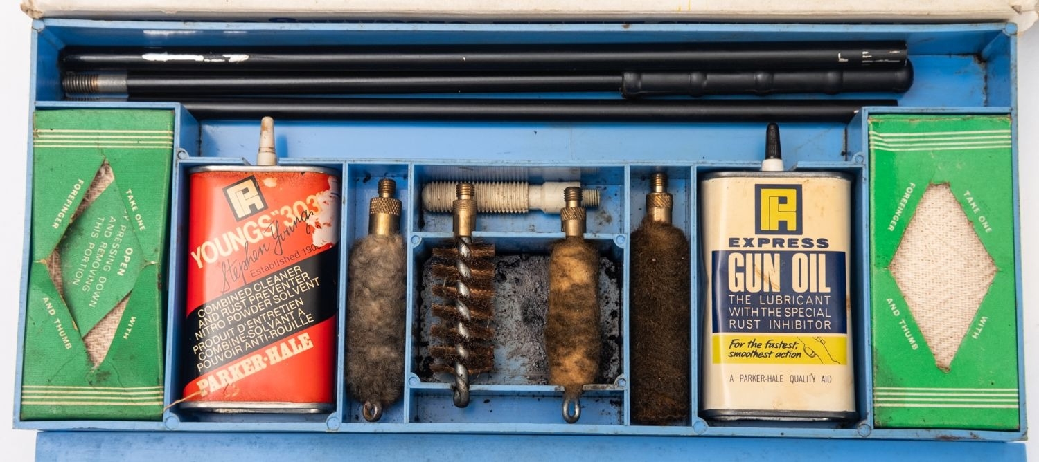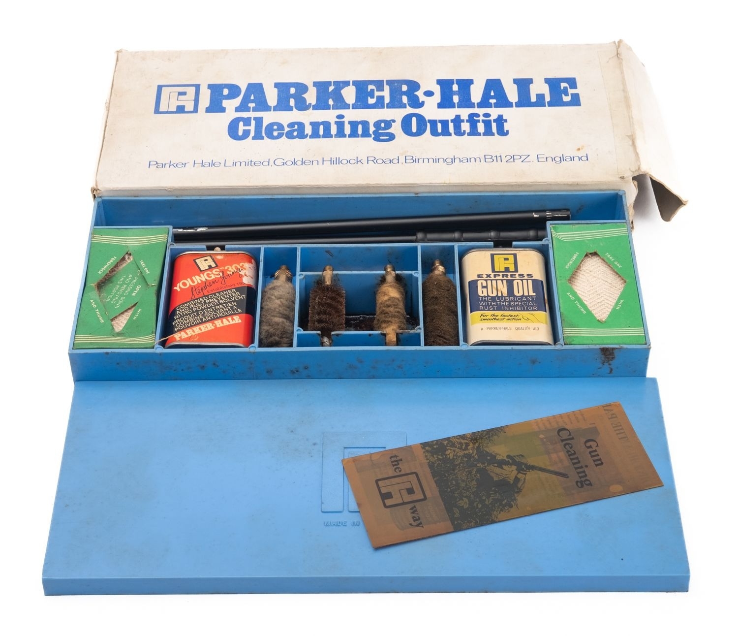 A Parker Hale 12 gauge shotgun cleaning kit. Comprising brushes and oil etc in original box.