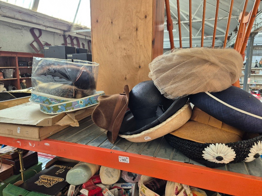 A collection of ladies hats, gents trilby and bowler hat