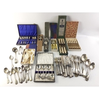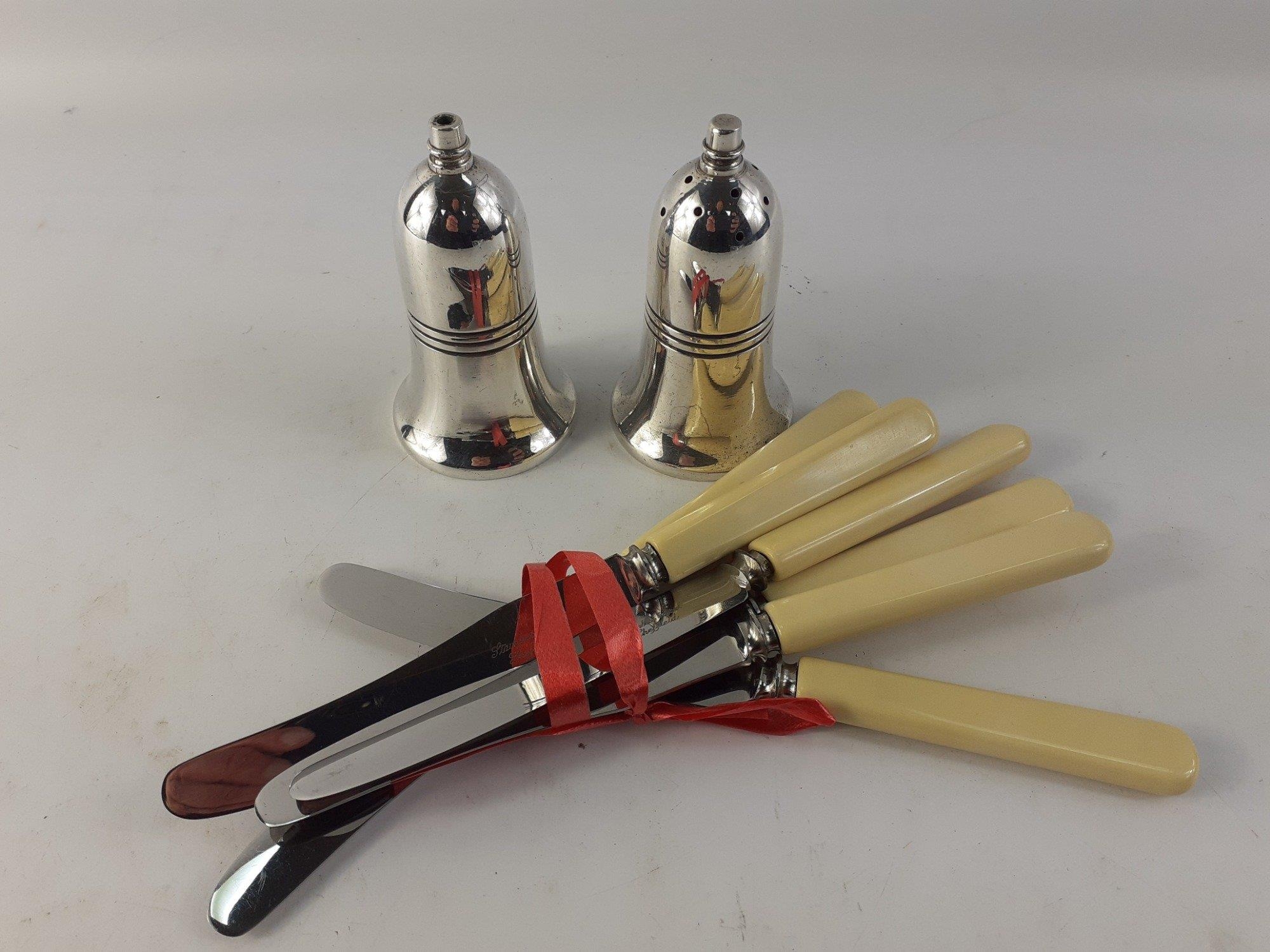 A heavyweight EPNS cruet set of salt and pepper, and a set of 6 Sheffield butter knives