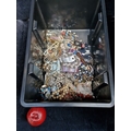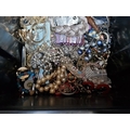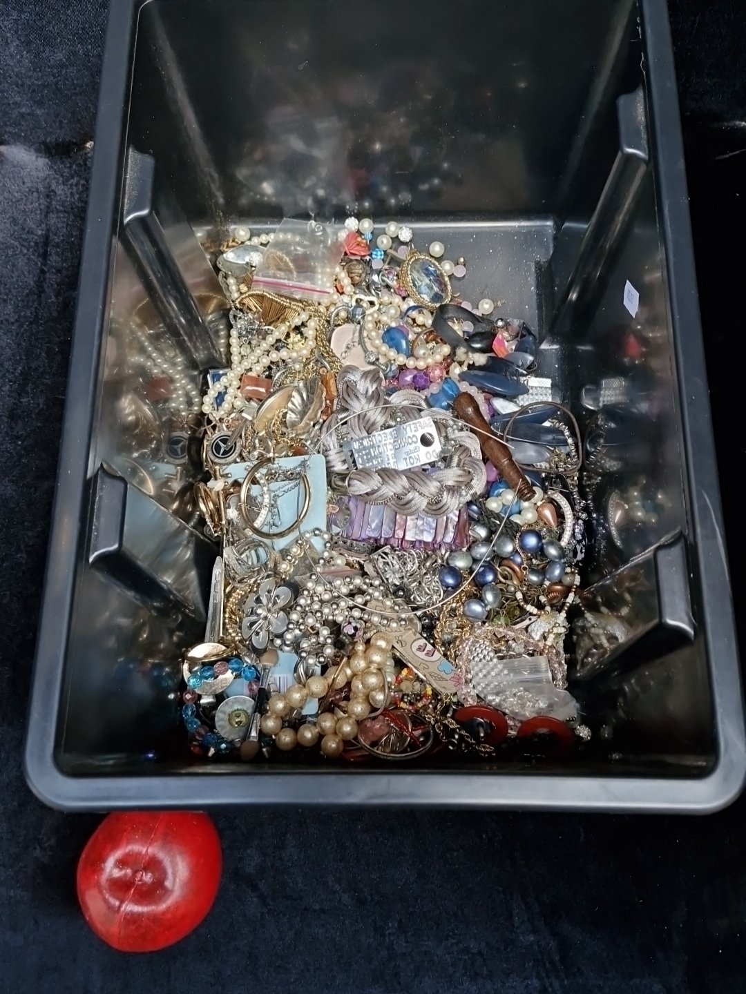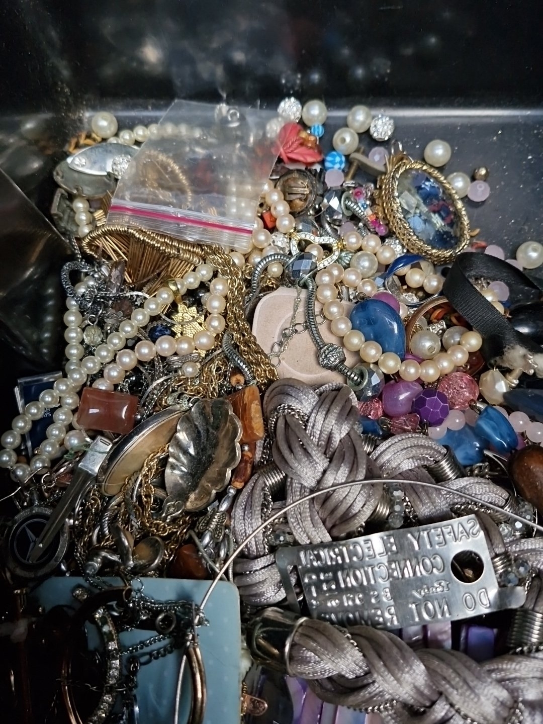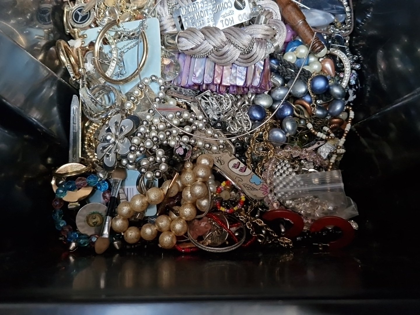 A group of costume jewellery, including imitation pearl necklaces, metal chains, bangles, brooches and assorted beadwork, with a few pieces bagged; various base-metal and glass elements in mixed styles.