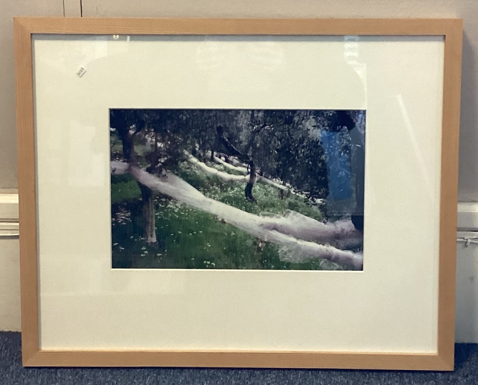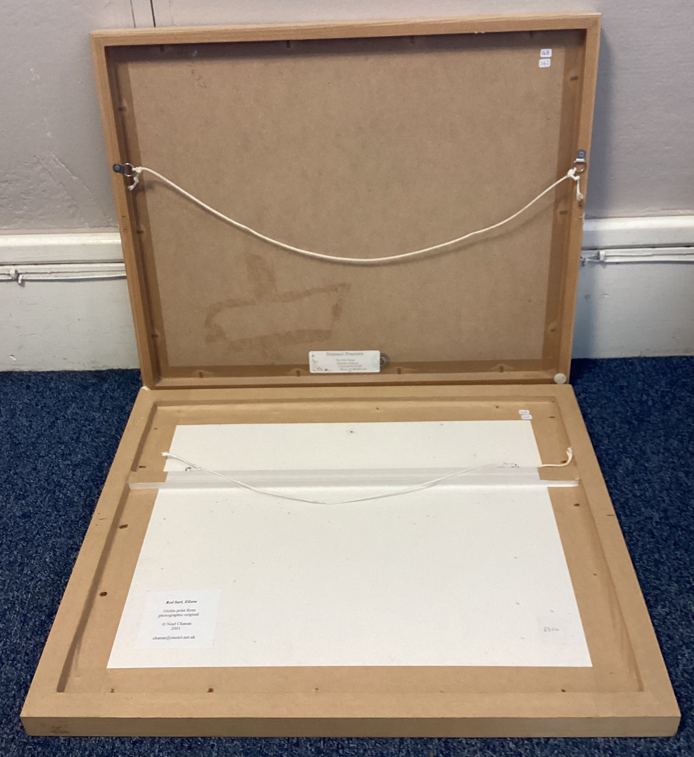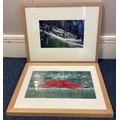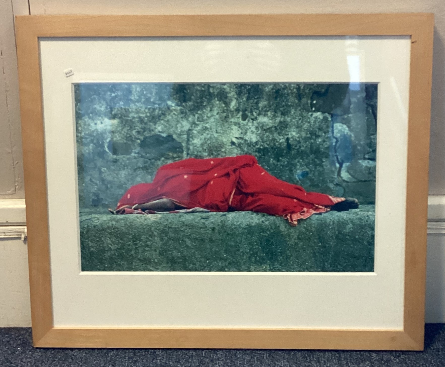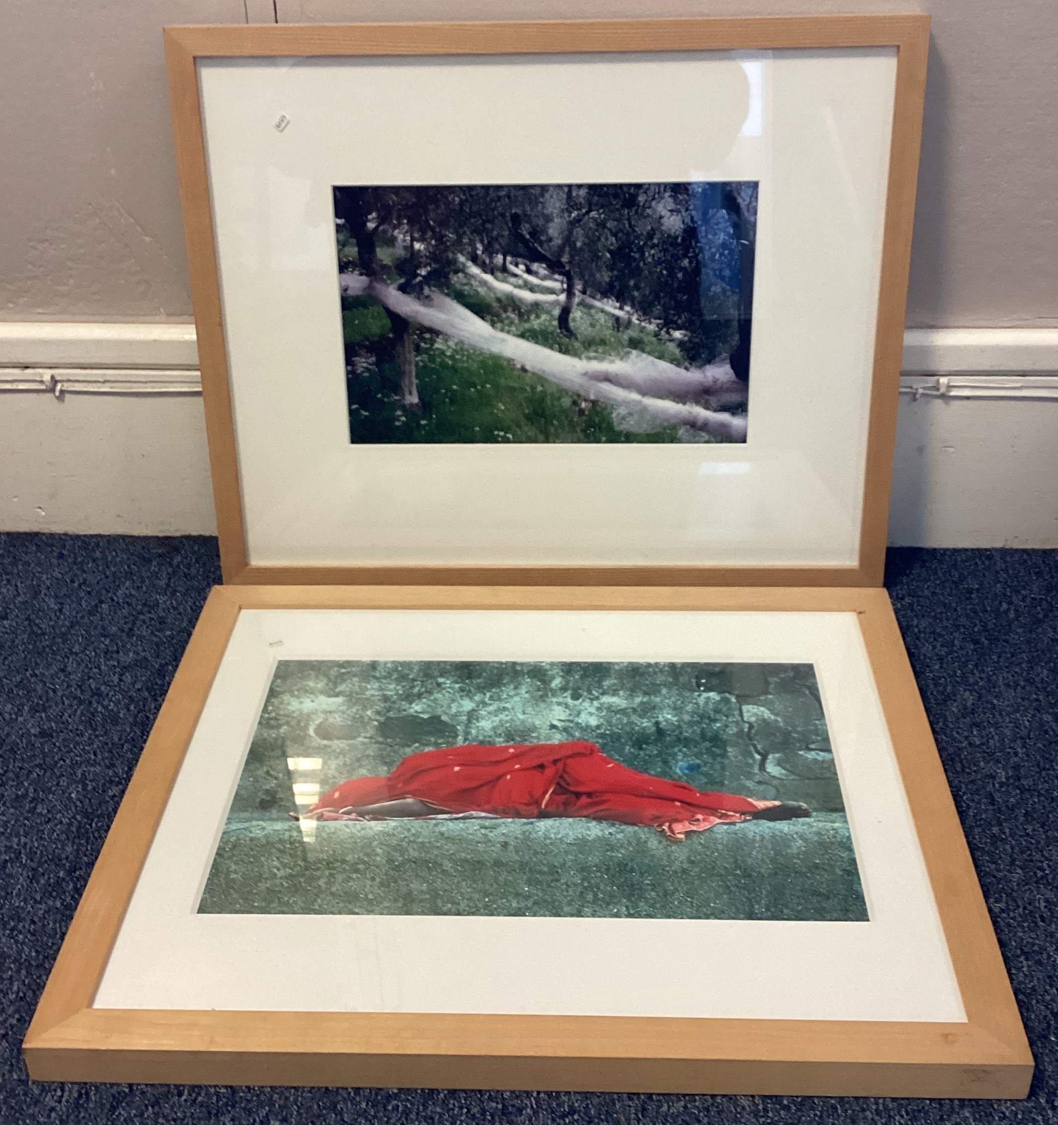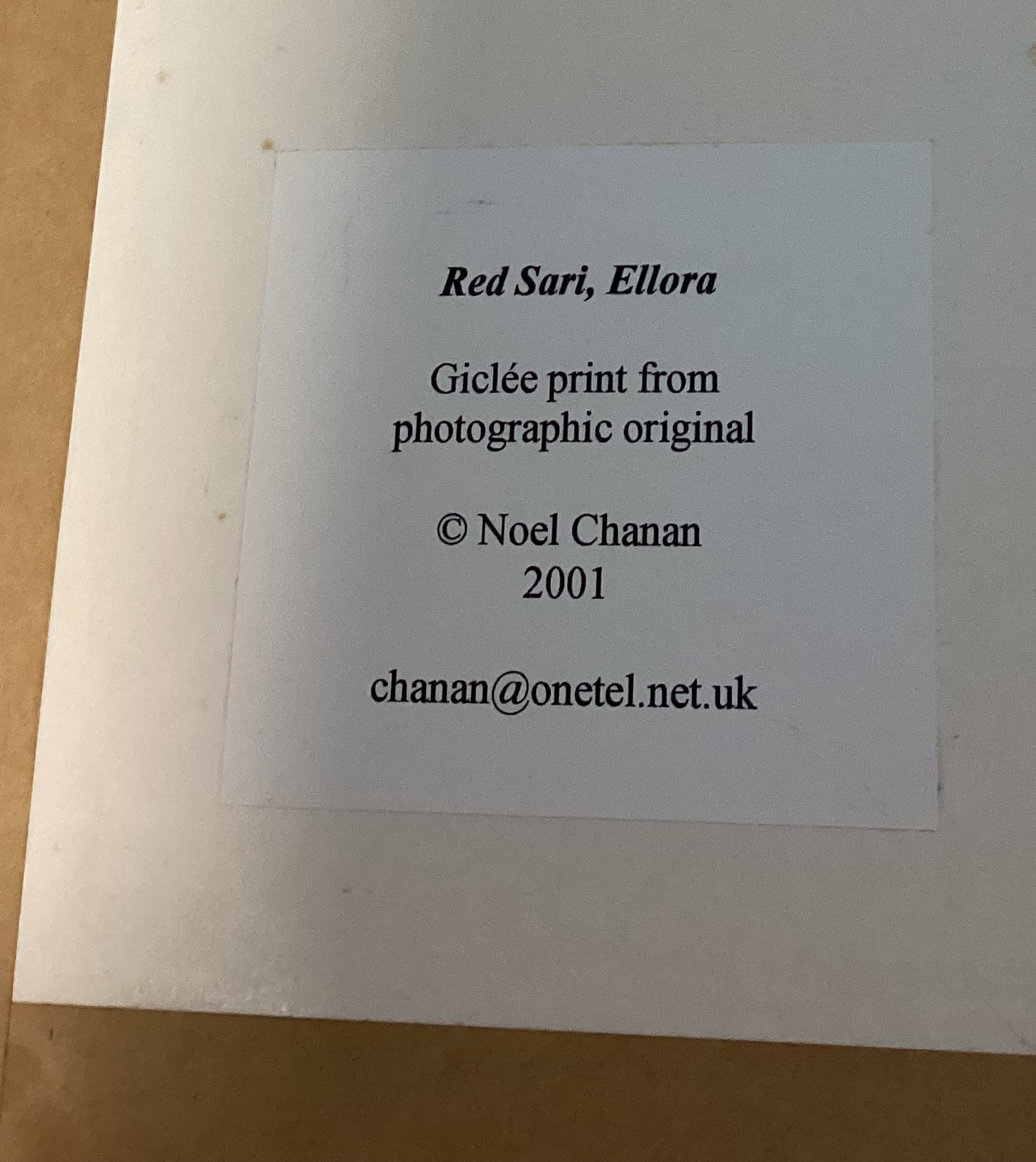 NOEL CHANAN: (British, b. 1939): A framed and glazed giclée print from photographic original entitled 'Red Sari, Ellora' depicting an Indian woman in reclining position. Labelled verso. Approx. 44 cm x 28.5 cm (ss). Together with another depicting catching nets in an olive grove. Approx. 35 cm x 22 cm (ss). PROVENANCE: NOEL CHANAN. Est. £20 - £30.