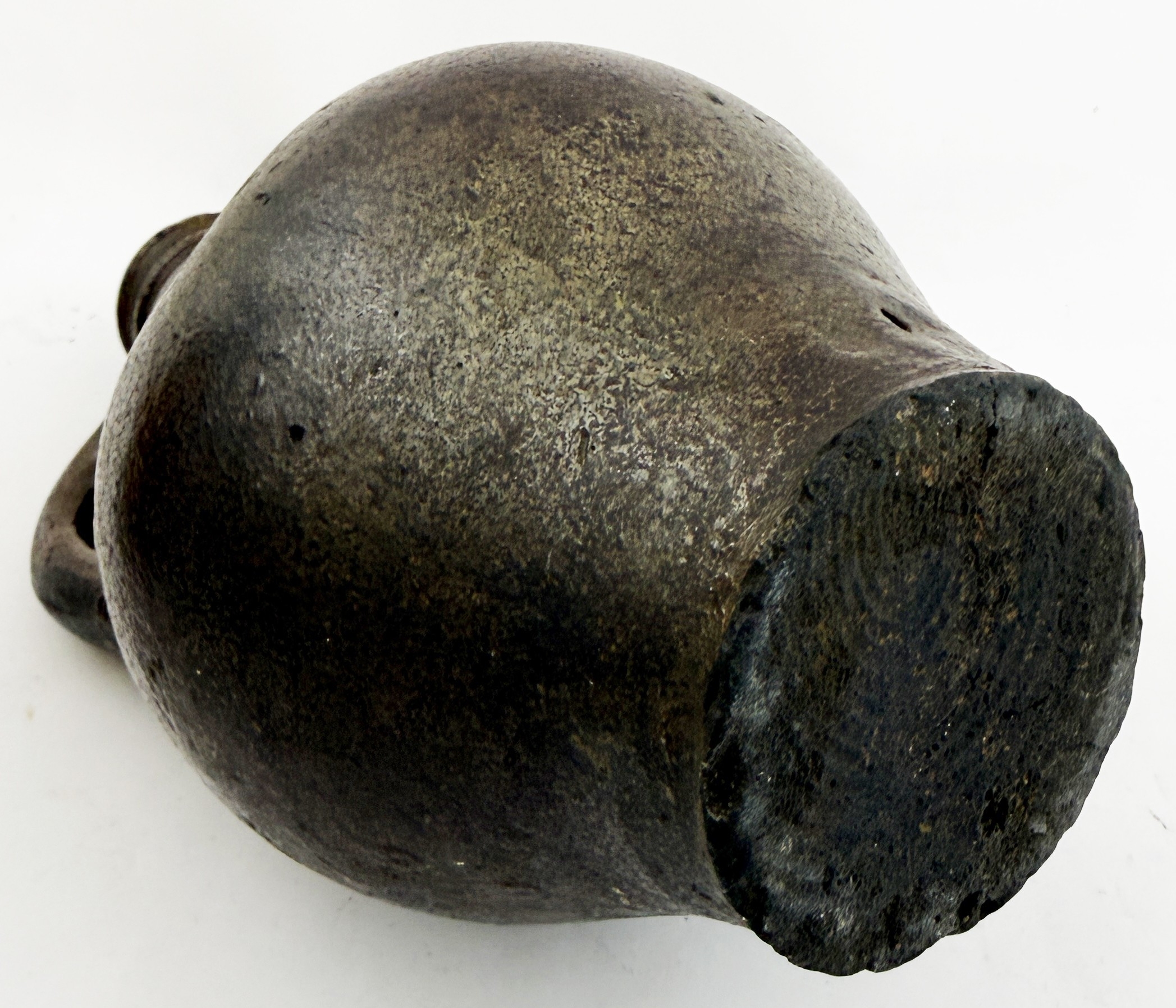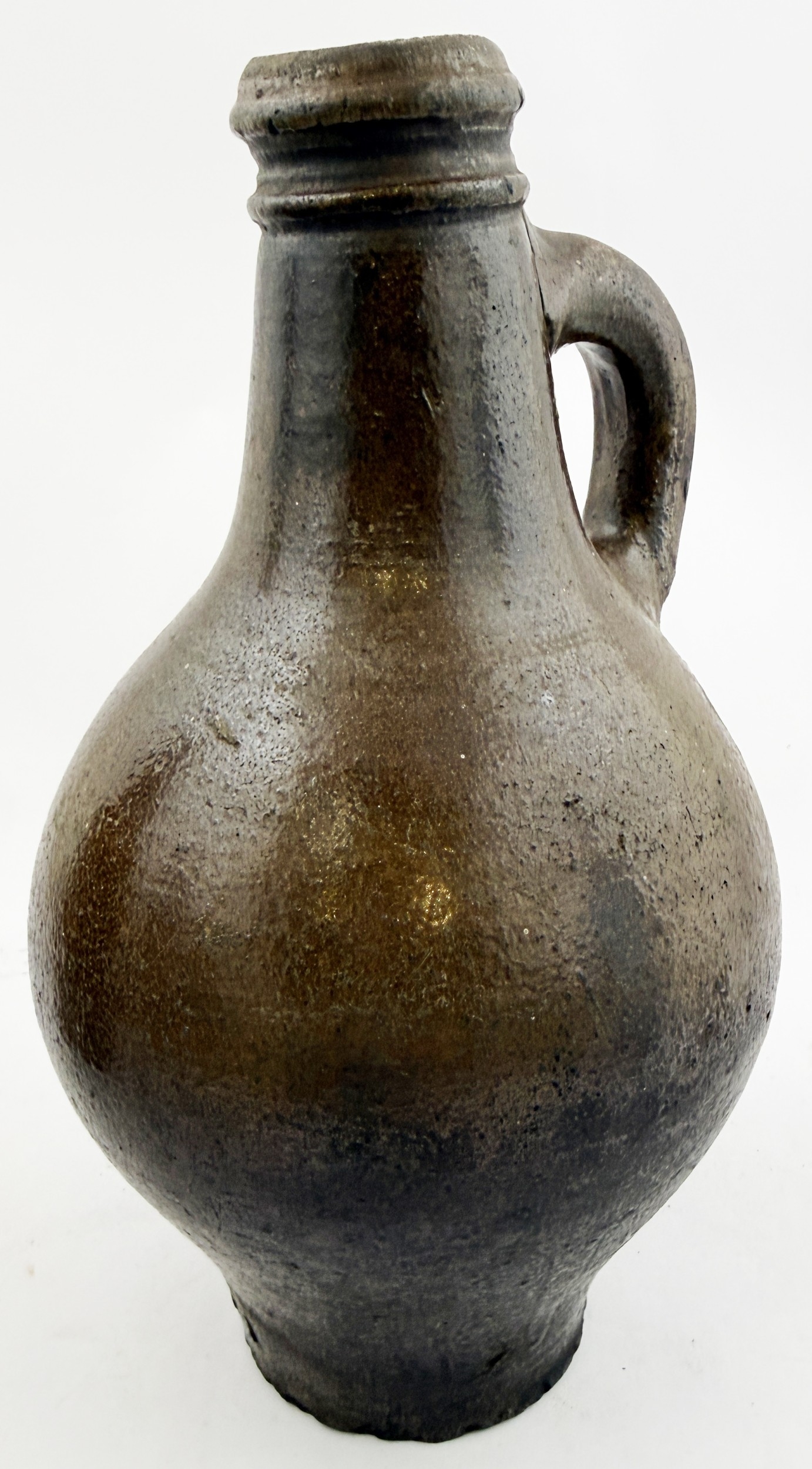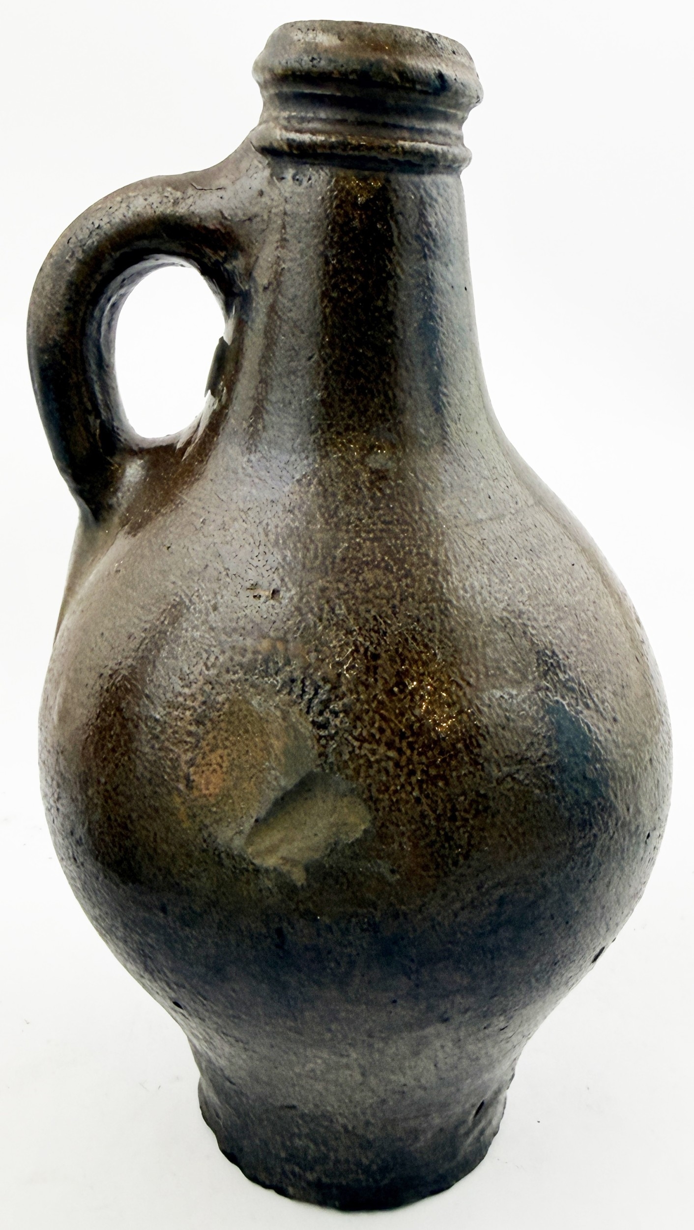 BELLARMINE.8.5ins. Dark salt glaze bellarmine jug, wire cut base, small kiln touch to one side but otherwise undamaged with no restoration. A decent example.