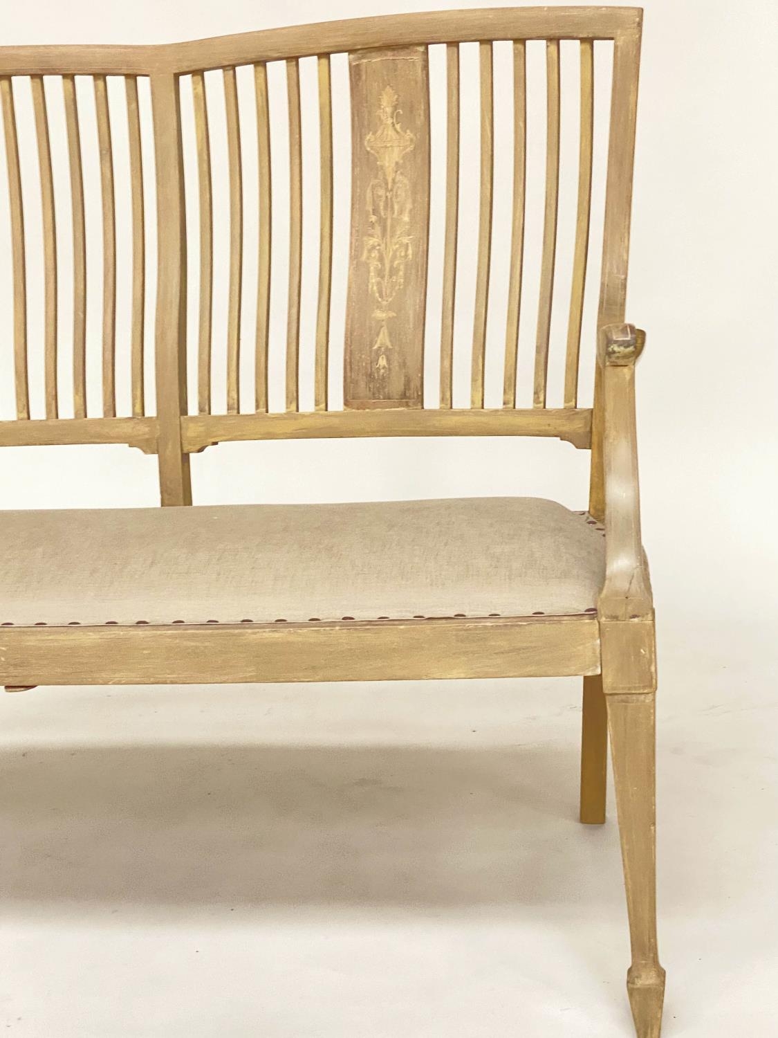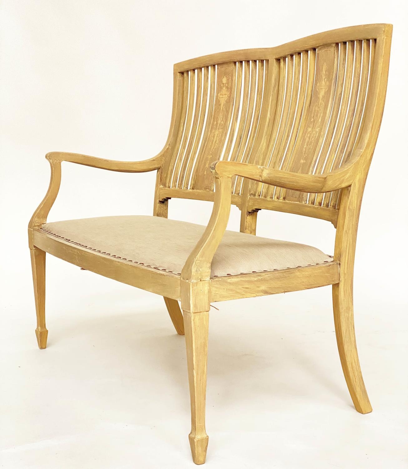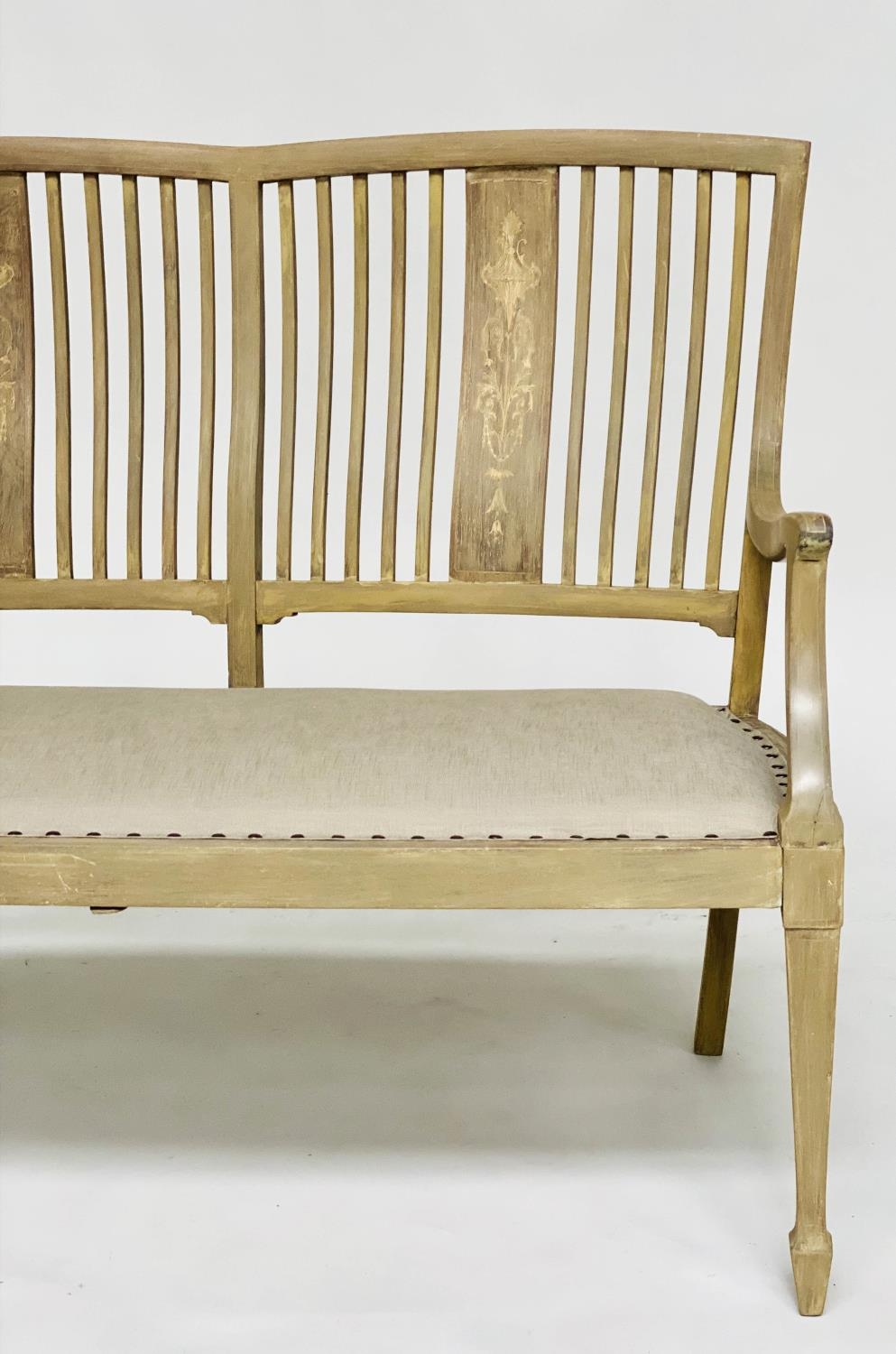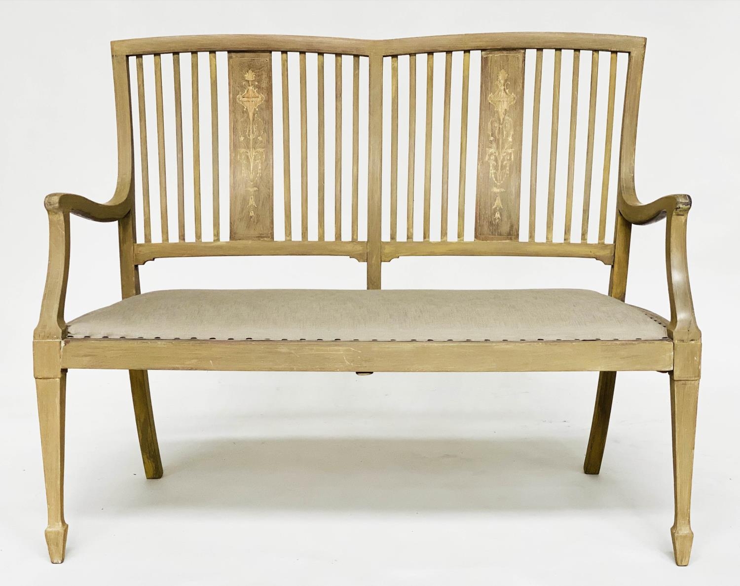 HALL SEAT, Edwardian mahogany and satinwood inlay with rail and marquetry splat back, and studded linen upholstered seat, 108cm W.