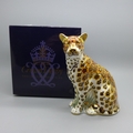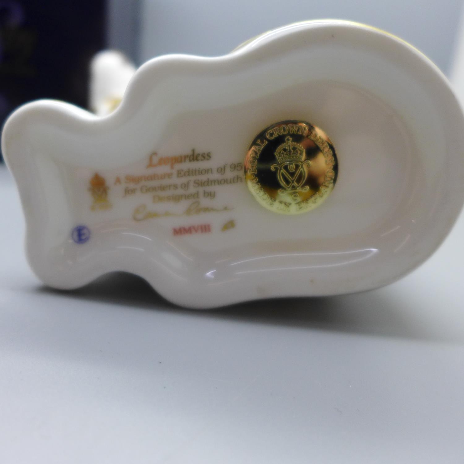A Royal Crown Derby paperweight - Leopardess, 13cm, commissioned by Goviers of Sidmouth, one of a limited edition of 950, the base is signed in gold by designer Carmen Roome, gold stopper and certificate, boxed