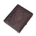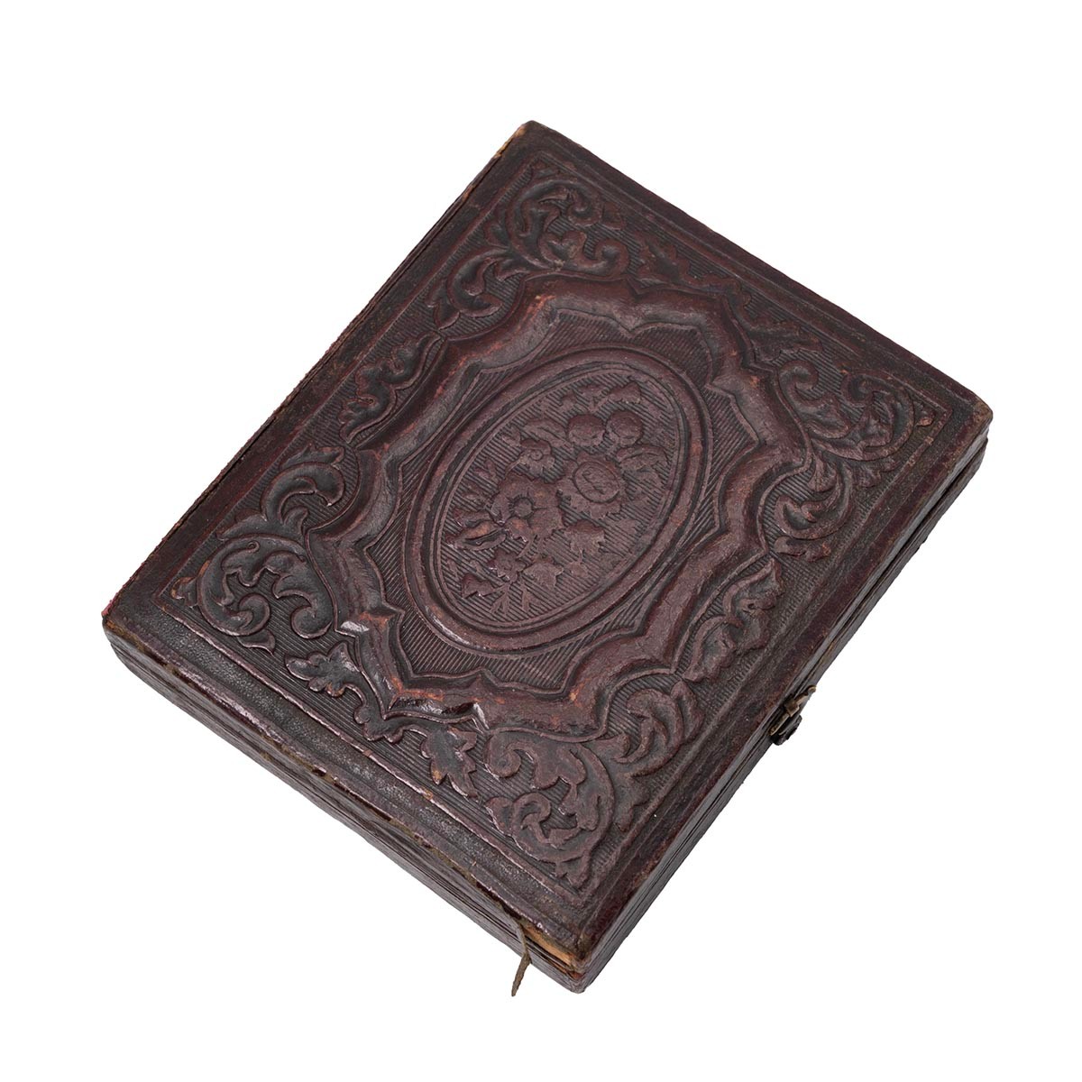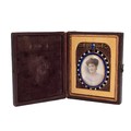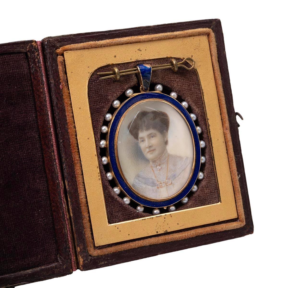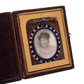 A late 19th century portrait of a female in a cobolt blue enamel and seed pearl locket, with further portrait to the verso, set in a tooled leather fitted traveling case.