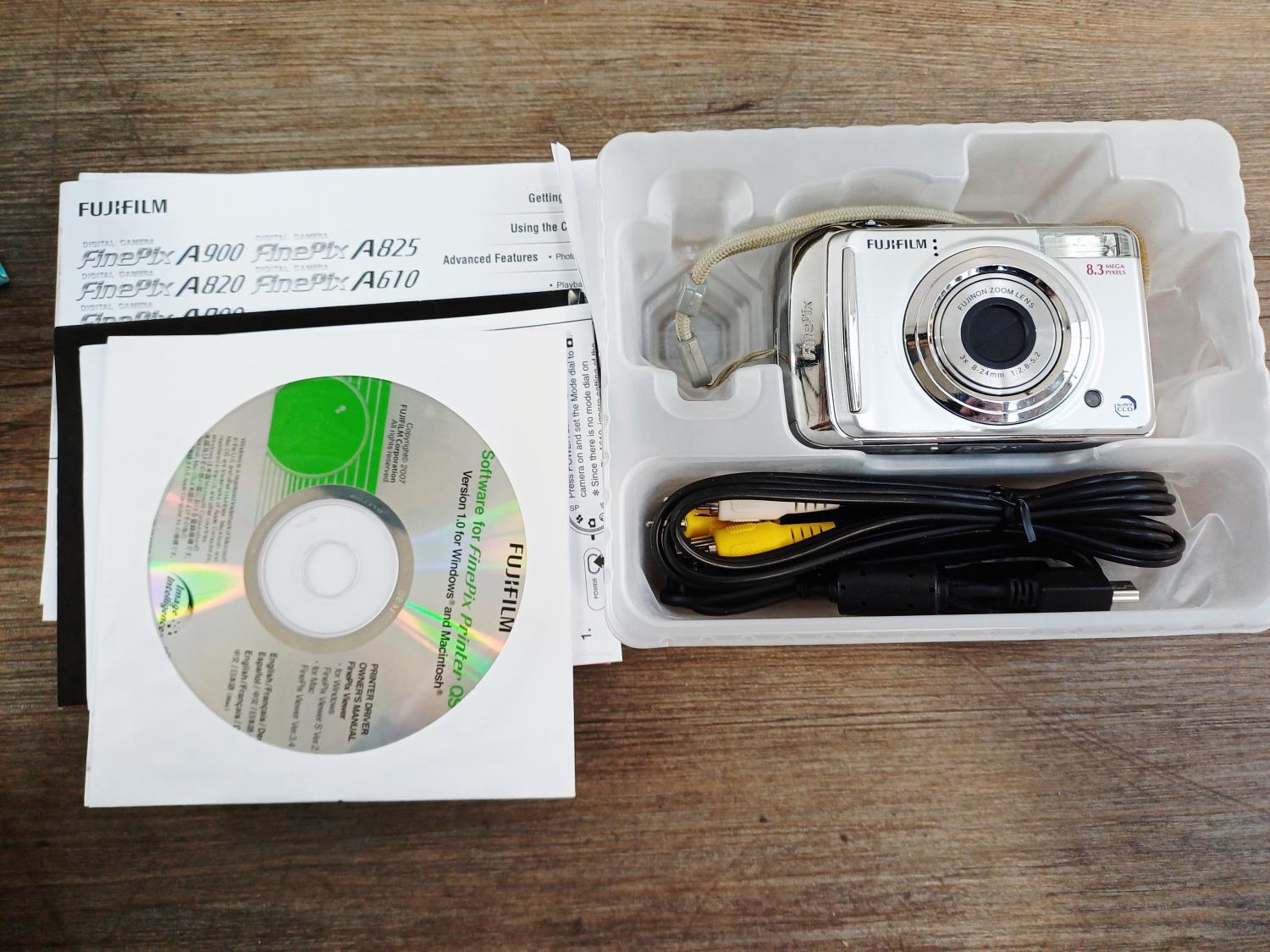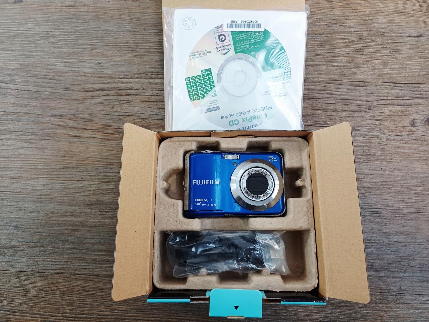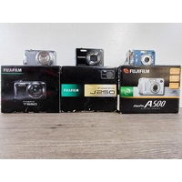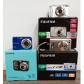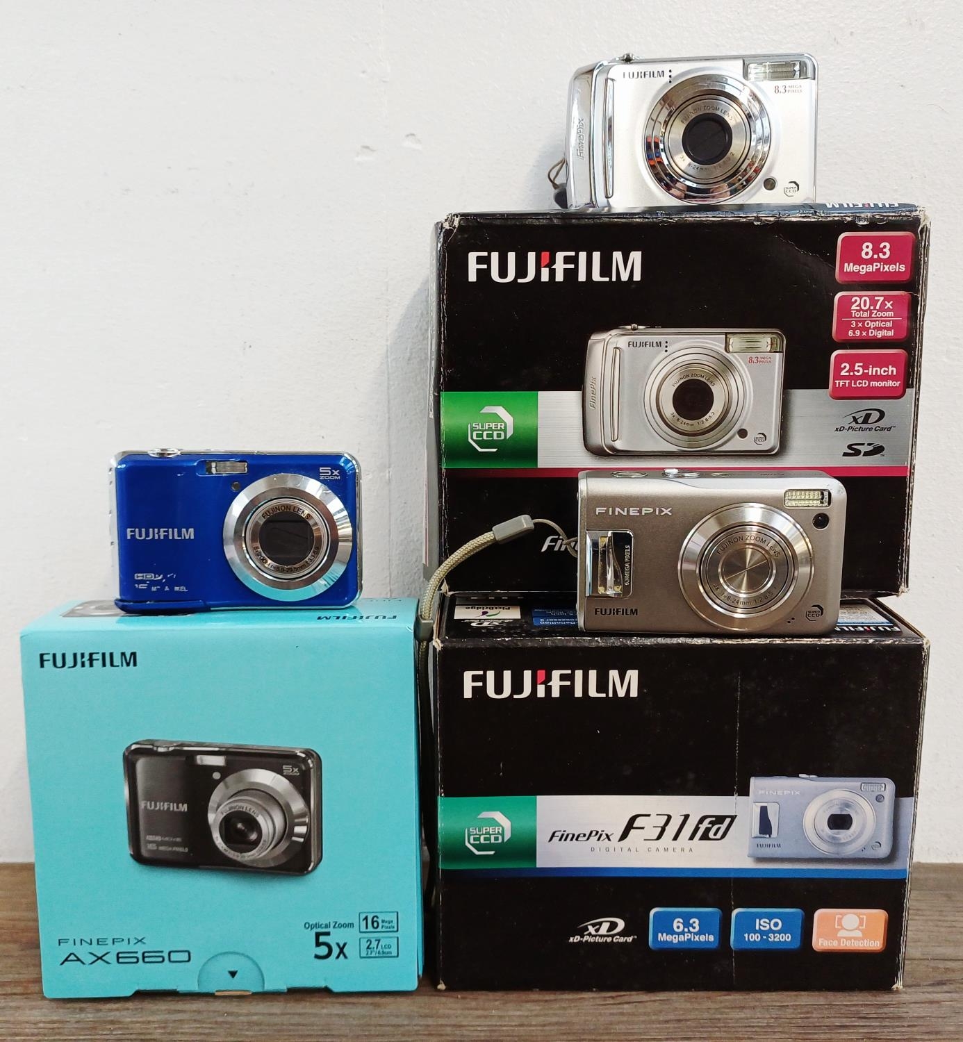 Three boxed Fujifilm FinePix compact digital cameras, one AX660 16mp, one A800 8.3mp and one F31fd 6.3mp