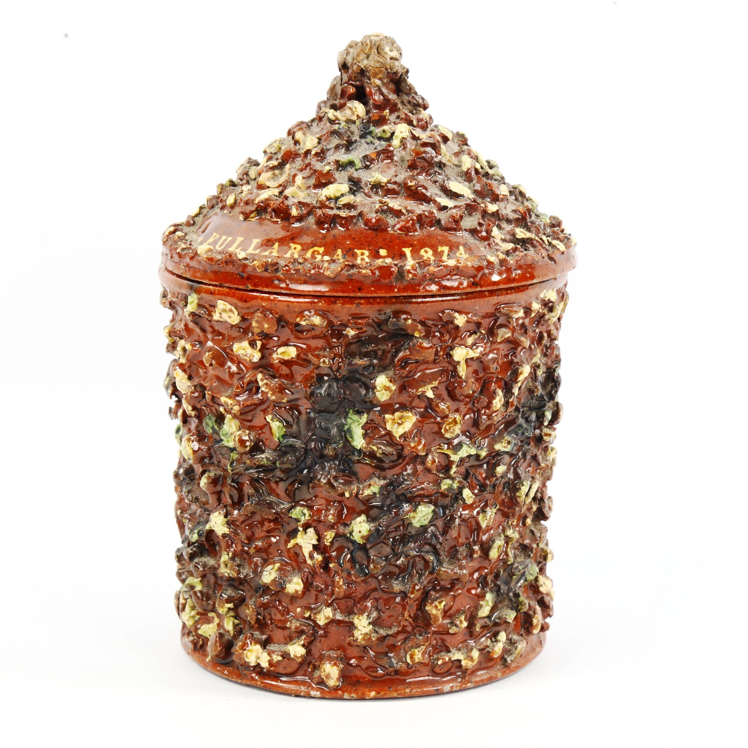 A 19th century slipware tobacco jar, probably Brede pottery, inscribed "A.Fullargar:1874", height 18cm