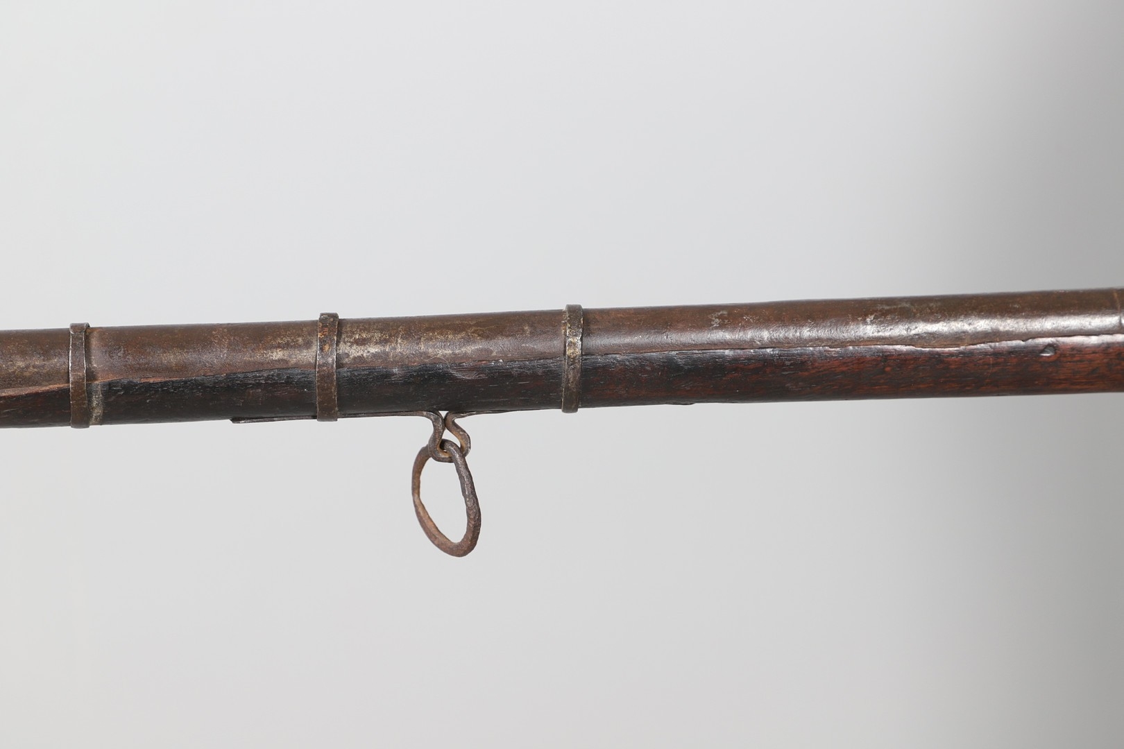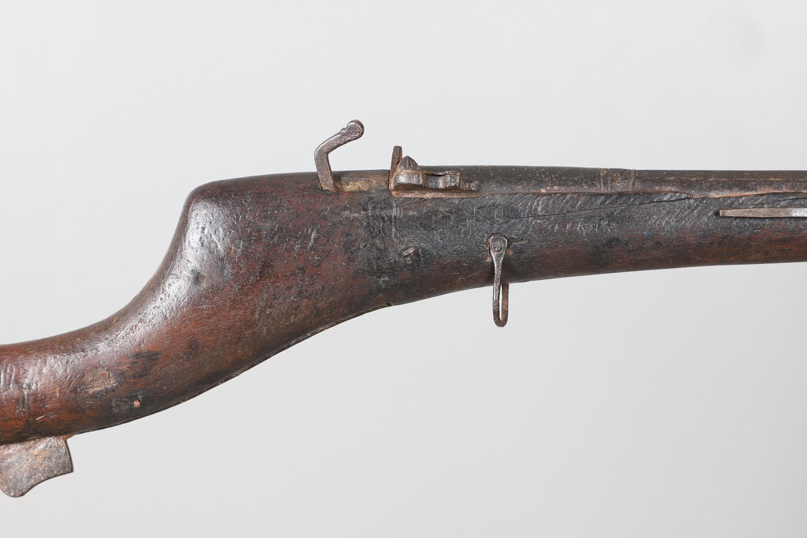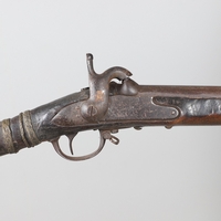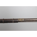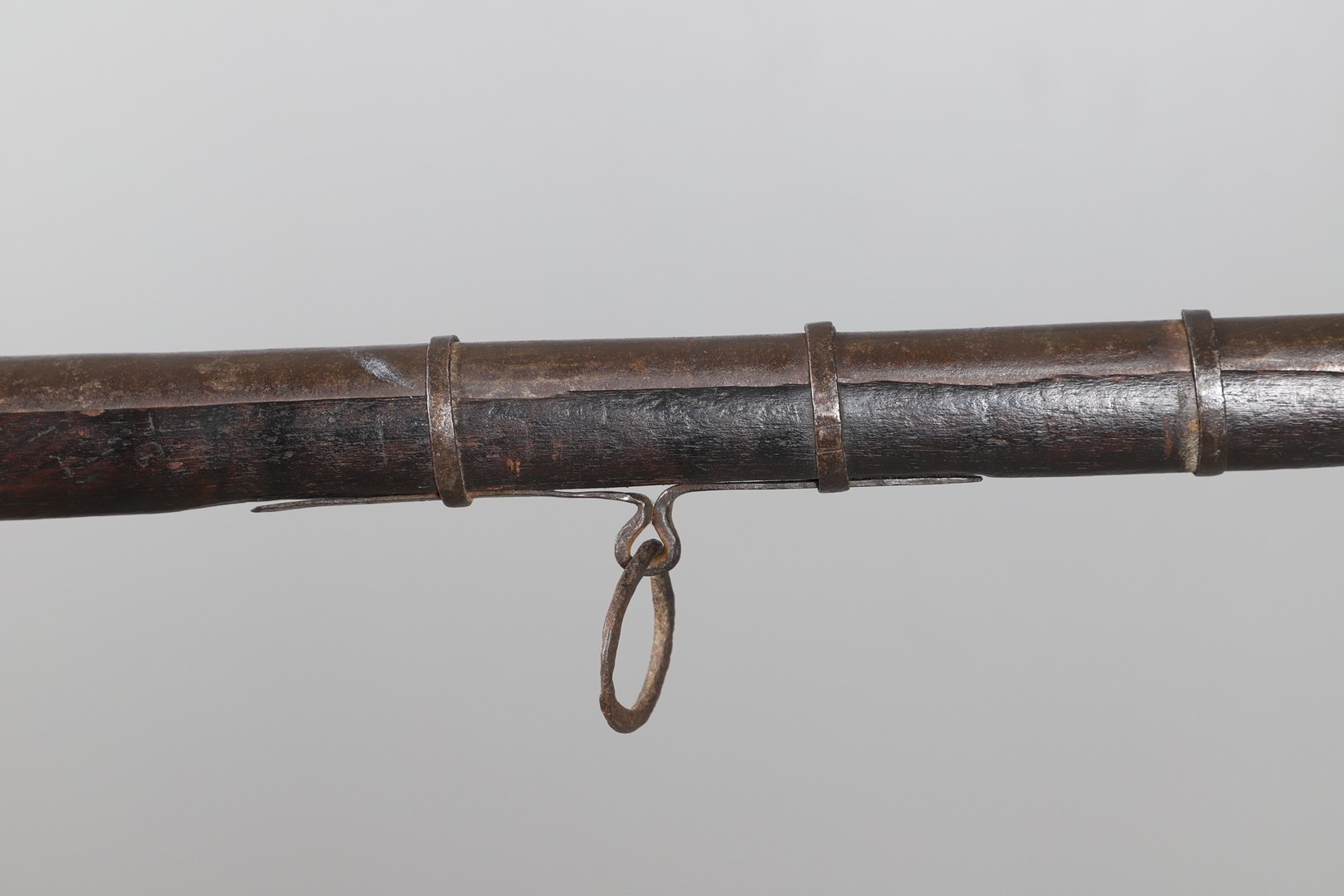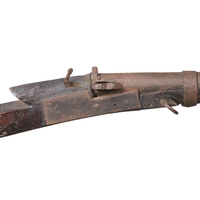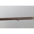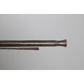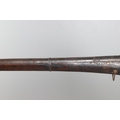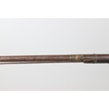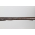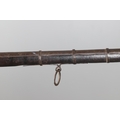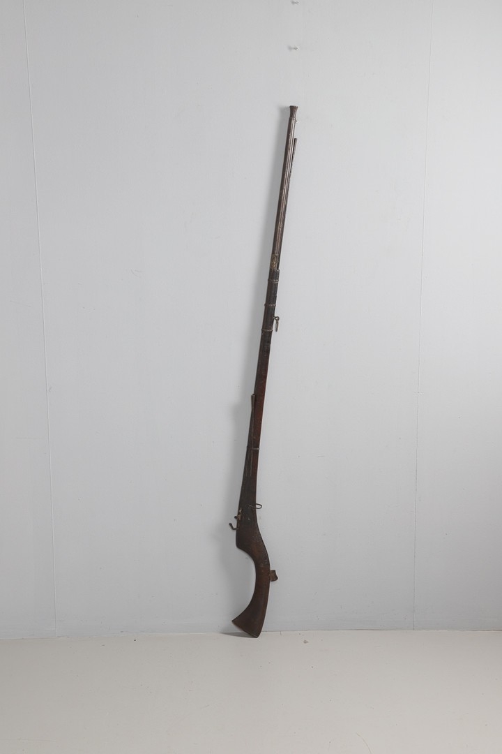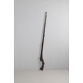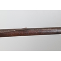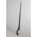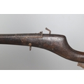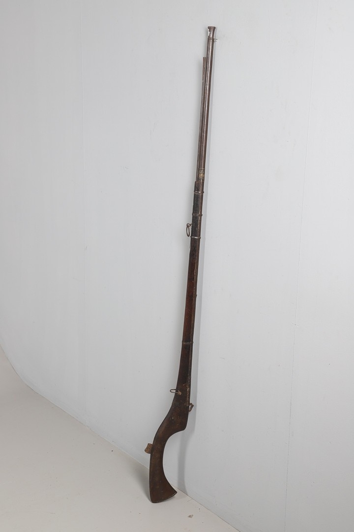 AN AFGHANISTAN JEZAIL MATCHLOCK LONG GUN. The 135 cm tapering barrel, slightly flared at the muzzle with a ram rod below. Fitted with a matchlock action and crooked stock and twin sling mounting points. 175 cm. With an unusual tool fitted beneath one of the metal 'capucine' mounting bands, perhaps a touch-hole prick and a match snuff or loading gauge. "What would seem to be a primitive weapon had a greater and more accurate range than the musket used by the British.".