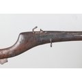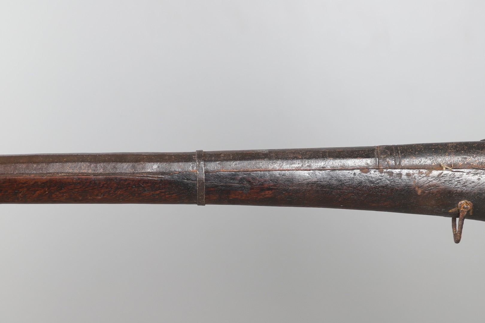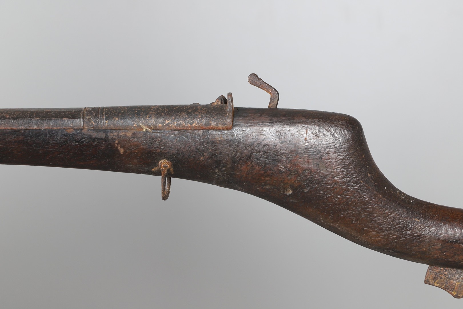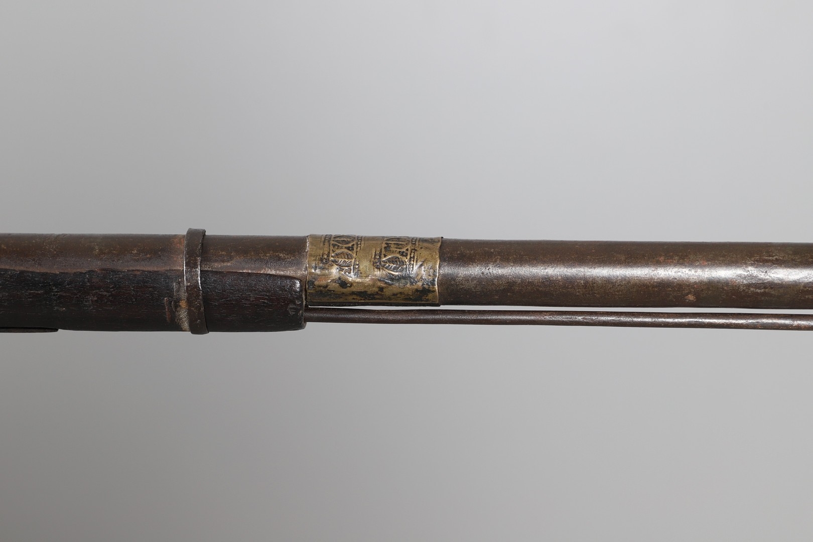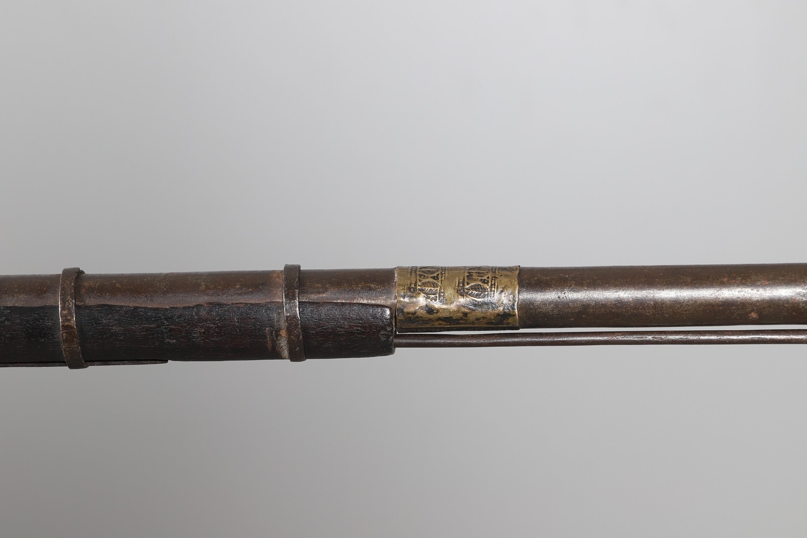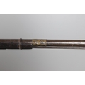 AN AFGHANISTAN JEZAIL MATCHLOCK LONG GUN. The 135 cm tapering barrel, slightly flared at the muzzle with a ram rod below. Fitted with a matchlock action and crooked stock and twin sling mounting points. 175 cm. With an unusual tool fitted beneath one of the metal 'capucine' mounting bands, perhaps a touch-hole prick and a match snuff or loading gauge. "What would seem to be a primitive weapon had a greater and more accurate range than the musket used by the British.".