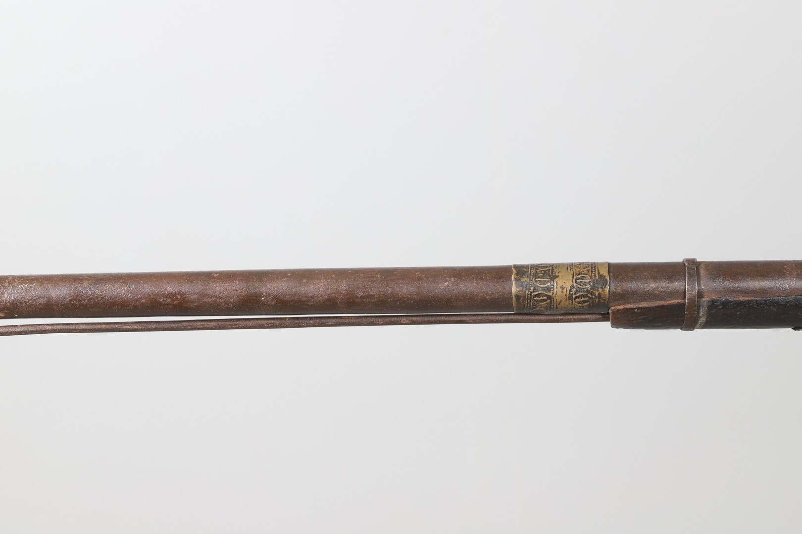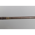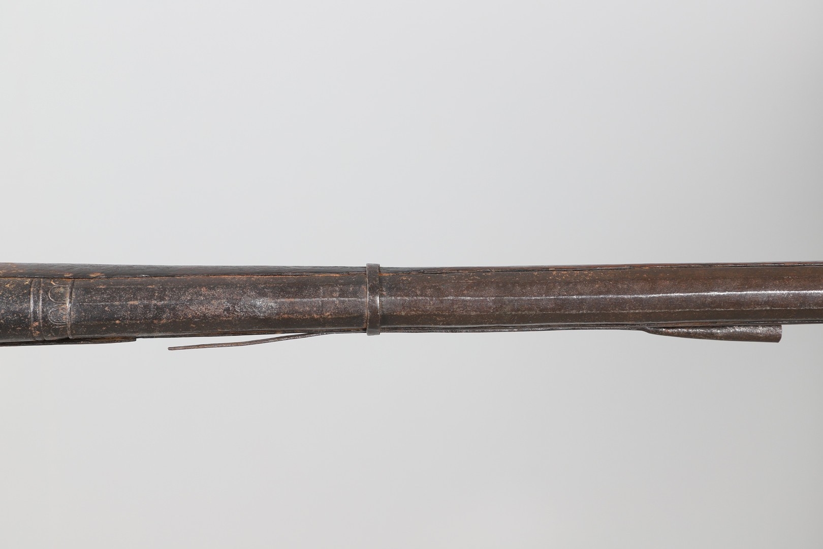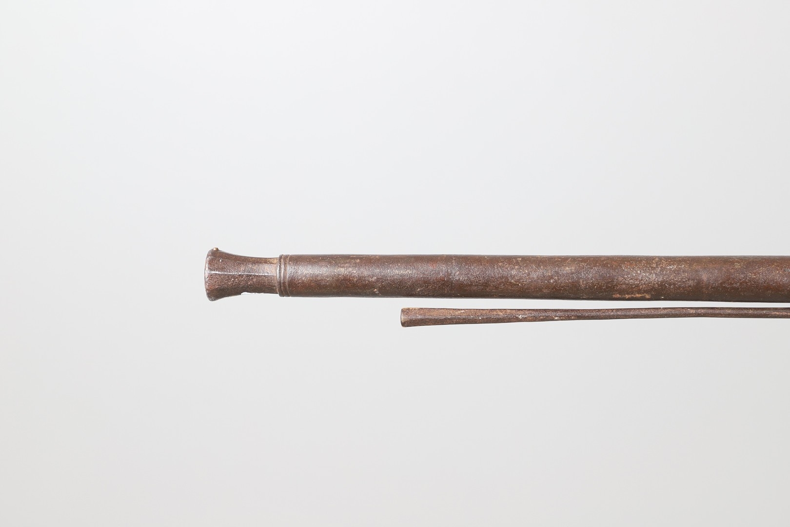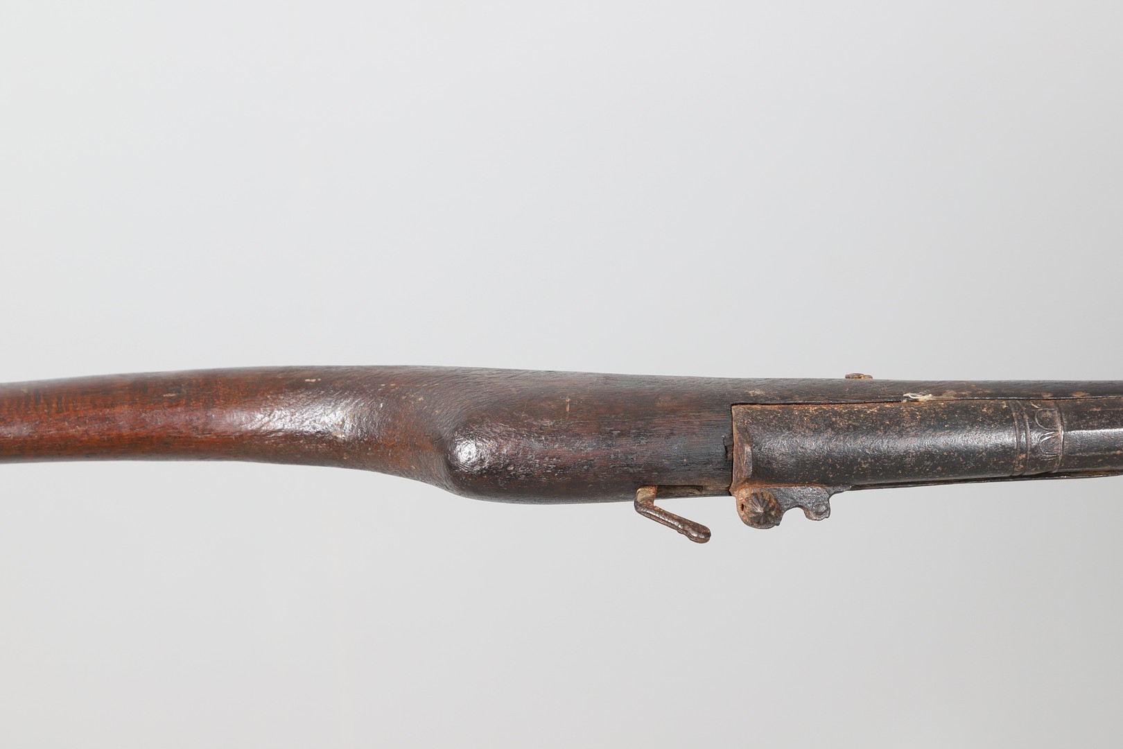 AN AFGHANISTAN JEZAIL MATCHLOCK LONG GUN. The 135 cm tapering barrel, slightly flared at the muzzle with a ram rod below. Fitted with a matchlock action and crooked stock and twin sling mounting points. 175 cm. With an unusual tool fitted beneath one of the metal 'capucine' mounting bands, perhaps a touch-hole prick and a match snuff or loading gauge. "What would seem to be a primitive weapon had a greater and more accurate range than the musket used by the British.".